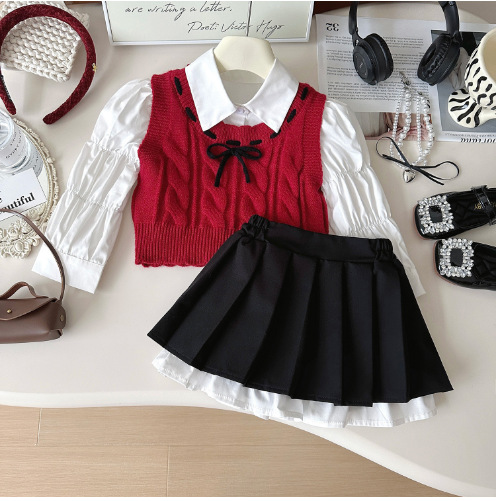 어린이 세트 치마 새 봄과 가을 소녀 기질 대학 스타일 아동복 인형 칼라 셔츠 주름 치마 3 종 세트스토어 가기