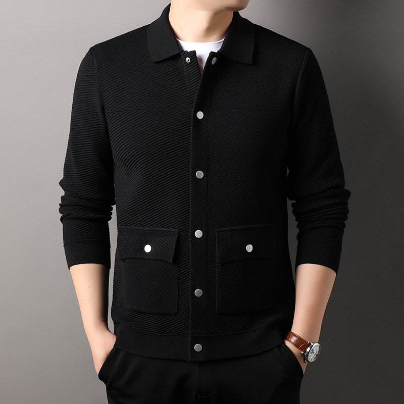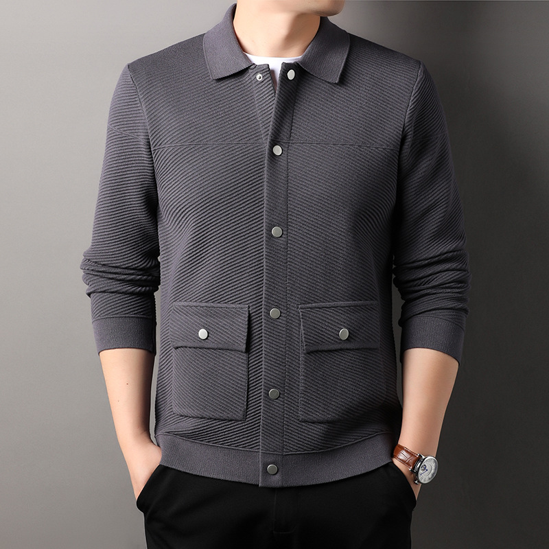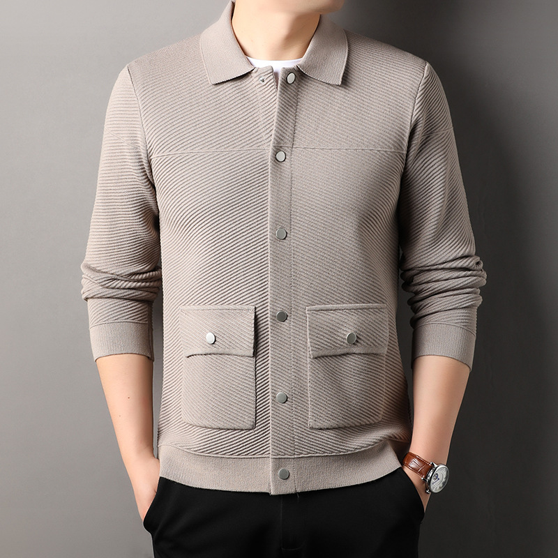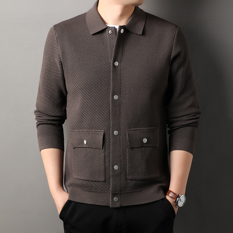 봄, 가을 남성용 카라 니트 가디건, 중년 및 젊은 아버지들을 위한 니트 재킷, 더블 포켓 슬림핏 아우터