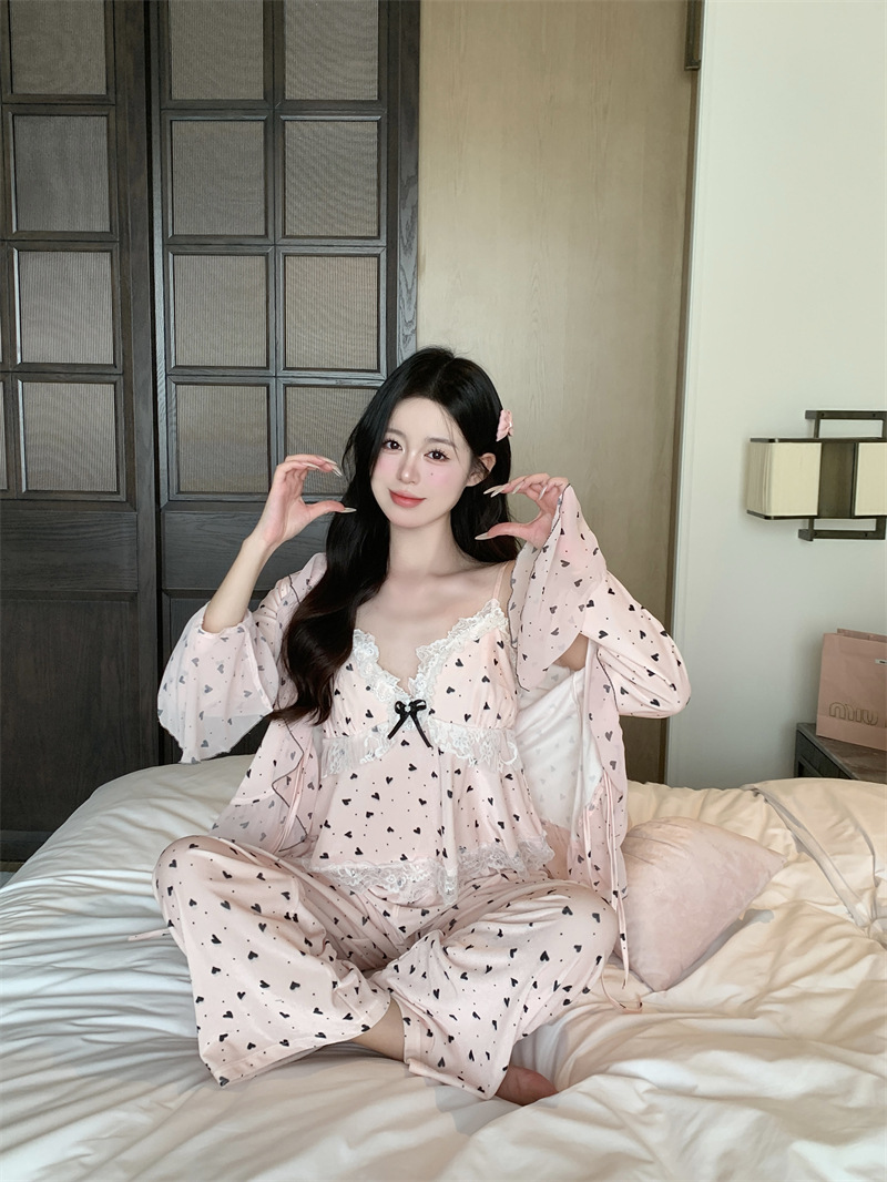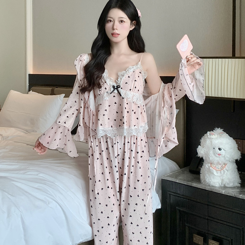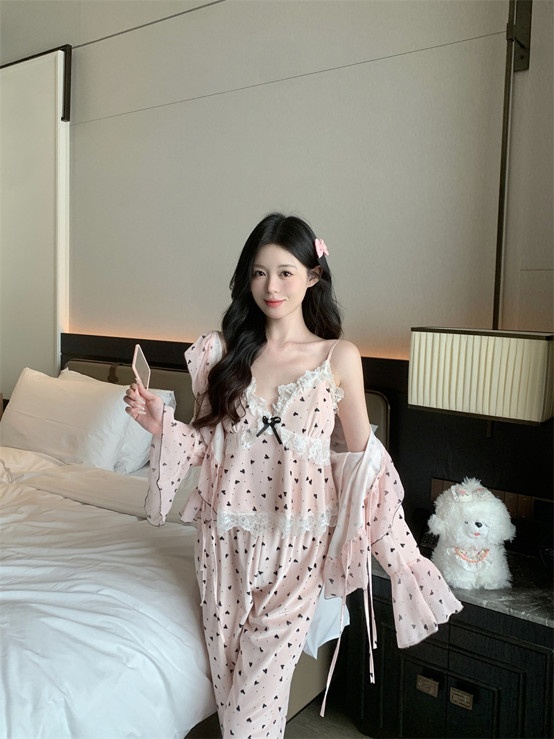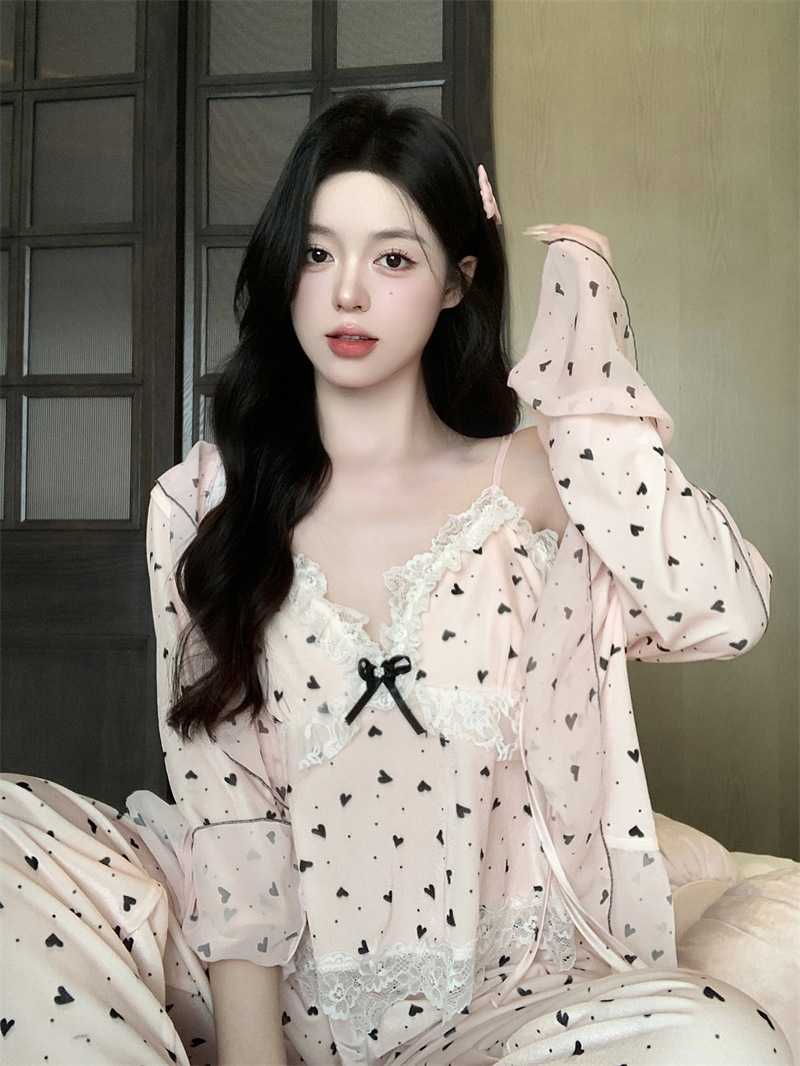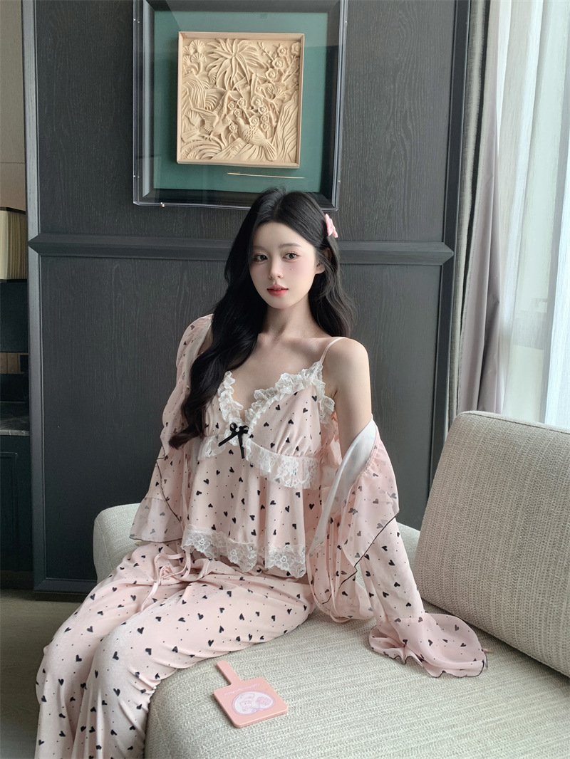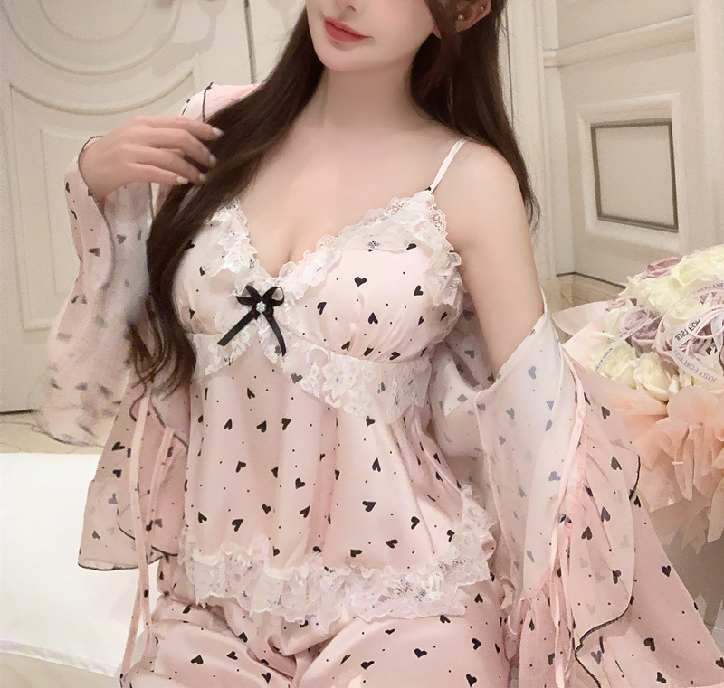 러브 웨이브 포인트 아이스 실크 파자마 여성 세트 섹시한 슬링 슬링 가슴 패드 3 피스 세트 아웃웨어 스위트 홈 의류스토어 가기