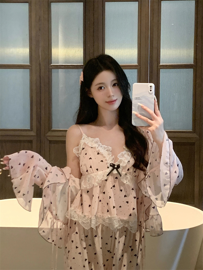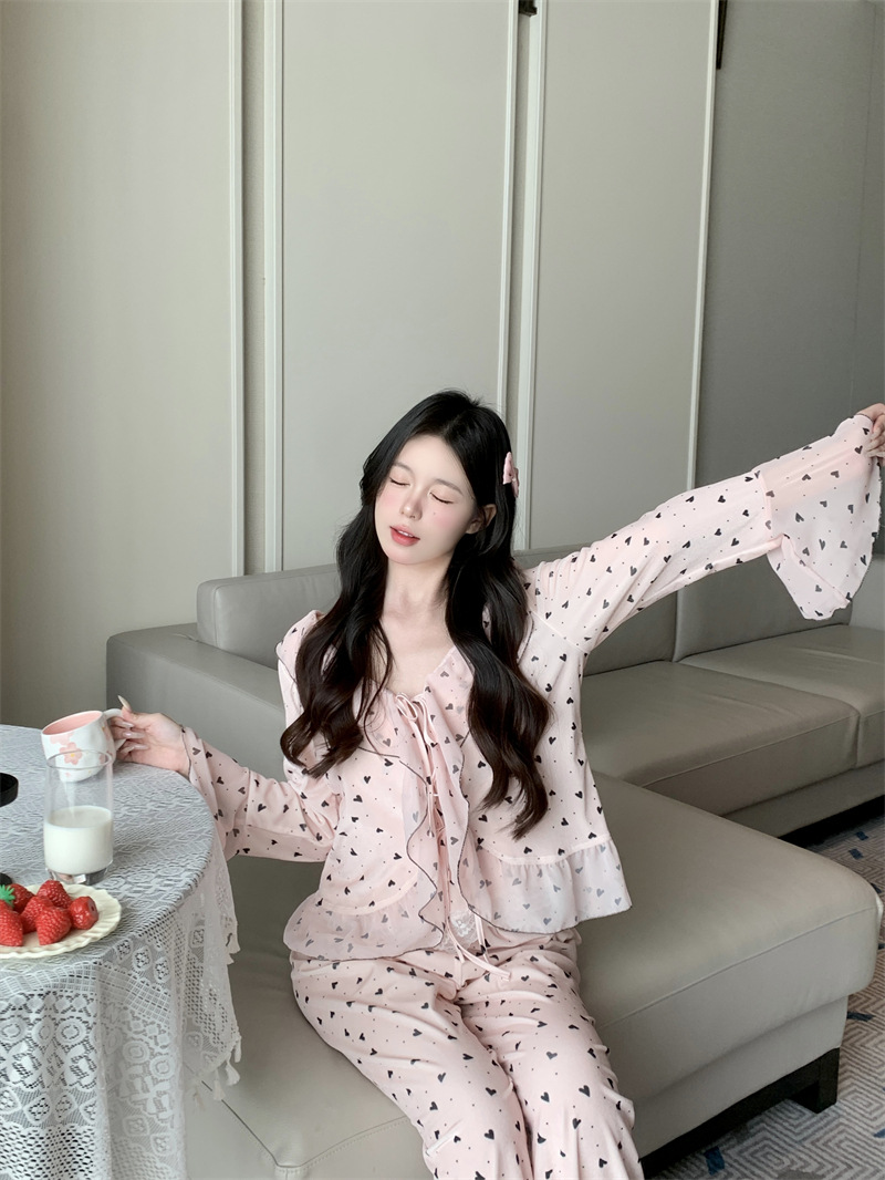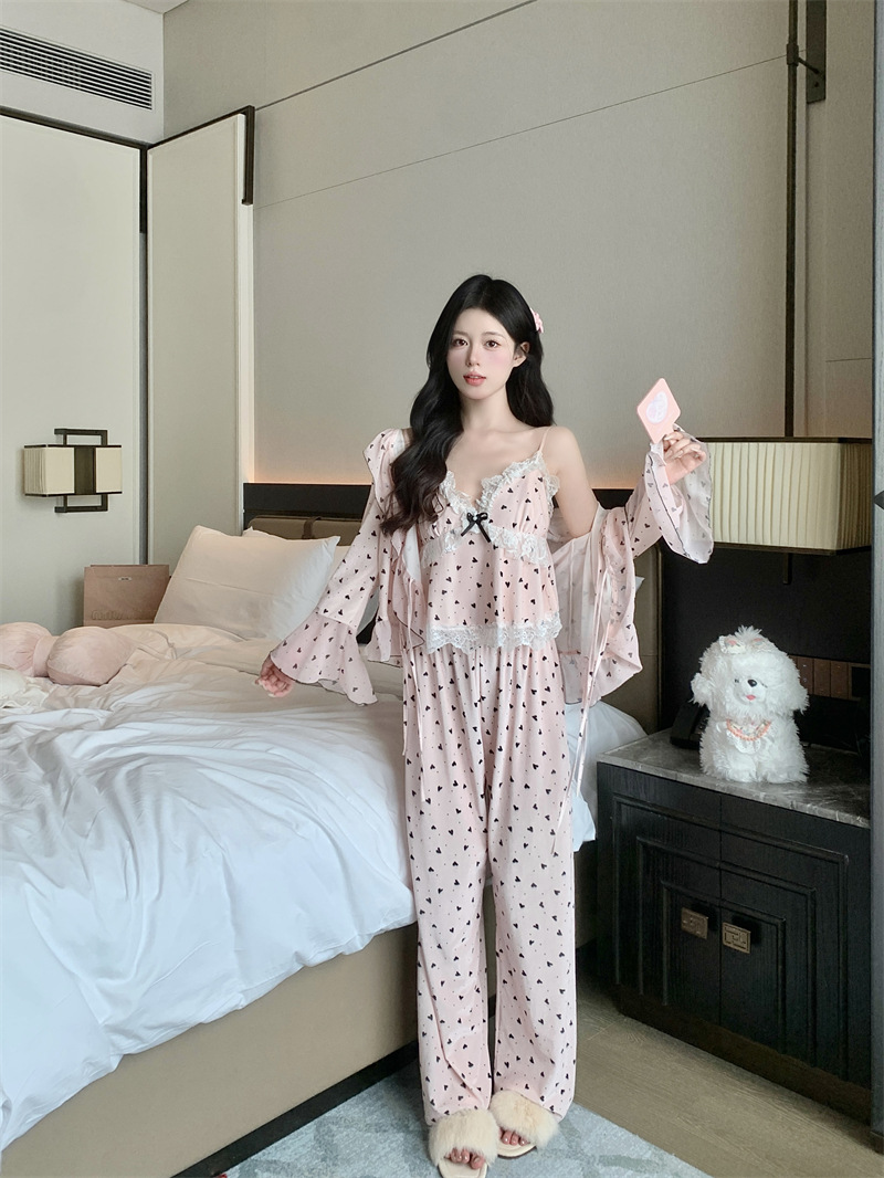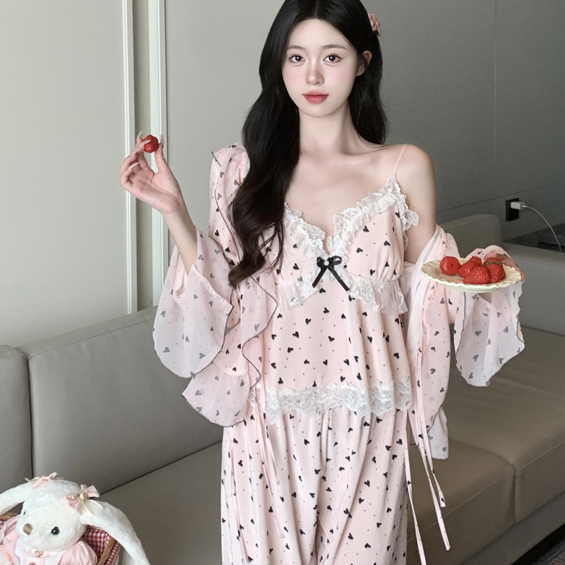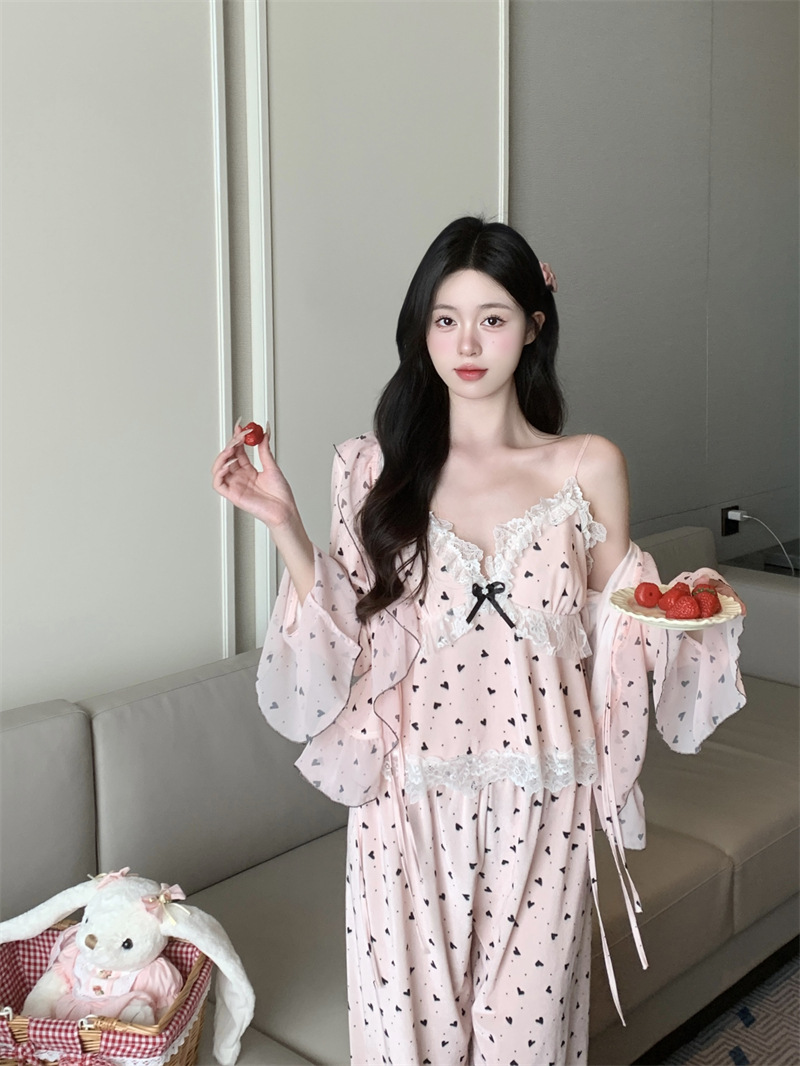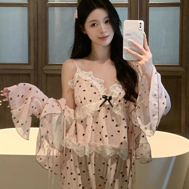 러브 웨이브 포인트 아이스 실크 파자마 여성 세트 섹시한 슬링 슬링 가슴 패드 3 피스 세트 아웃웨어 스위트 홈 의류스토어 가기