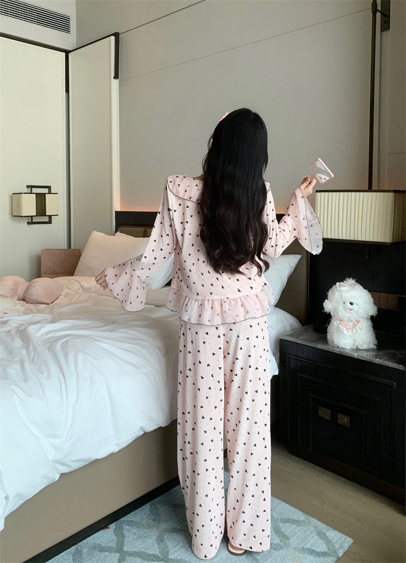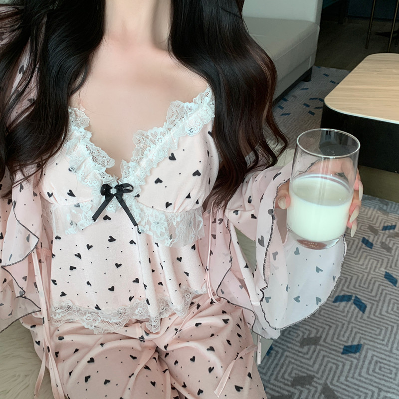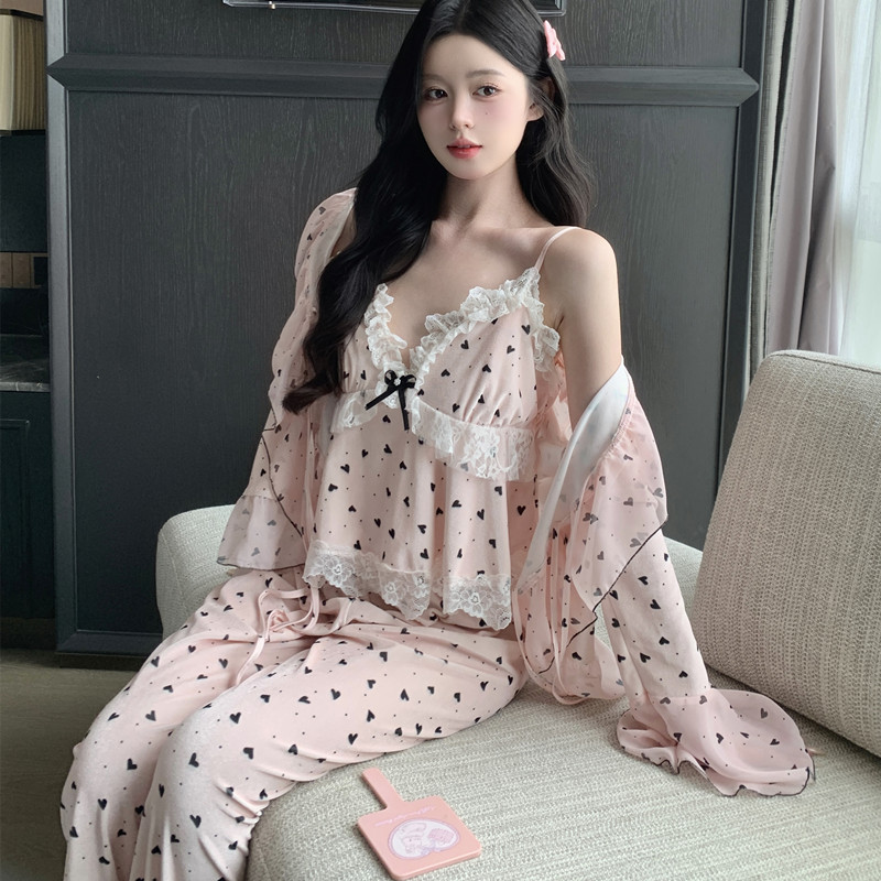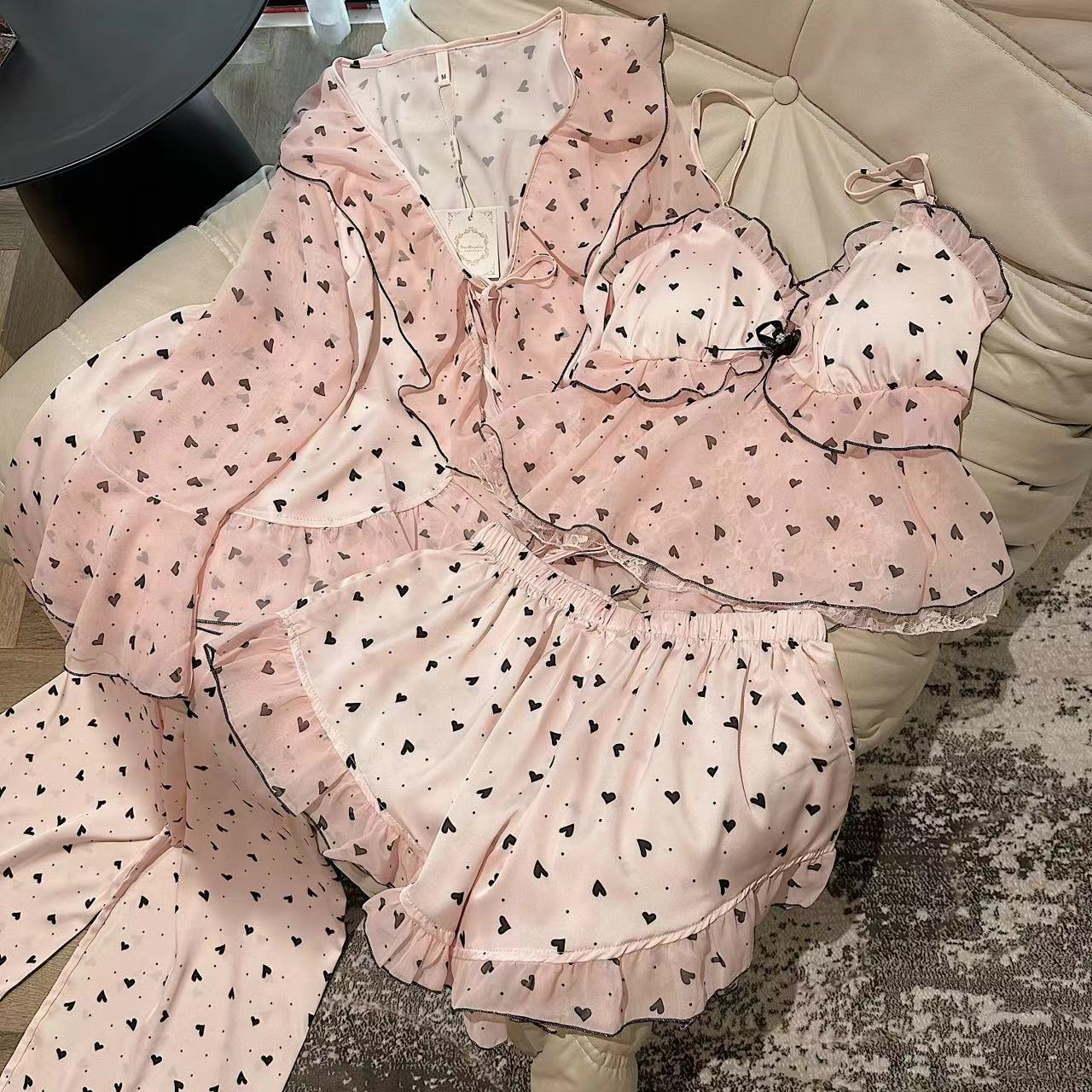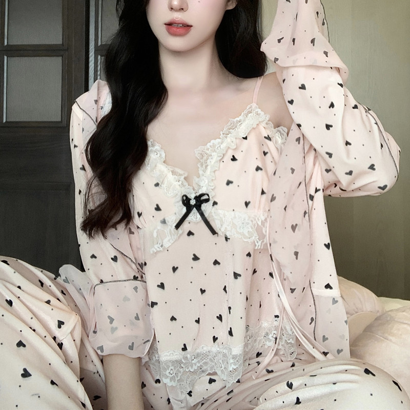 러브 웨이브 포인트 아이스 실크 파자마 여성 세트 섹시한 슬링 슬링 가슴 패드 3 피스 세트 아웃웨어 스위트 홈 의류