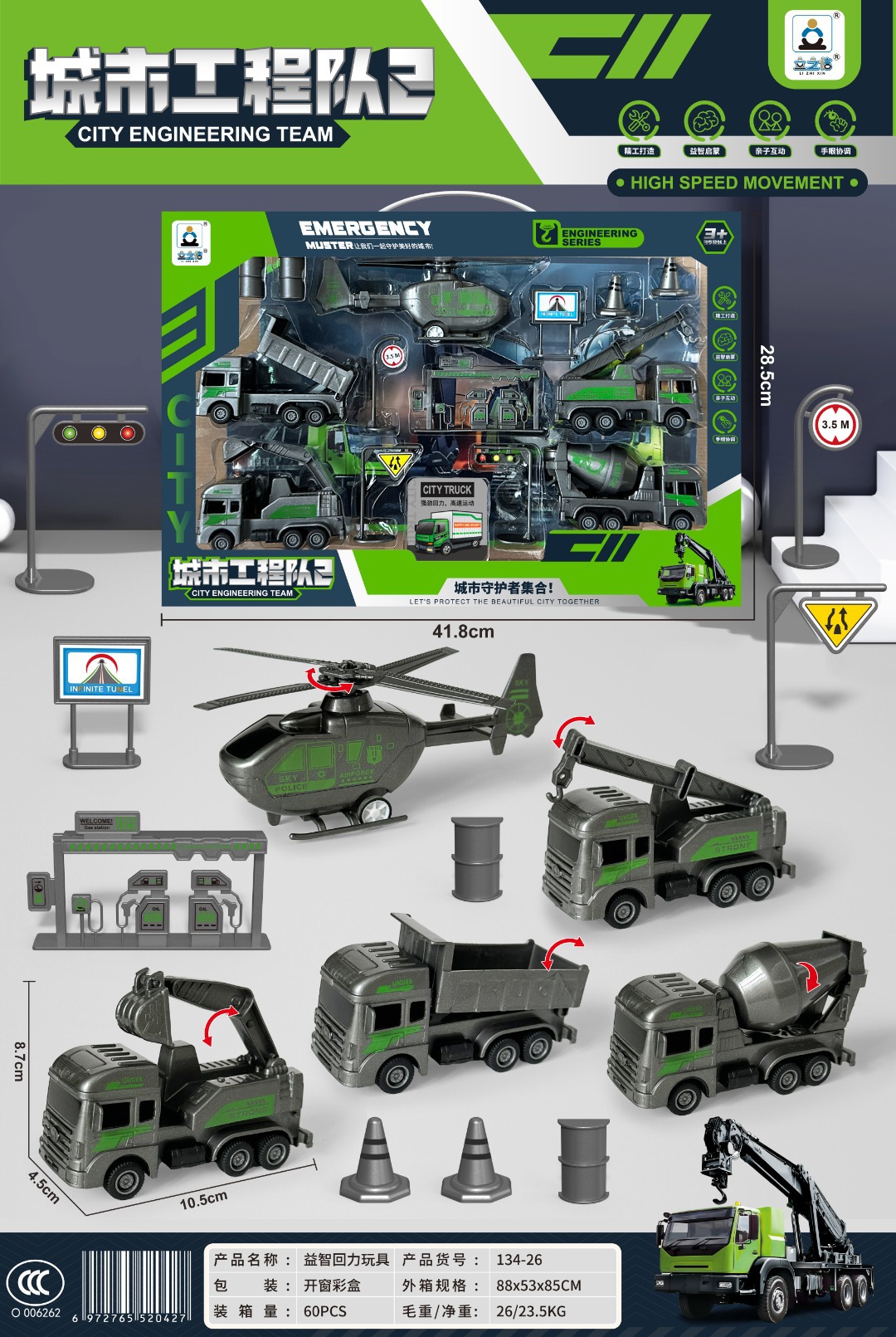Huili City 엔지니어링 팀 어린이 장난감 엔지니어링 트럭 타워 크레인 자동차 세트 선물 상자 조직 소년 선물 도매