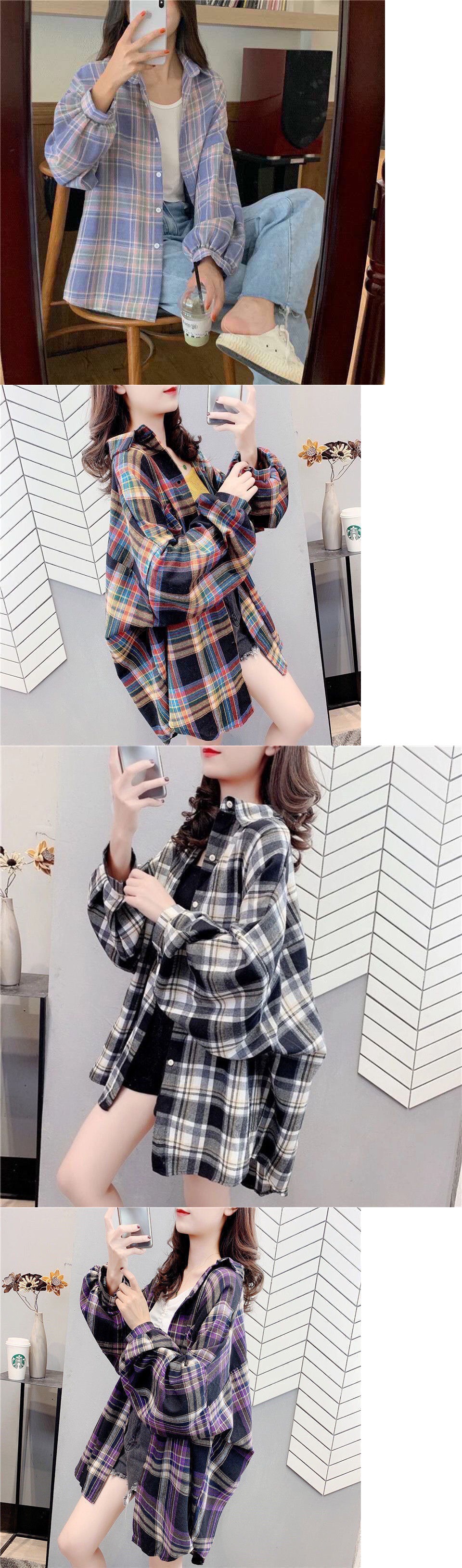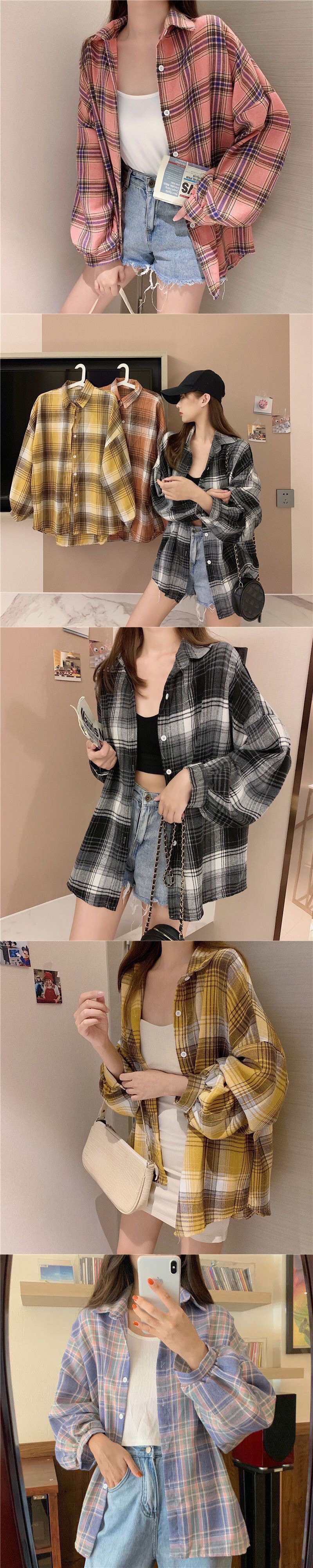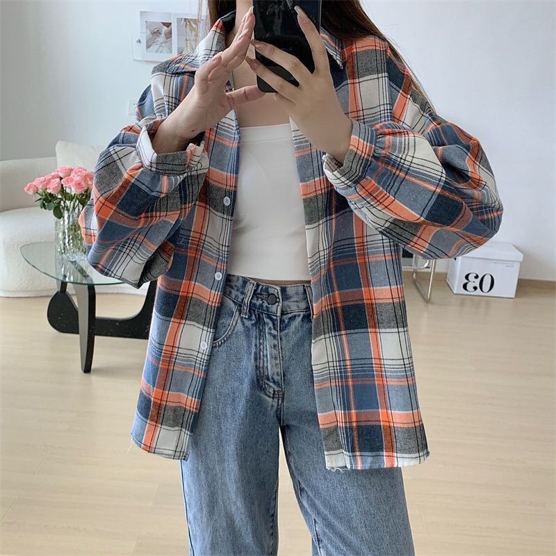 [재고] 레트로 느슨한 한국 격자 무늬 셔츠 여성 셔츠 홍콩 맛 새로운 2024 봄과 가을 긴 소매 디자인 감각스토어 가기