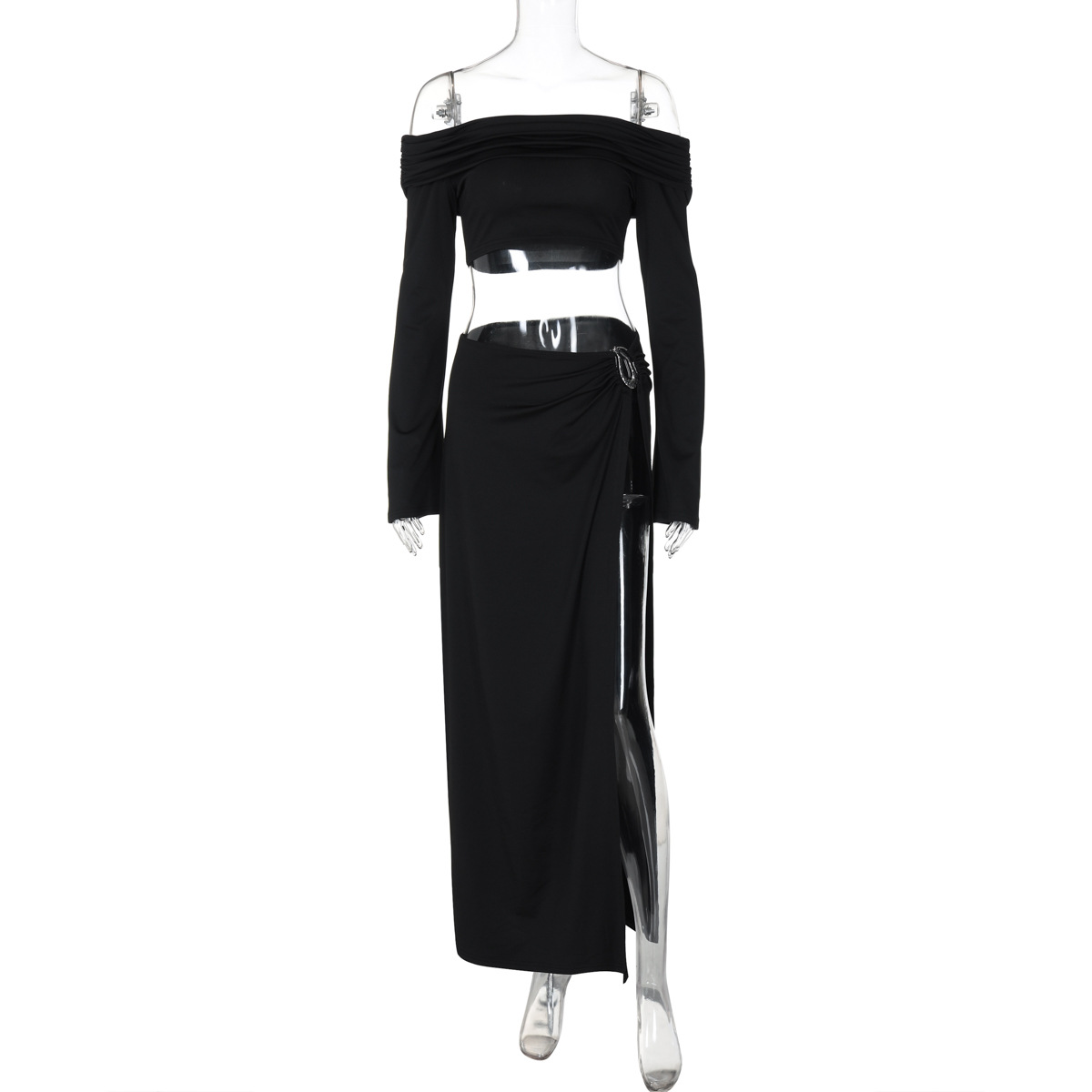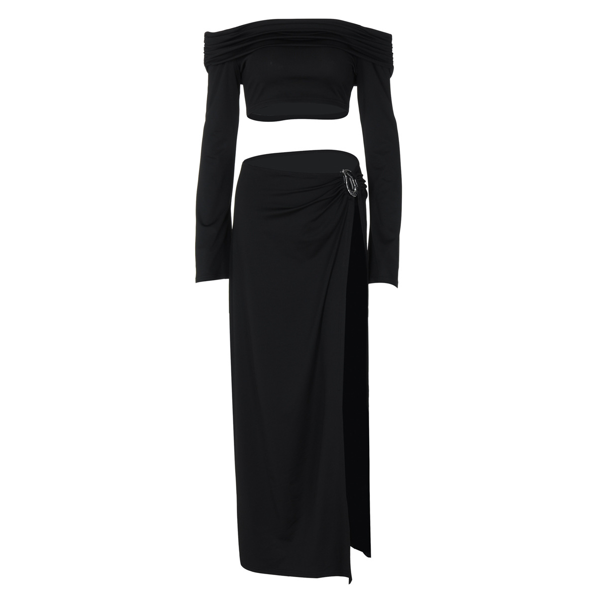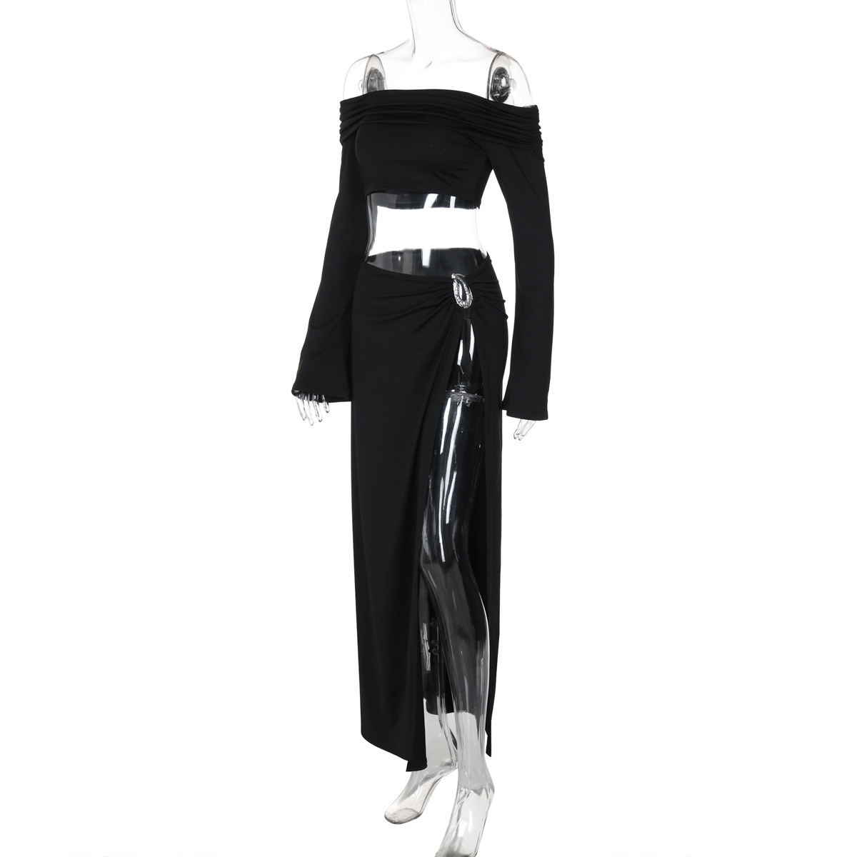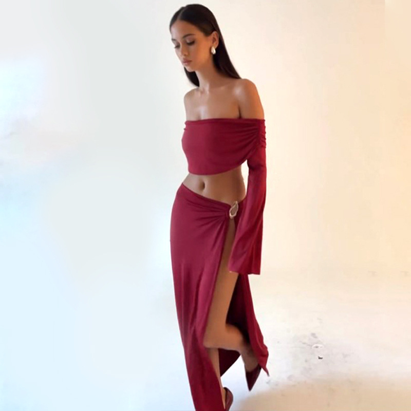 유럽과 미국의 여성복 2025 봄 신작 원라인 칼라 긴팔 가슴 감싸는 섹시한 하이 슬릿 스커트 여성용 투피스 슈트