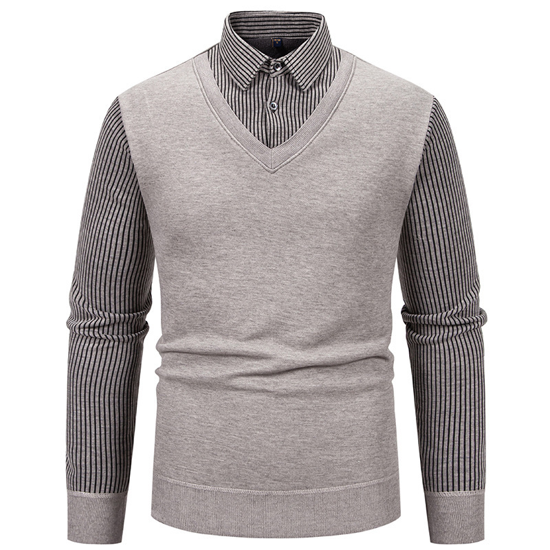 대외 무역 국경 간 가을과 겨울 새로운 남성 긴팔 스웨터 가짜 투피스 패션 기모 스트라이프 셔츠 풀오버 스웨터