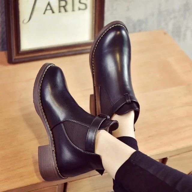 첼시 가을과 겨울 새로운 평면 두꺼운 힐 발목 부츠 여성 유행 가죽 싱글 레이어 부츠 올 매치 키 패션 여성 신발 트렌디 신발