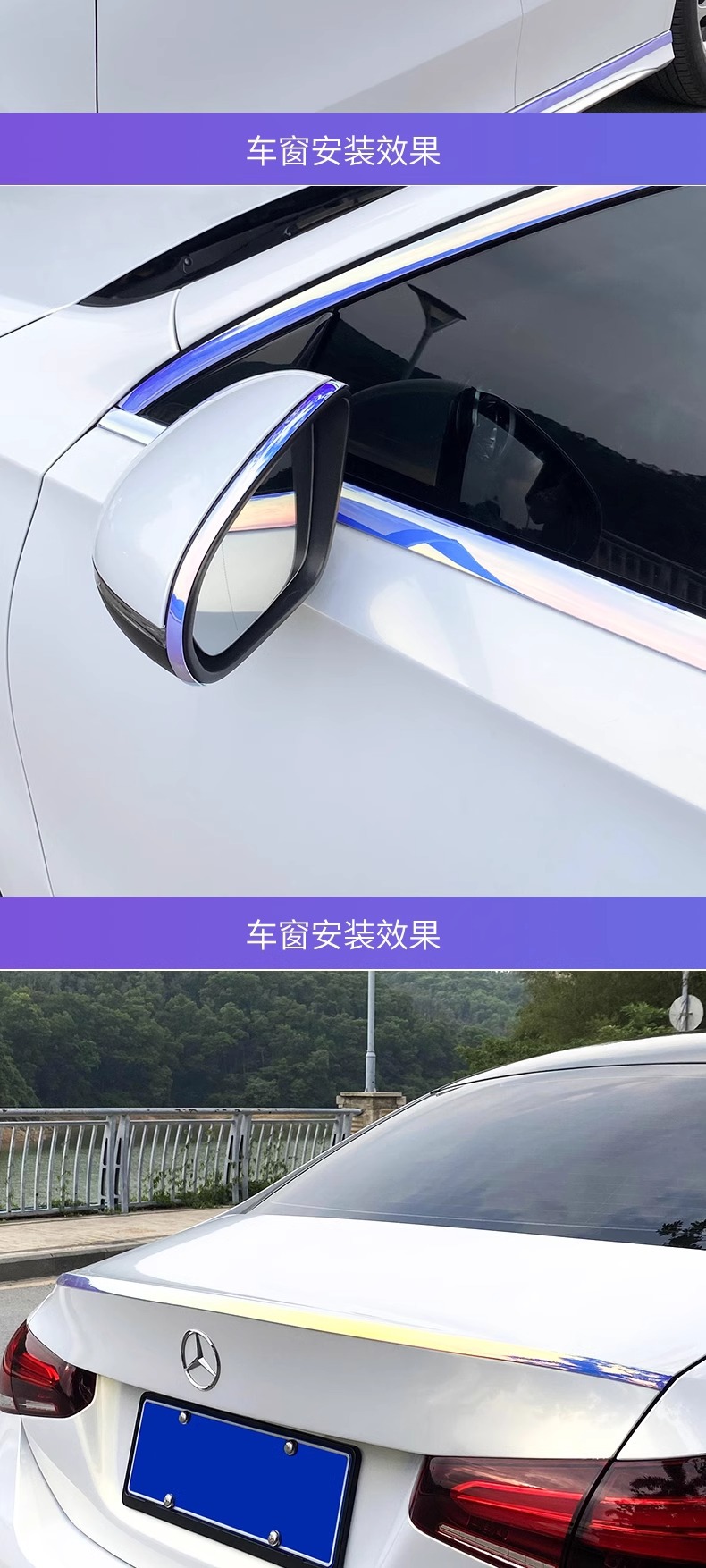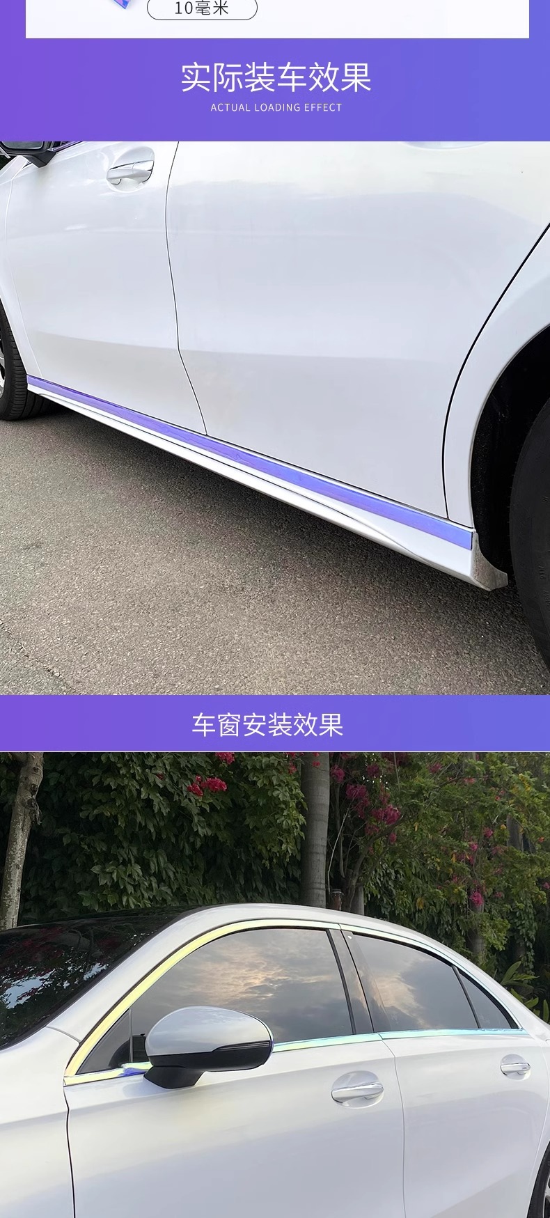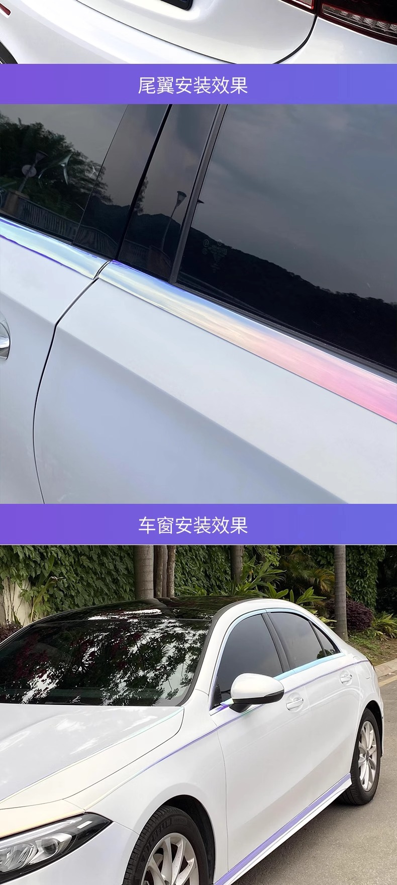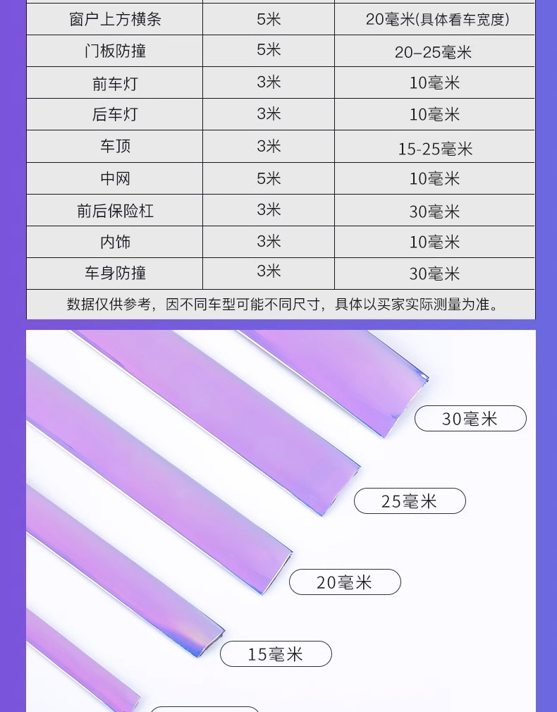 商品使用贴位参考: 后视反光镜、车身顶棚、车窗胶条、车门、车门下裙边前后保险杠大包围(又可以做防擦条)、后窗窗边。