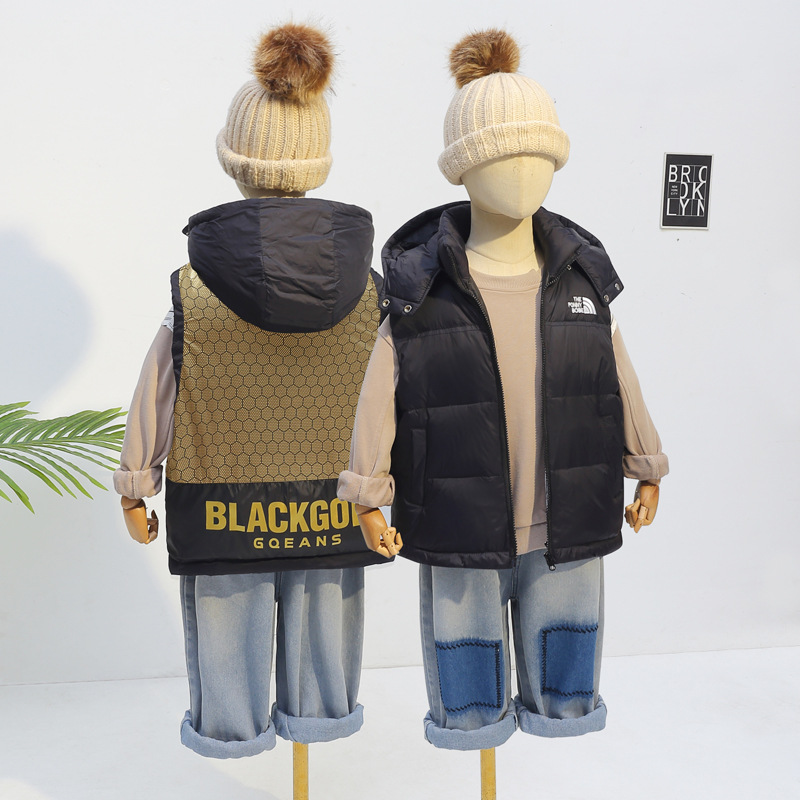 어린이 블랙 골드 그래 핀 조끼 2024 새로운 두꺼운 후드 소년과 소녀 가을, 겨울 깃털 실크 블랙 골드 조끼스토어 가기