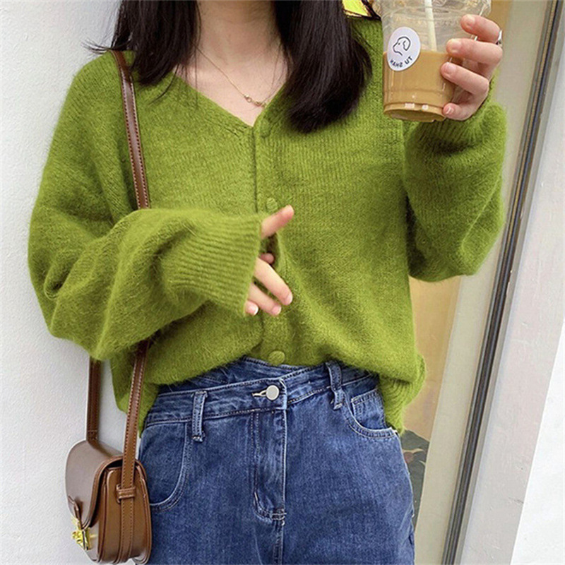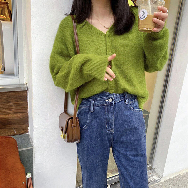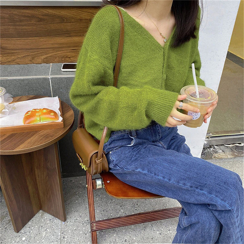 그린 스웨터 여성 2024 가을 새로운 게으른 레트로 소프트 왁스 V 넥 스웨터 코트 여성용 스몰 탑스토어 가기