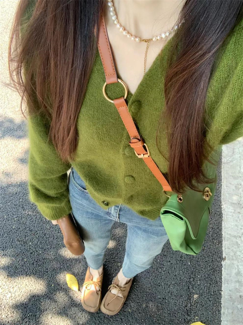 绿色毛衣女2023秋季新款慵懒复古软糯V领针织衫外套女小个子上衣