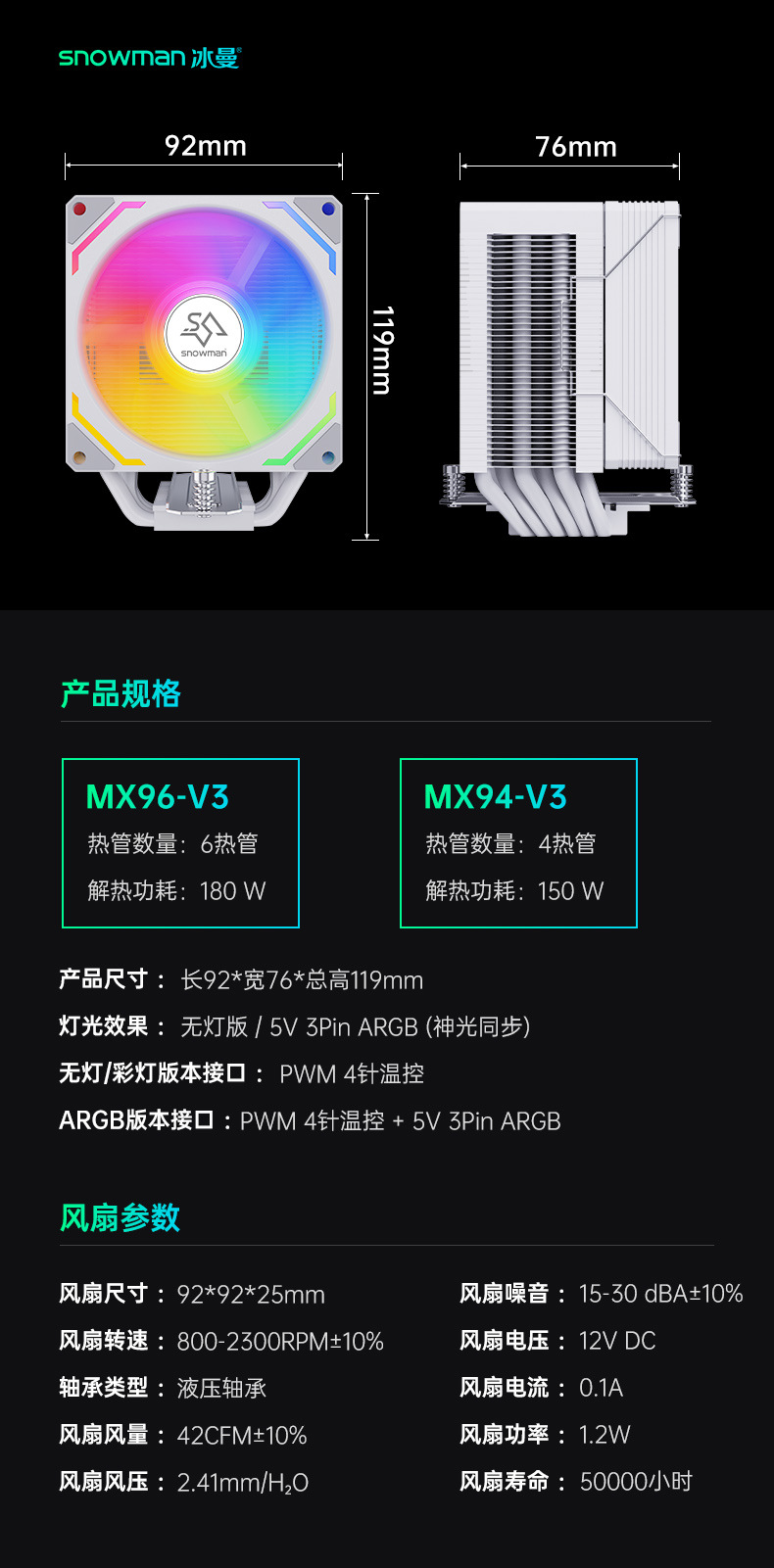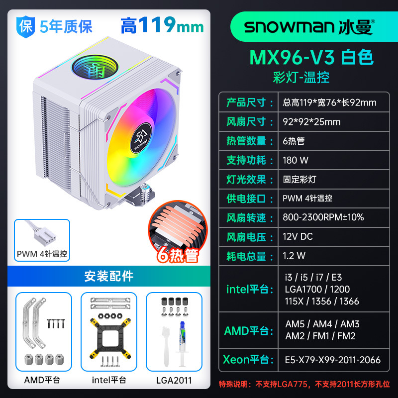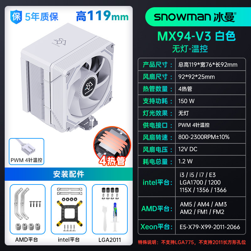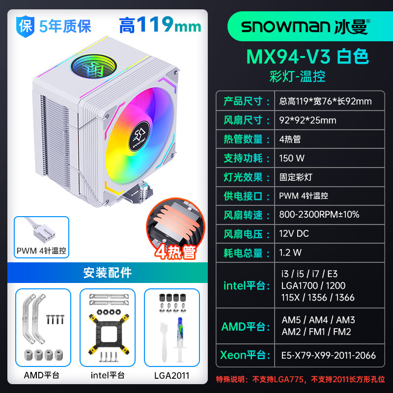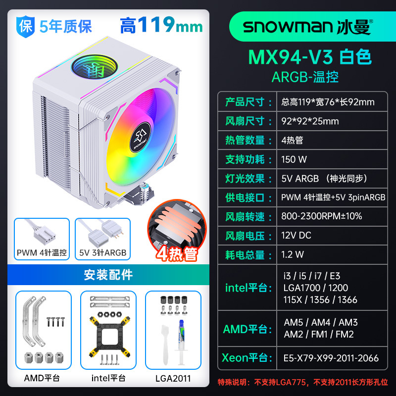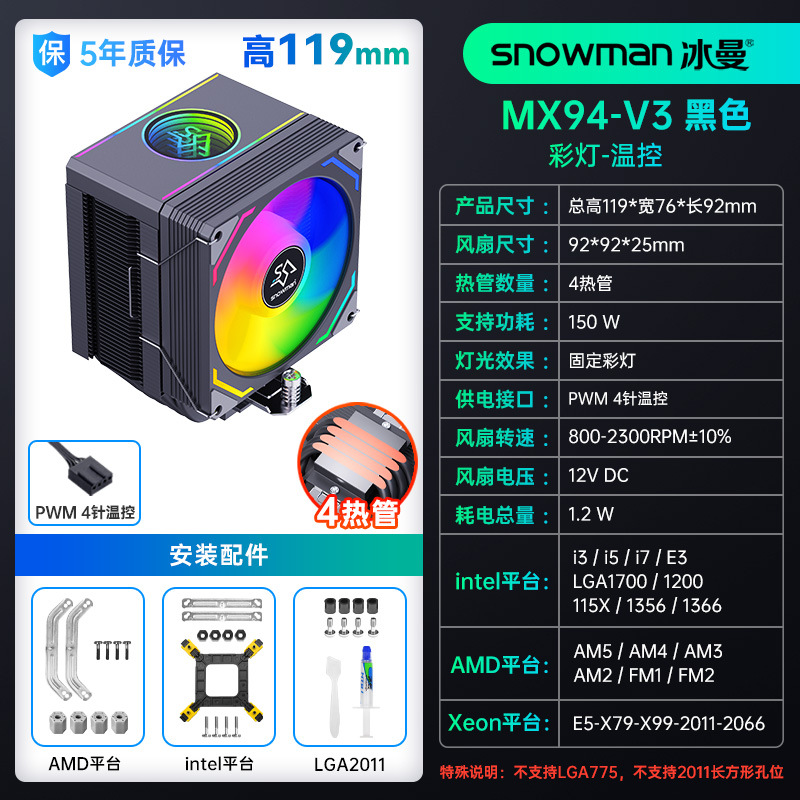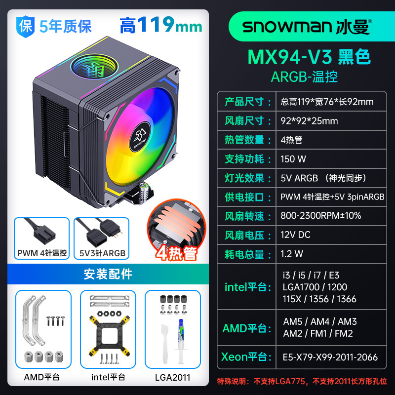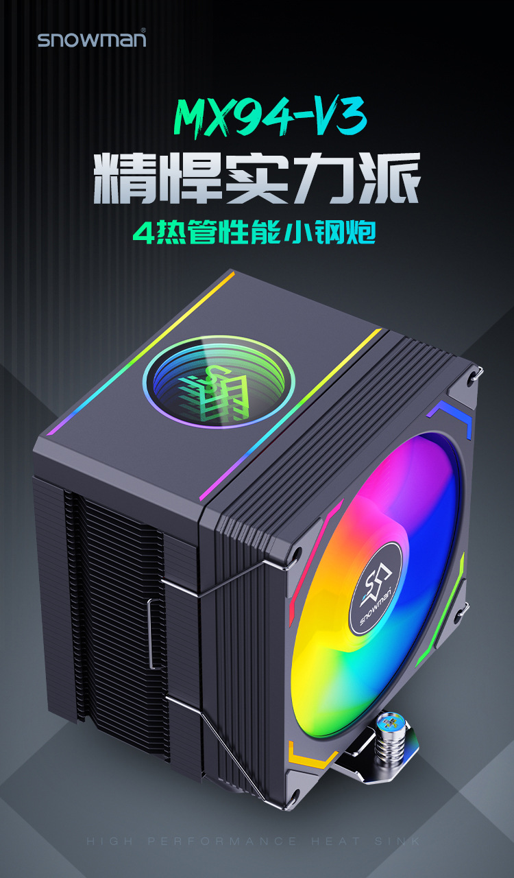 OEM/ODM 맞춤형 SNOWMAN MX94 멀티 플랫폼 범용 4 히트 파이프 CPU 라디에이터 컴퓨터 팬
