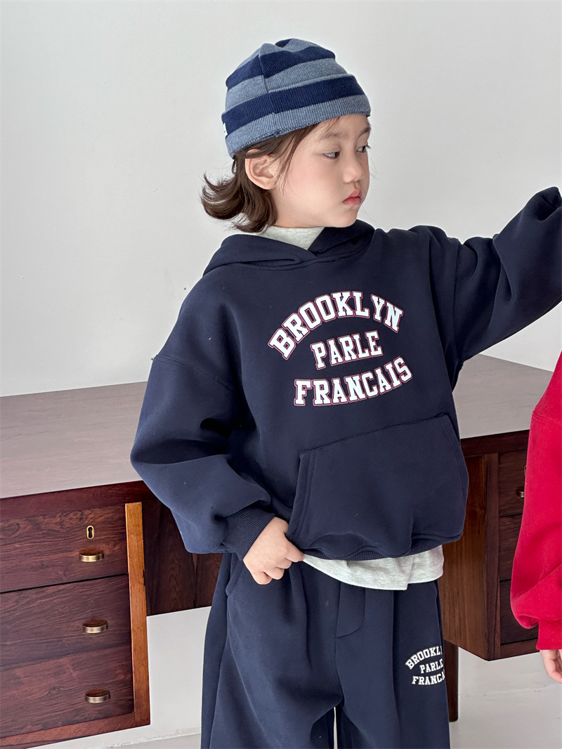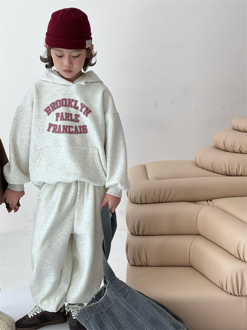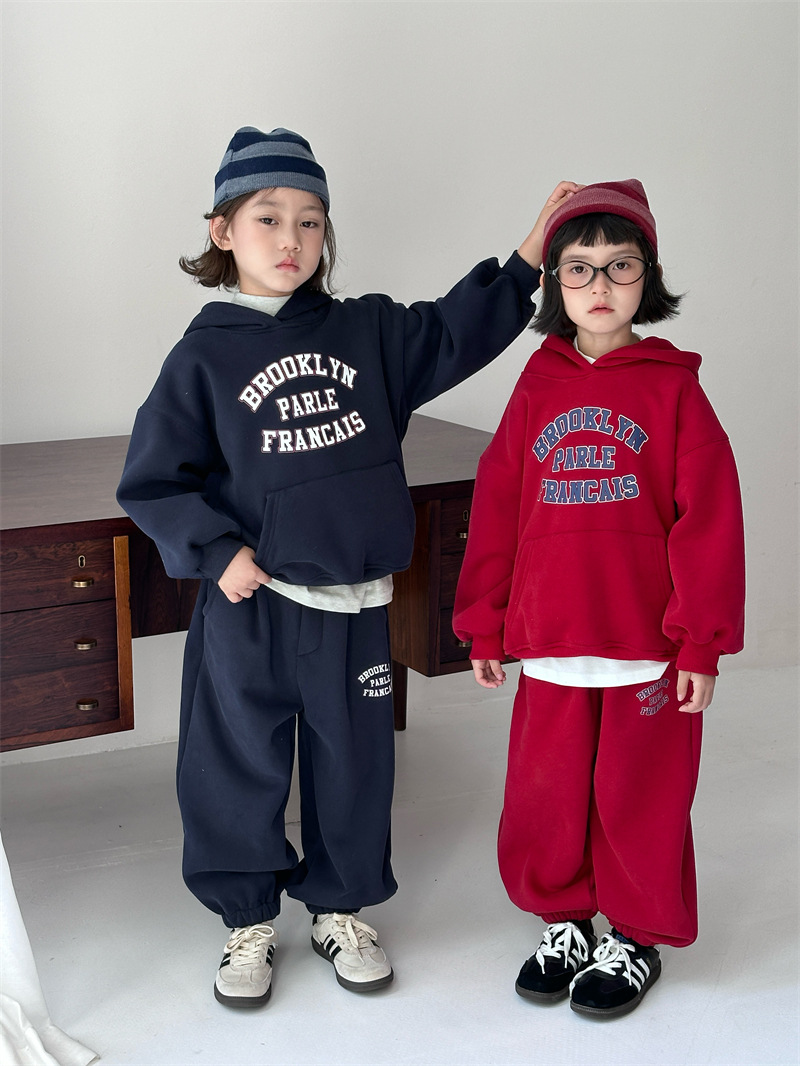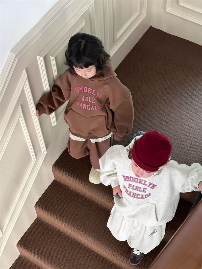 2025 겨울 신상 한국 스타일 아동용 플리스 레터링 세트 남녀공용 후드 풀오버 캐주얼 투피스 세트 트렌디스토어 가기