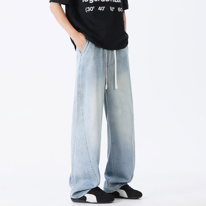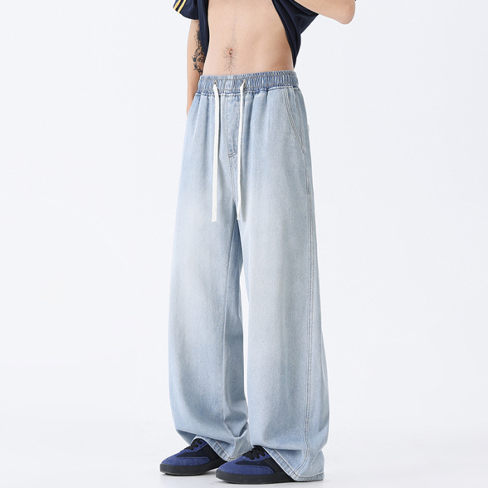 샹구 남성복 2026 봄 얇은 미국 스타일 데님 팬츠 남성 하이 스트리트 트렌드 워싱 처리된 신축성 허리 스트레이트 팬츠스토어 가기