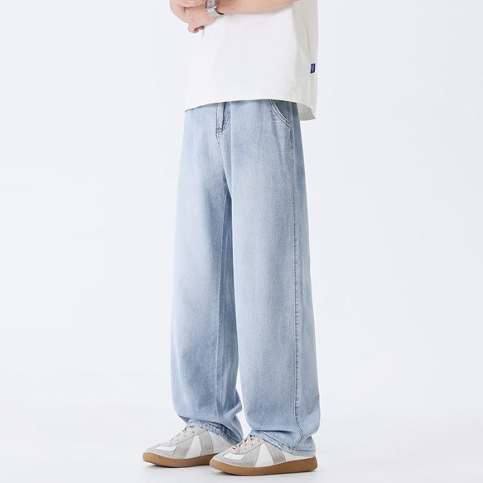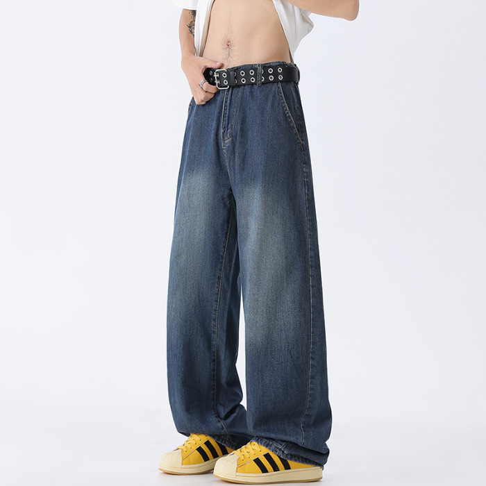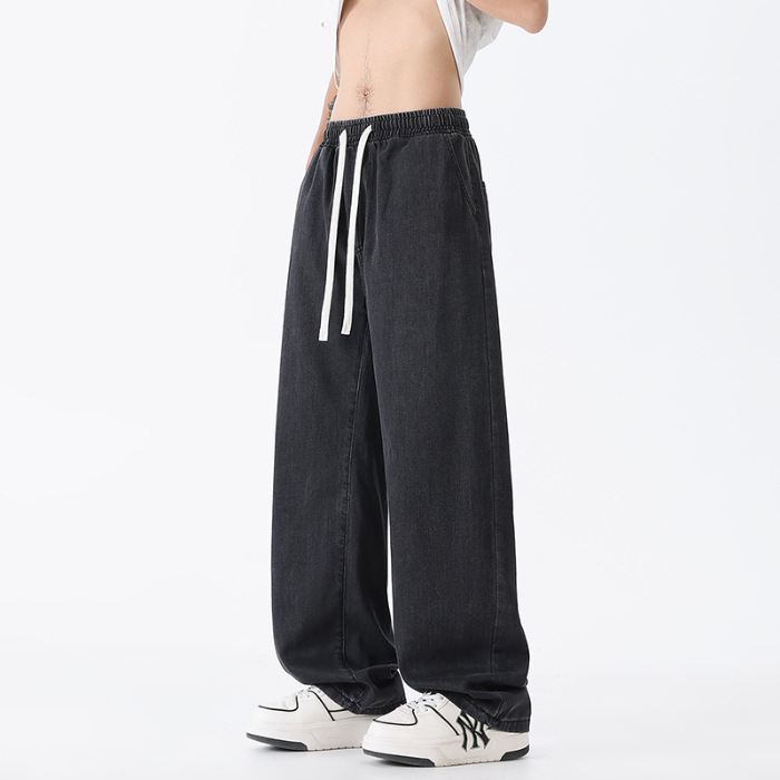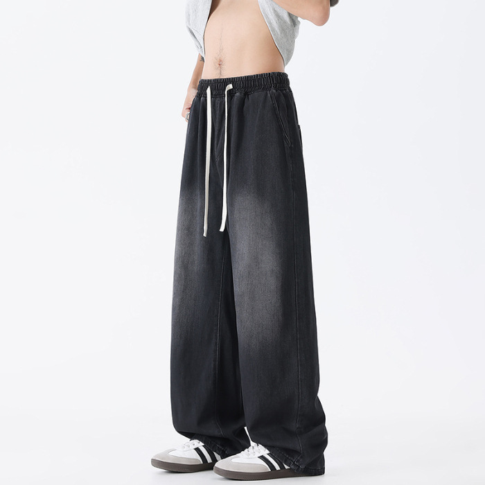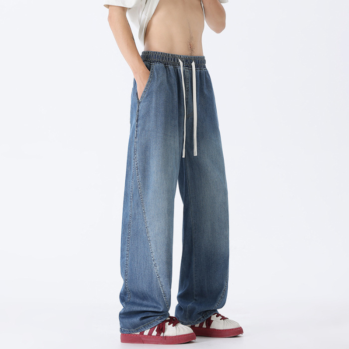 샹구 남성복 2026 봄 얇은 미국 스타일 데님 팬츠 남성 하이 스트리트 트렌드 워싱 처리된 신축성 허리 스트레이트 팬츠
