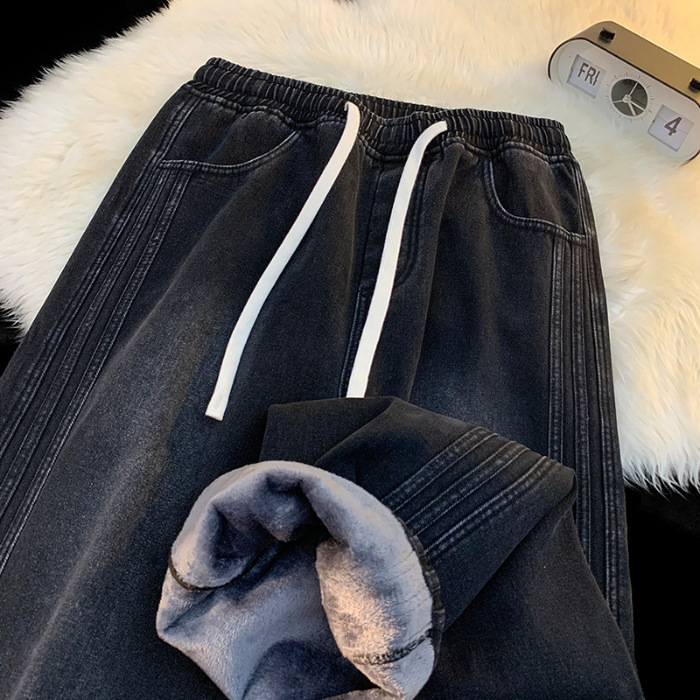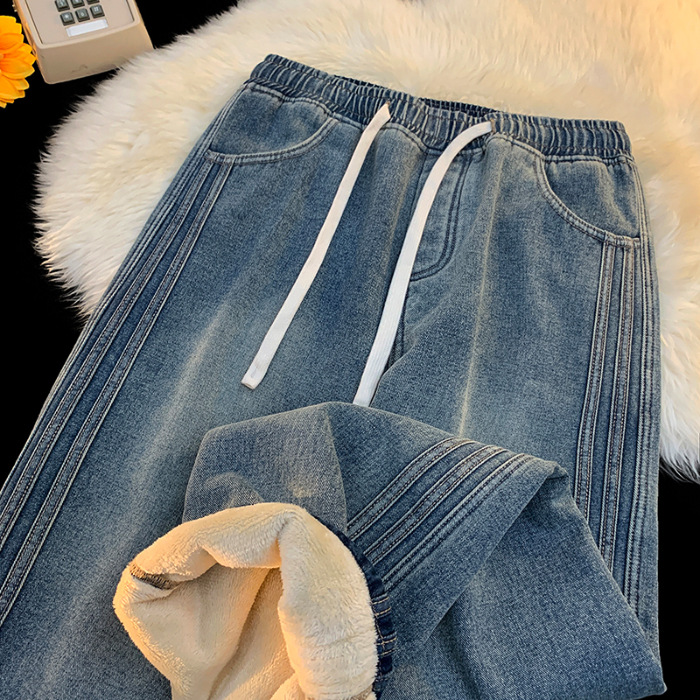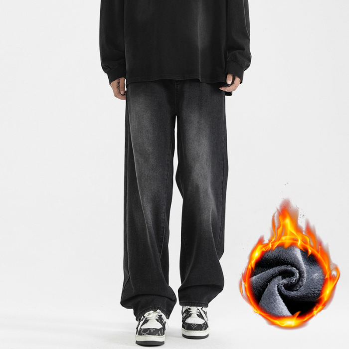 상구 남성복 2025 가을 기모 아메리칸 스타일 청바지 남성 하이 스트리트 트렌디 빈티지 스타일 신축성 있는 허리 스트레이트 팬츠 남성용
