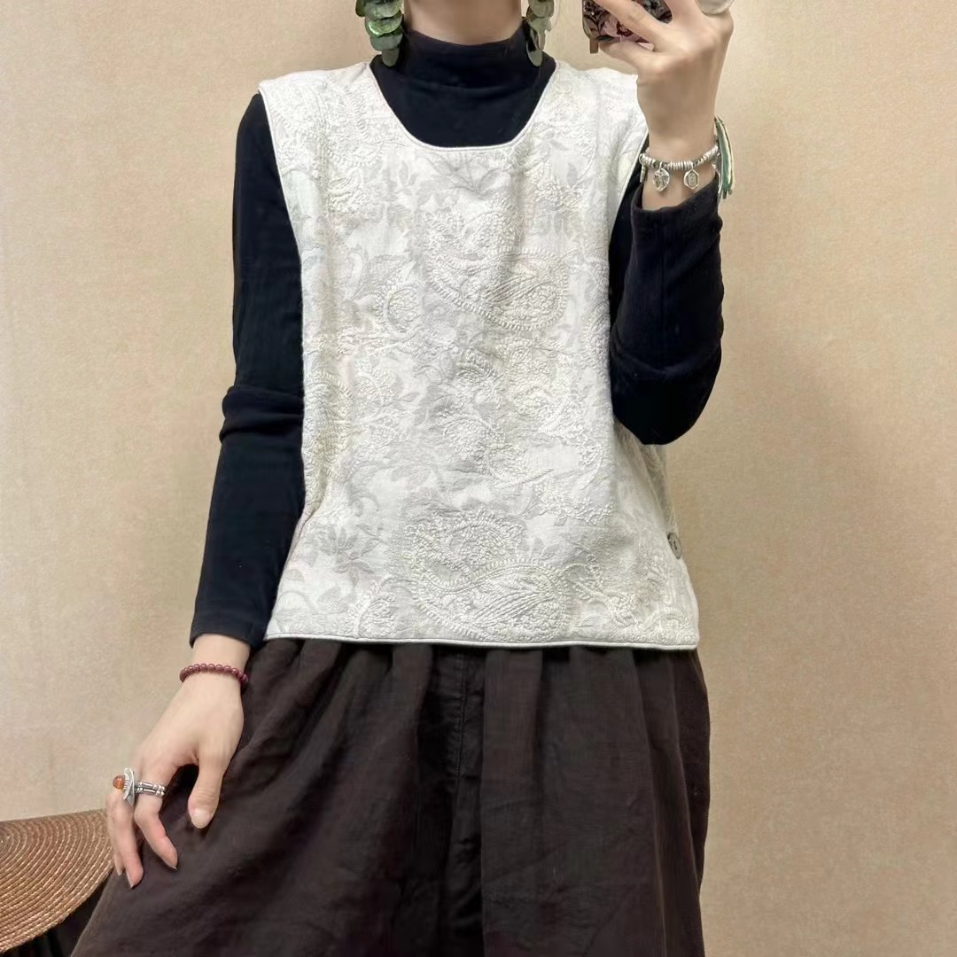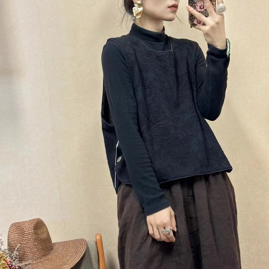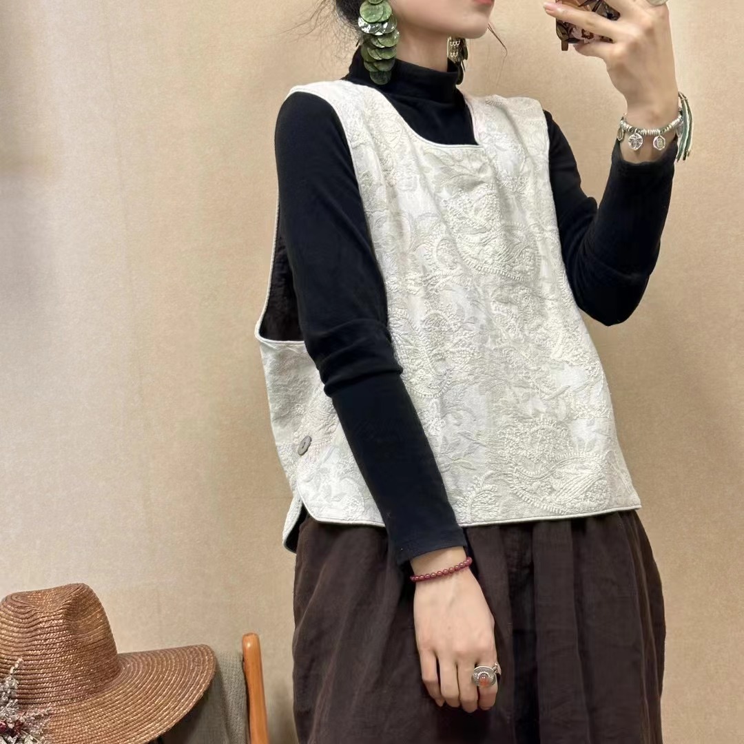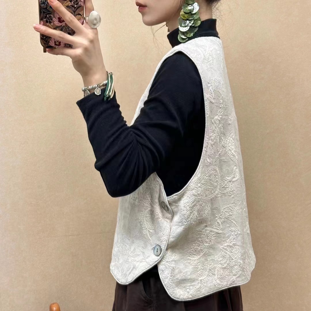 가을 2024 Guofeng 아트 느슨한 중공업 자수 높은 세트 리넨 솔리드 컬러 올 매치 레트로 스타일 틈새 말 클립 여성스토어 가기