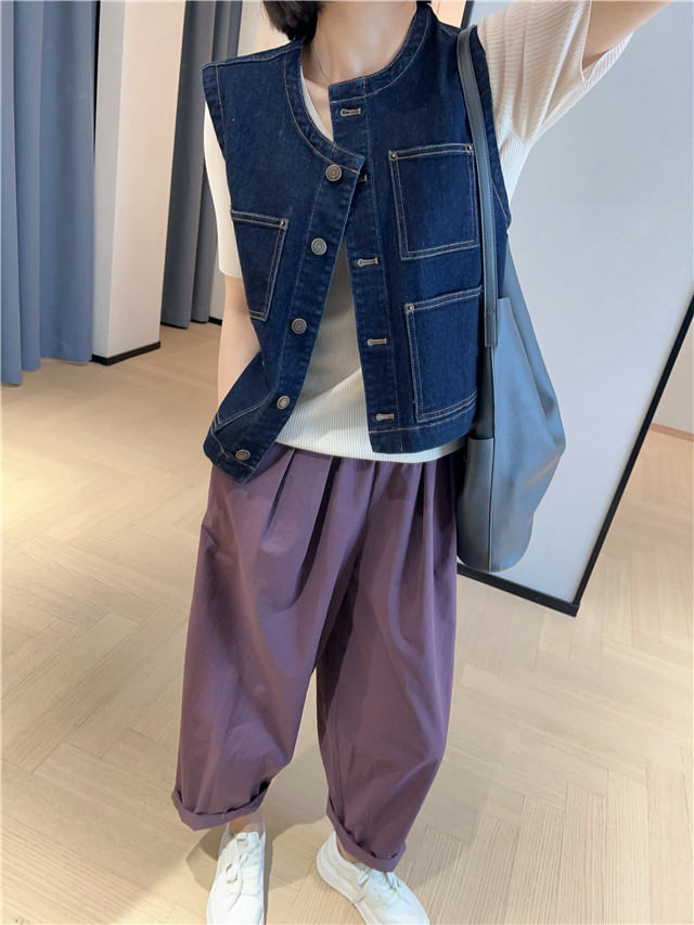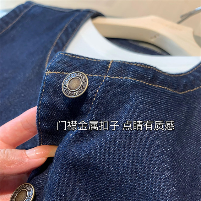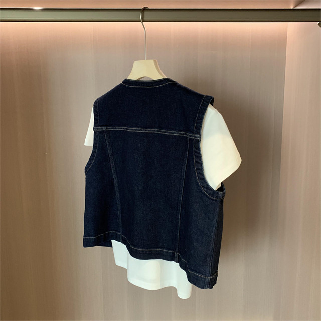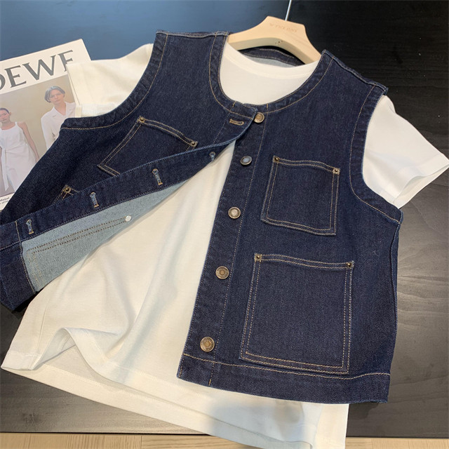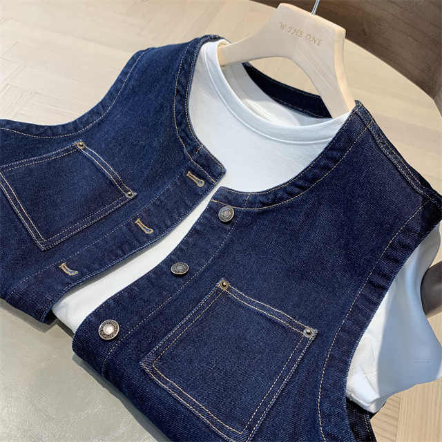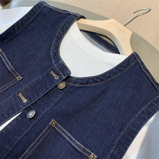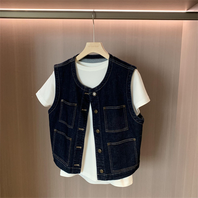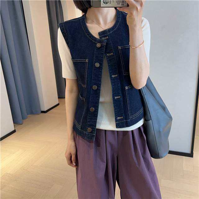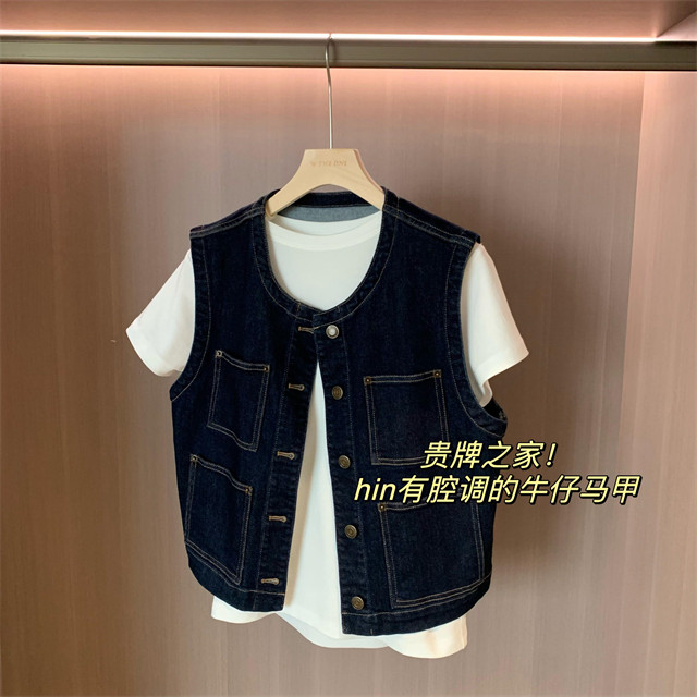 봄은 늦은 유행 레트로 다크 블루 라운드 넥 쇼트 데님 조끼 여성을위한 올 매치 민소매 조끼 자켓이 아닙니다.스토어 가기