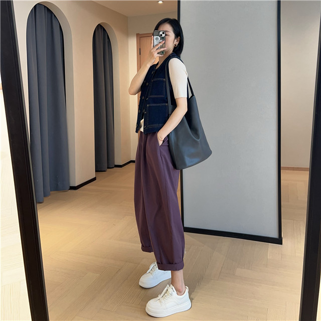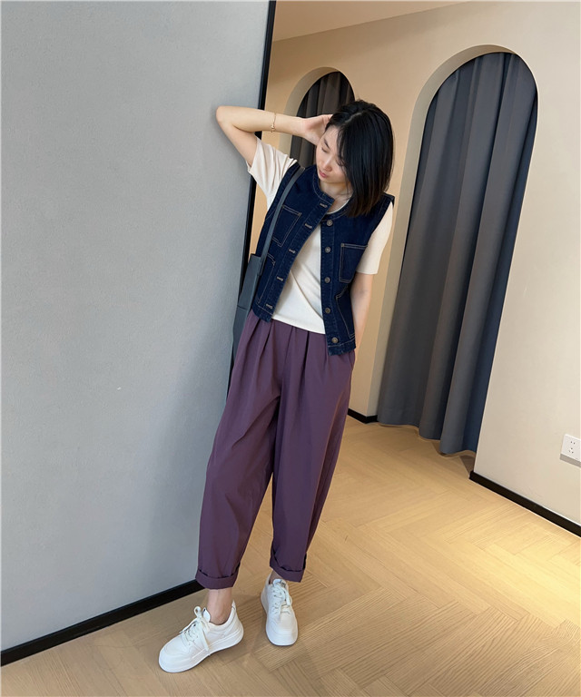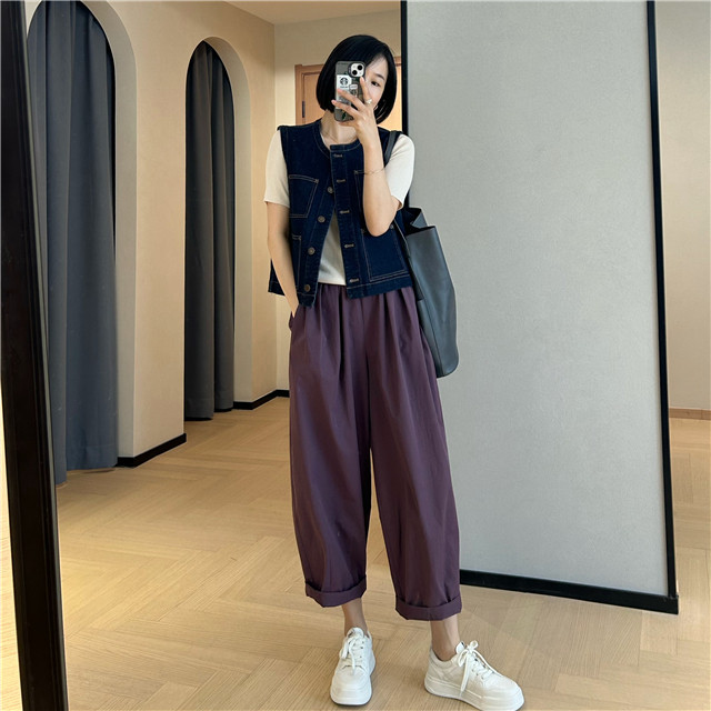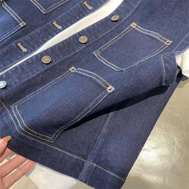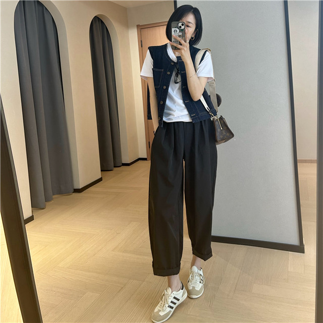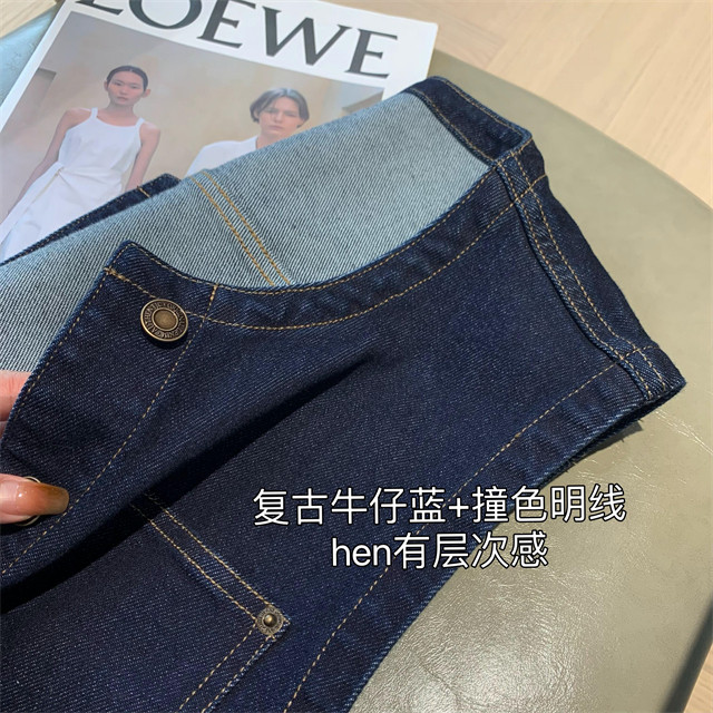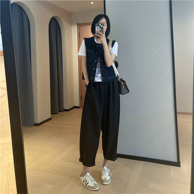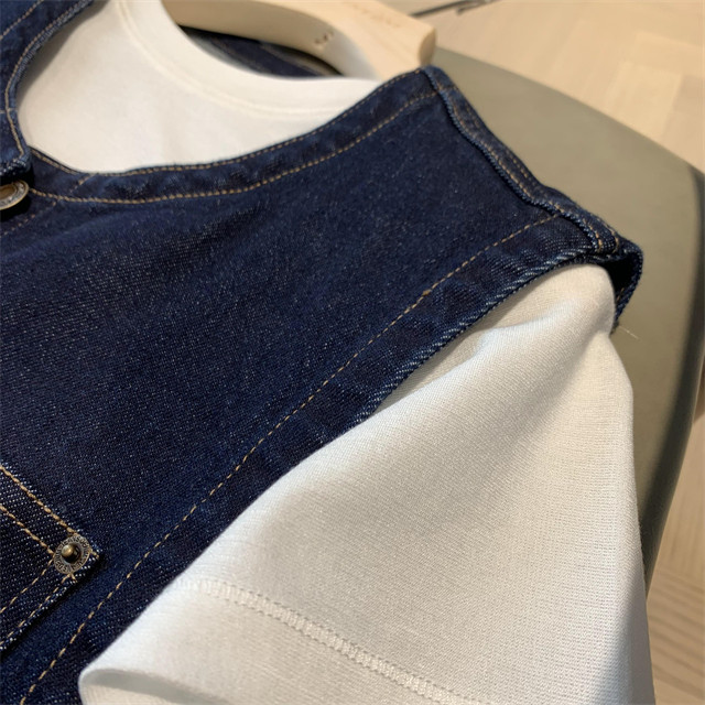 봄은 늦은 유행 레트로 다크 블루 라운드 넥 쇼트 데님 조끼 여성을위한 올 매치 민소매 조끼 자켓이 아닙니다.스토어 가기