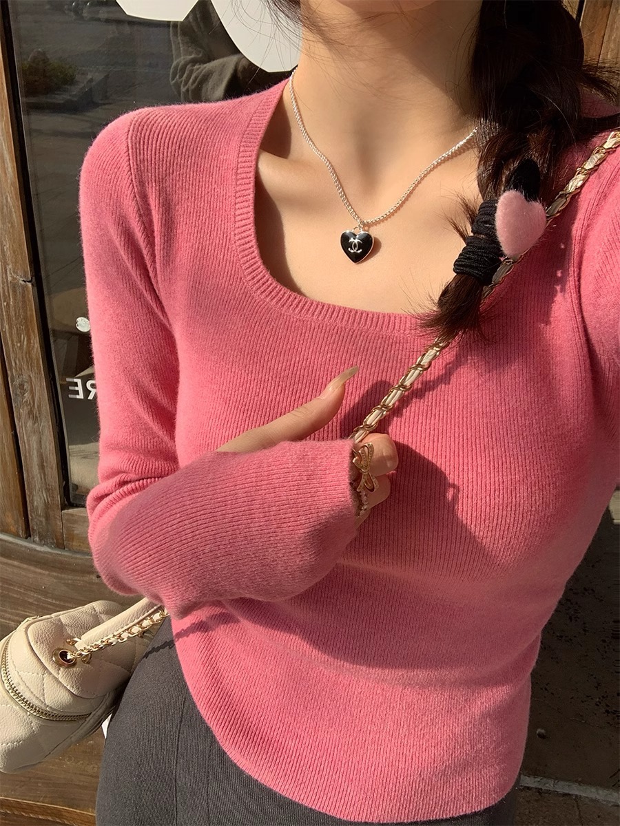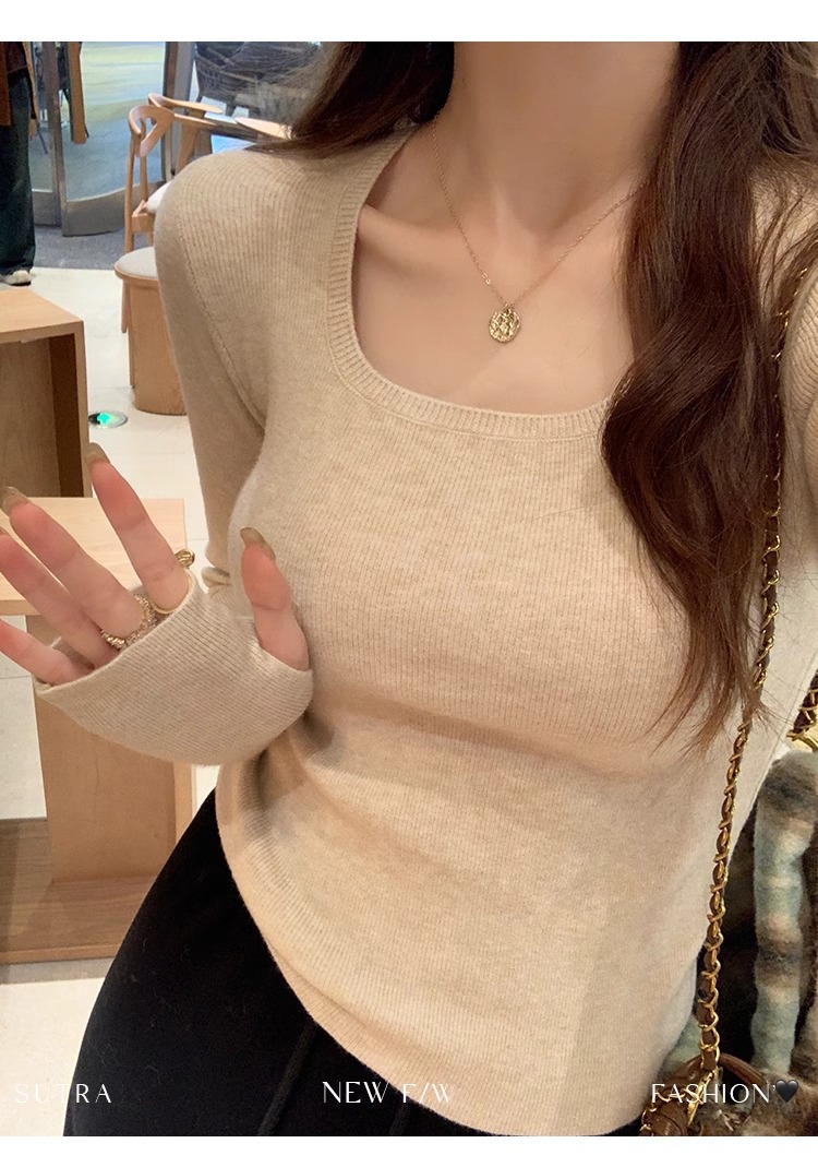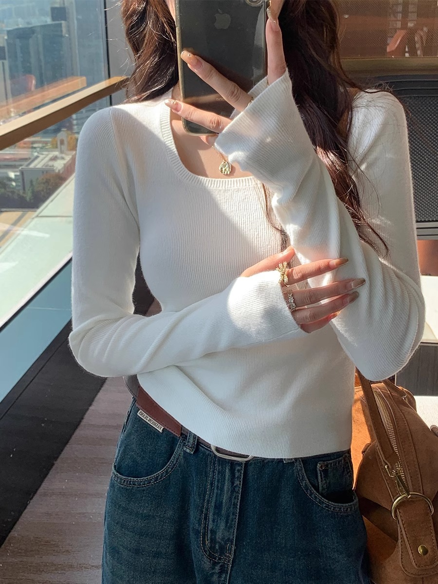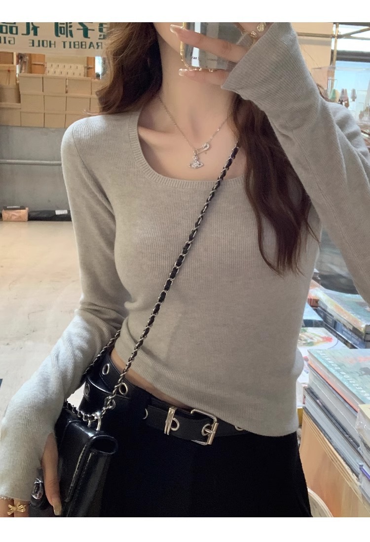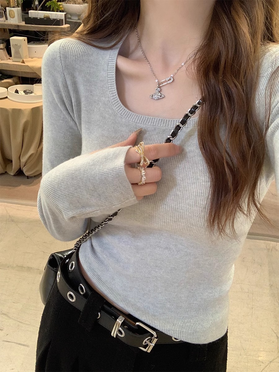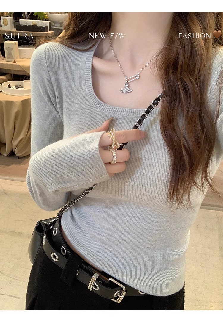 낮은 칼라 보토밍 셔츠 여성의 2024 년 새로운 봄과 가을 회색 스웨터 슬림 핏 스퀘어 칼라 니트 셔츠 센스 내부 탑