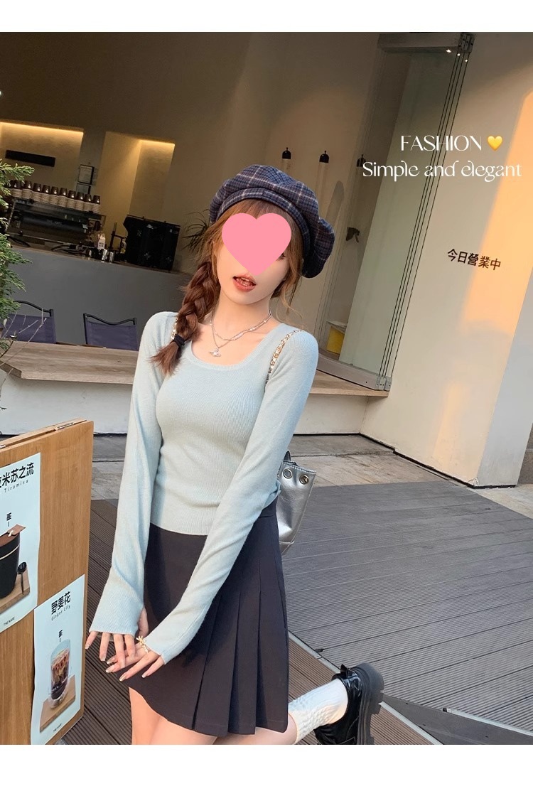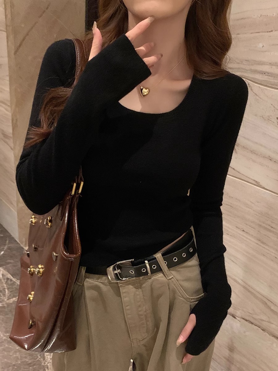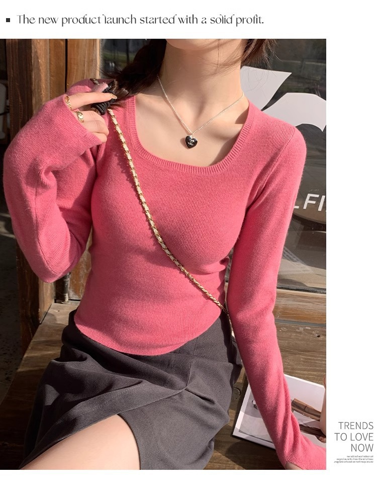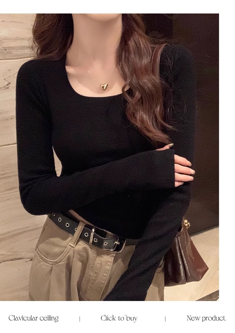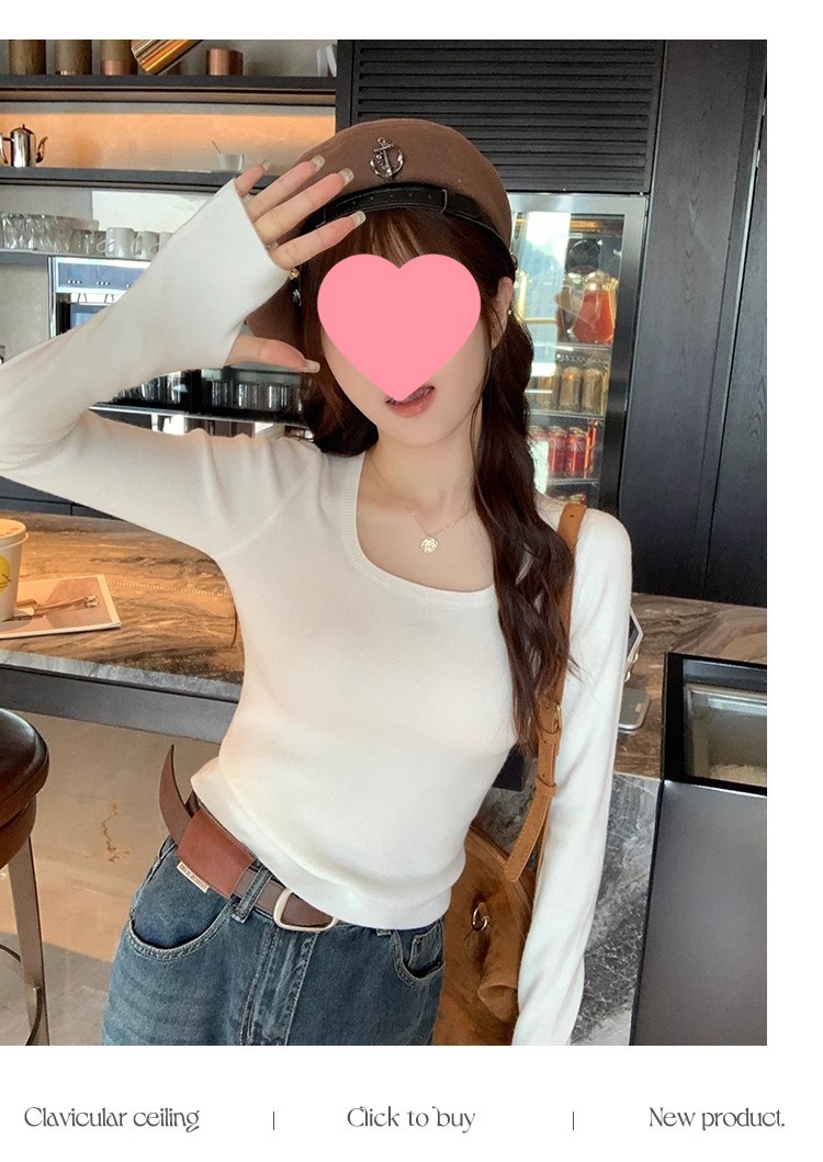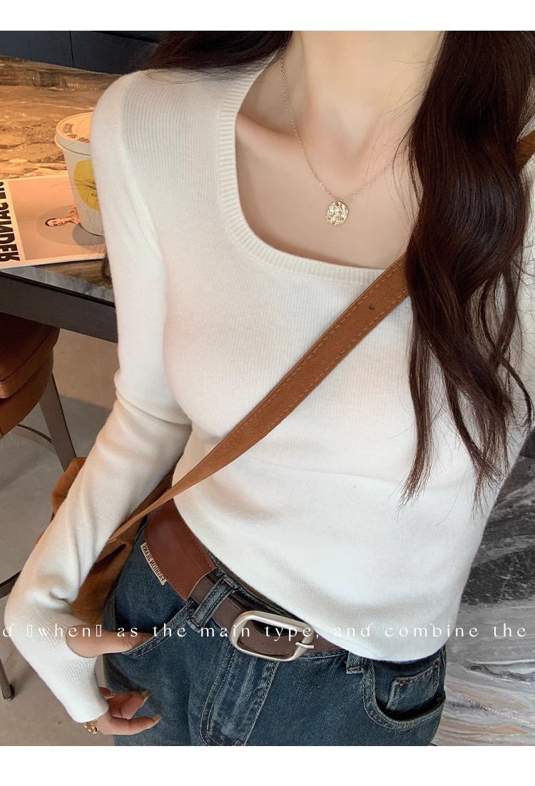 낮은 칼라 보토밍 셔츠 여성의 2024 년 새로운 봄과 가을 회색 스웨터 슬림 핏 스퀘어 칼라 니트 셔츠 센스 내부 탑