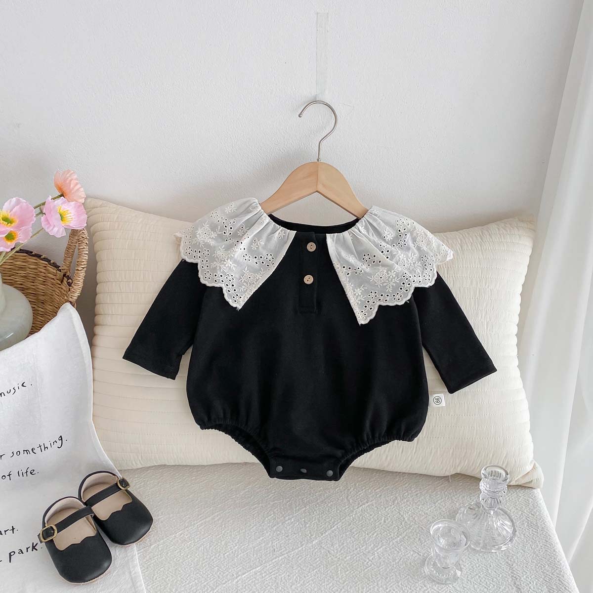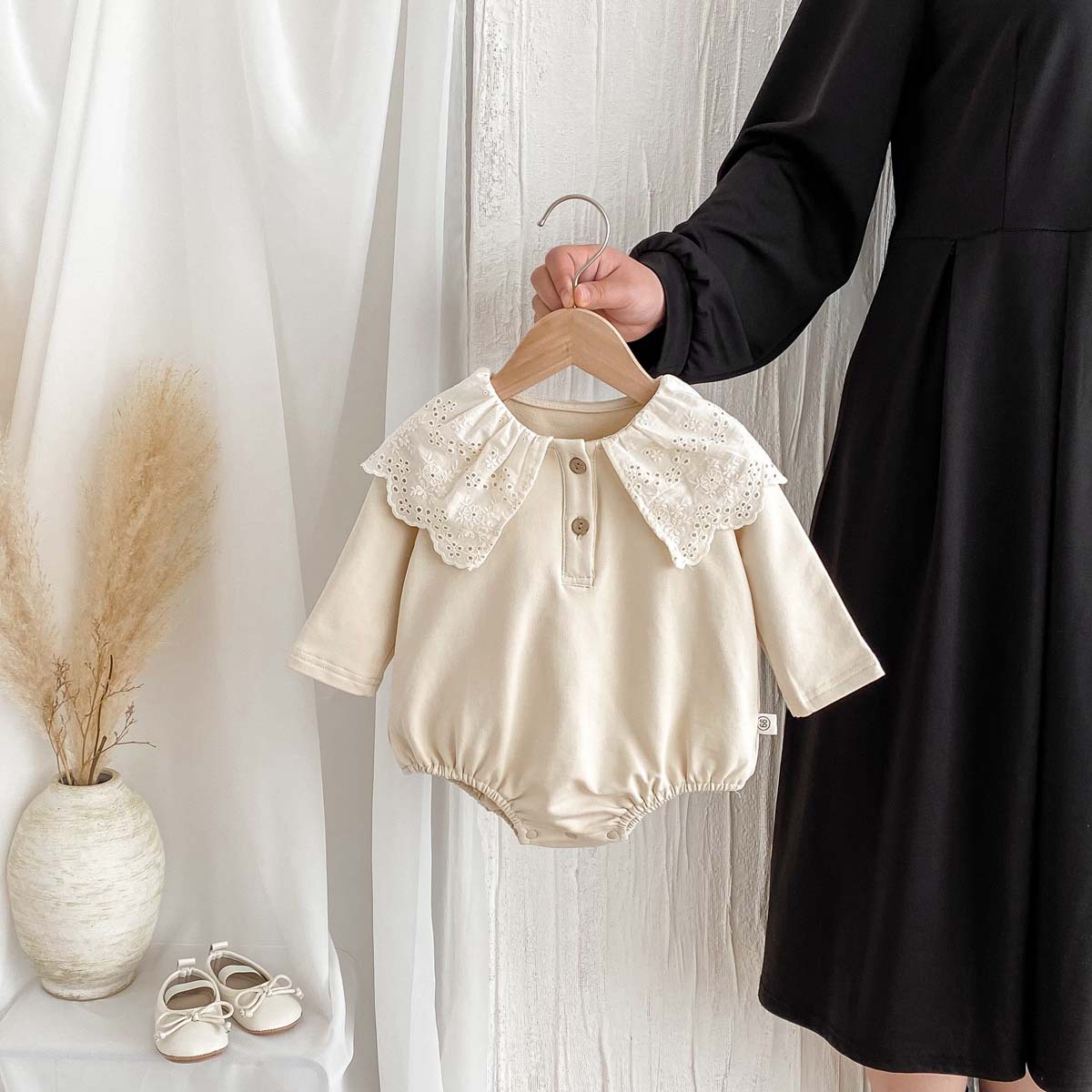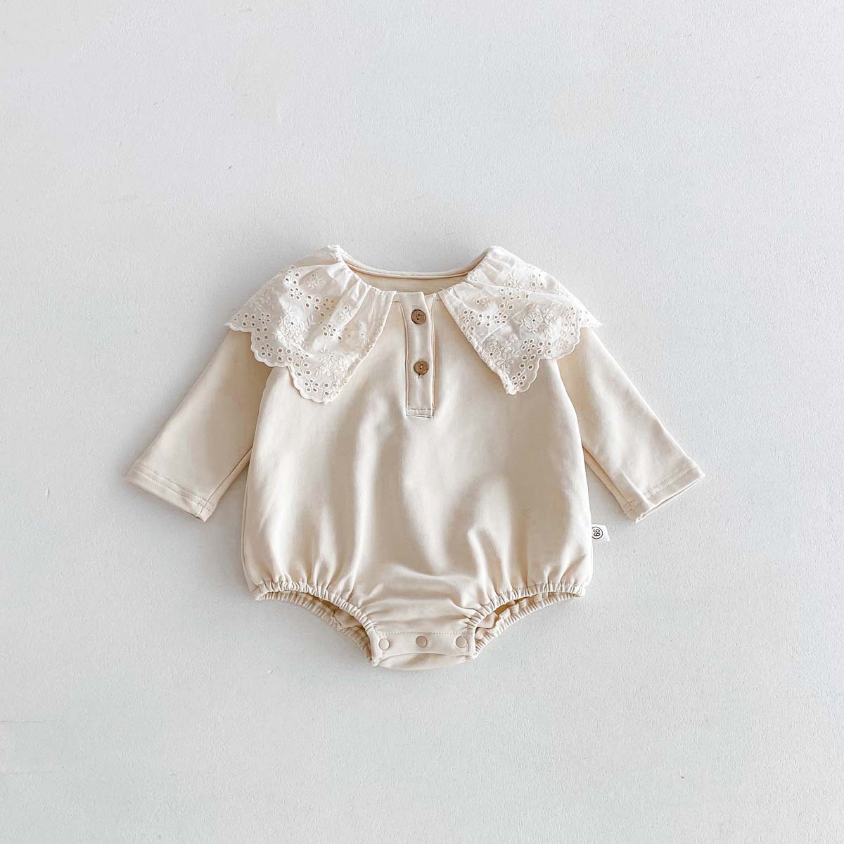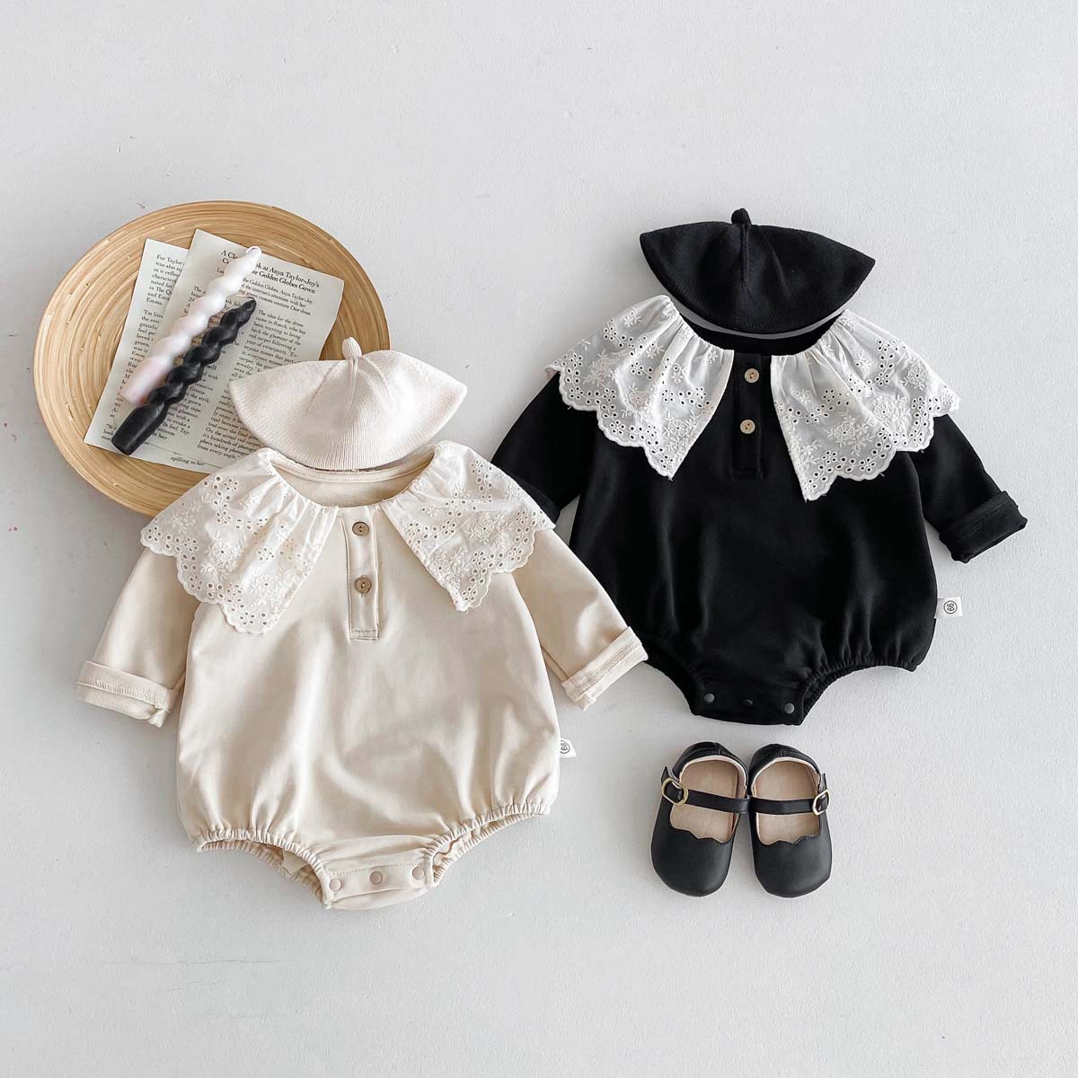 아기의 봄과 가을 붐 수트 여성 아기의 큰 옷깃 긴 소매 삼각형 붐 수트 신생아 한국식 풀오버 붐 수트