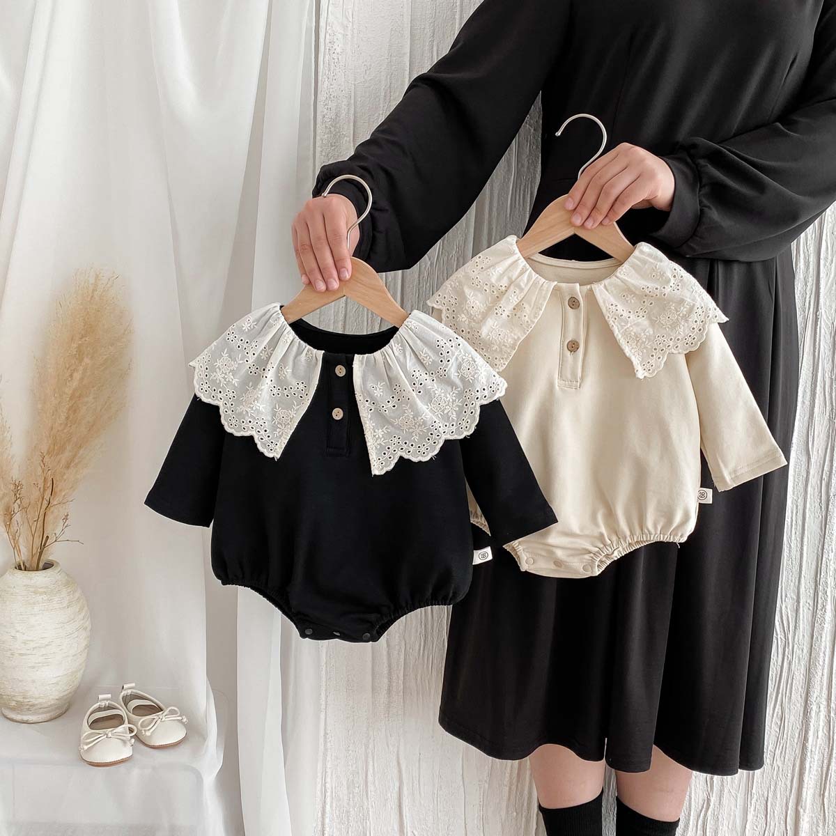 아기의 봄과 가을 붐 수트 여성 아기의 큰 옷깃 긴 소매 삼각형 붐 수트 신생아 한국식 풀오버 붐 수트스토어 가기