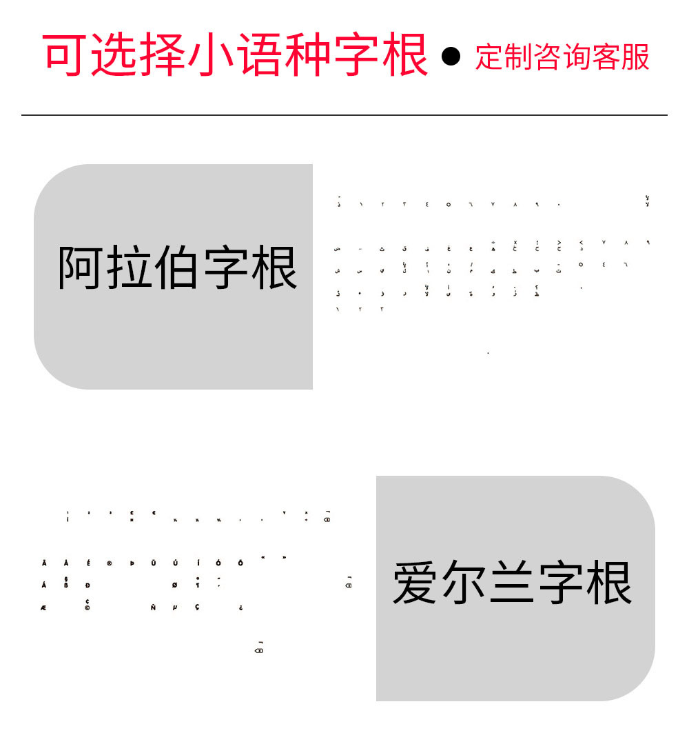 需要定制小语种字根请联系客服:阿拉伯字根,爱尔兰文,藏文字根,俄文,韩文,日文,泰文等