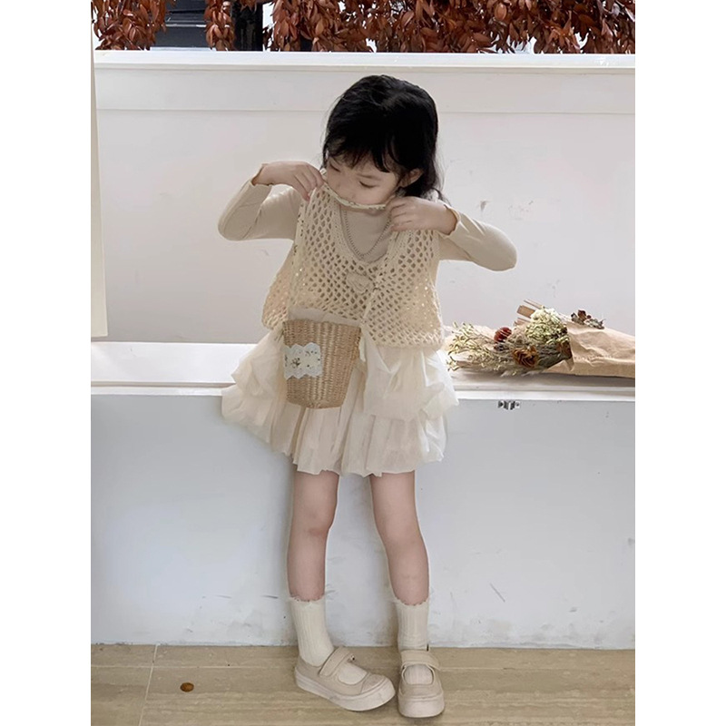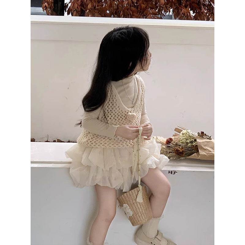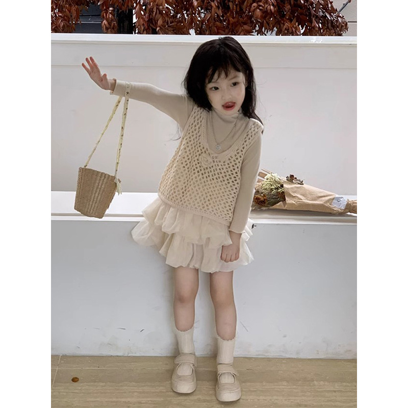 게으른 부드러운 세트 여아 아동복 이른 가을 긴소매 베이스 레이어 셔츠 니트 조끼 더블 레이어 메쉬 스커트