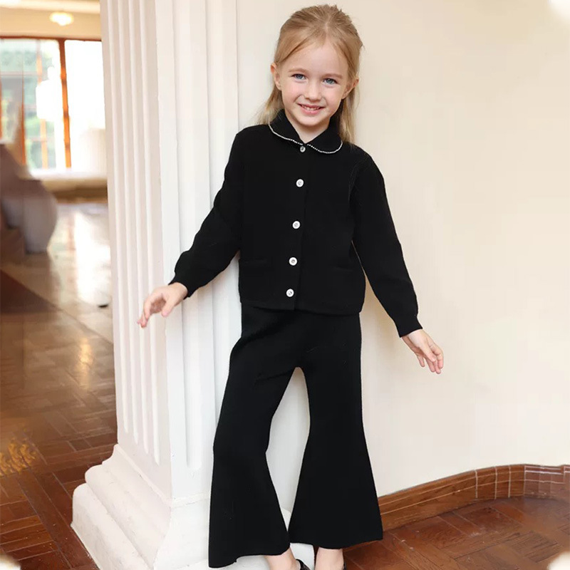 2024 가을과 겨울 어린 소녀의 니트 스웨터 세트 다이아몬드 엣지 코트 혼 바지를 입은 소녀 샤넬 스타일 니트 카디건