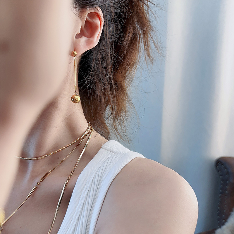 Ins 라이트 럭셔리 콜드 스타일 여성용 귀걸이 18K 골드 티타늄 스틸 귀걸이 틈새 디자인 긴 작은 골드 볼 펜던트 귀걸이스토어 가기