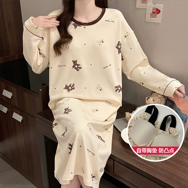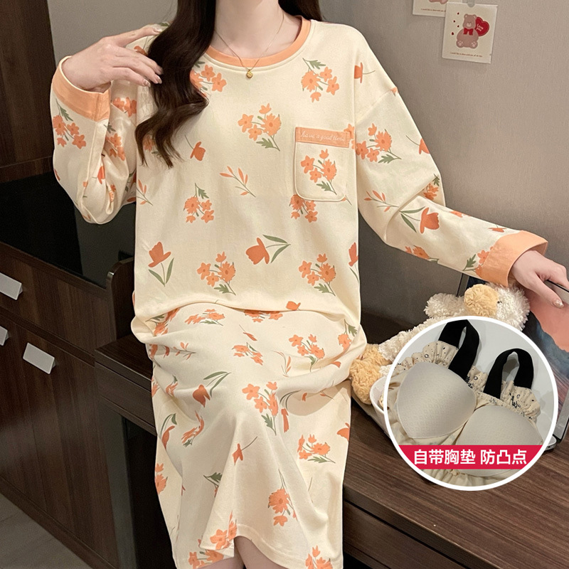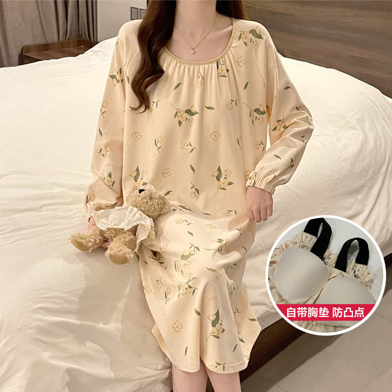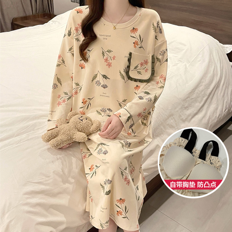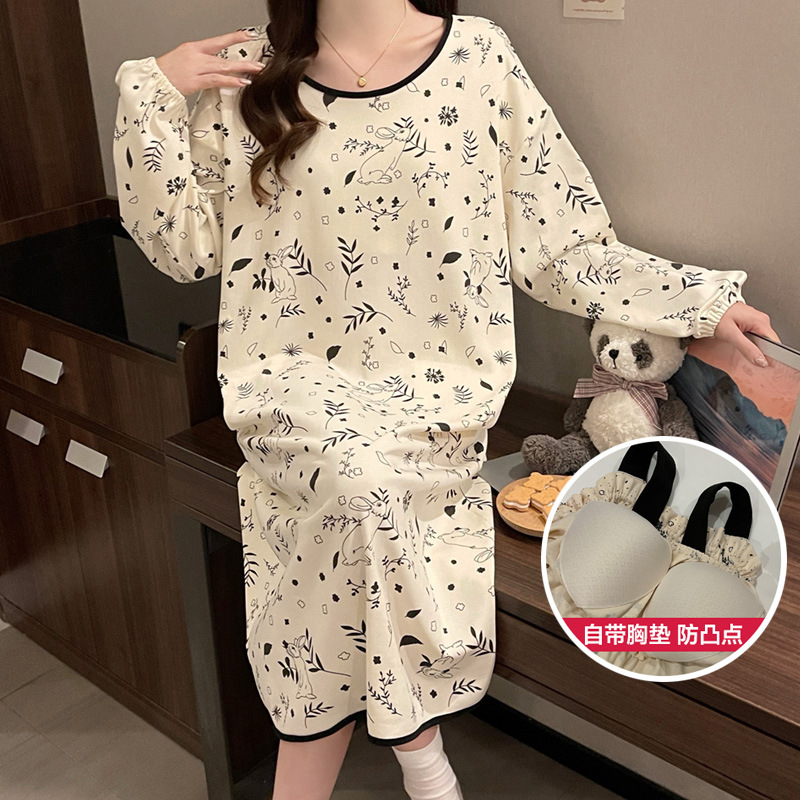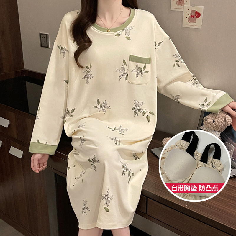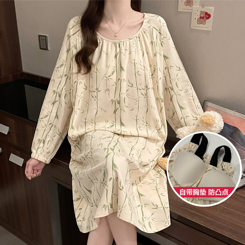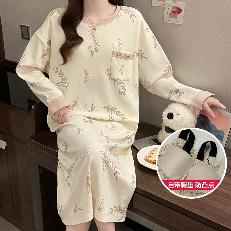 2024 새로운 긴팔 잠옷 가슴 패드 여성의 가을과 겨울 모조 면화 잎 느슨한 외부 착용 홈 의류 잠옷스토어 가기