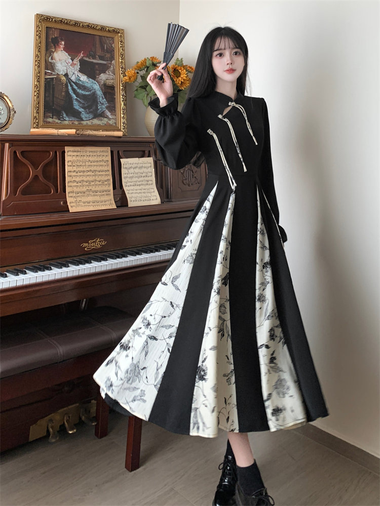 봄과 가을 새로운 새로운 중국 스타일 국가 스타일 레트로 원피스 디자인 센스 스티칭 인쇄 세련된 슬리밍 큰 원피스스토어 가기