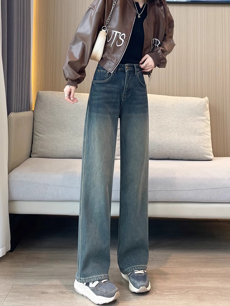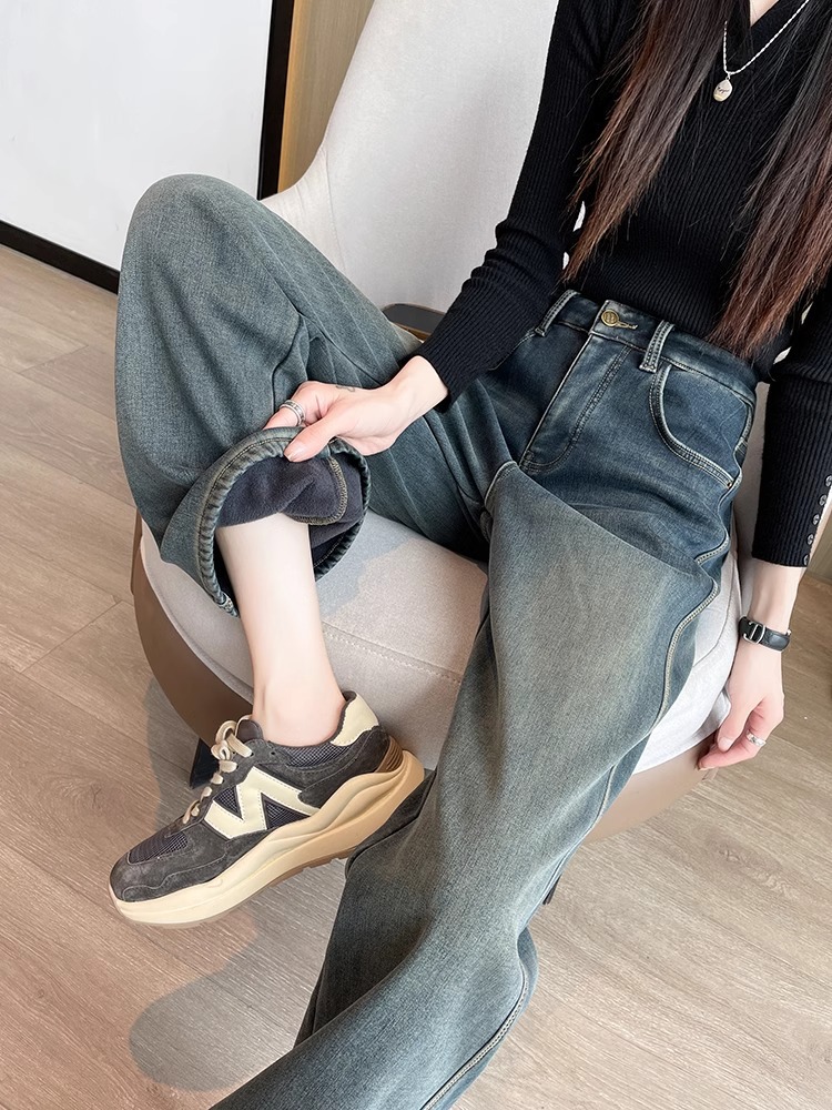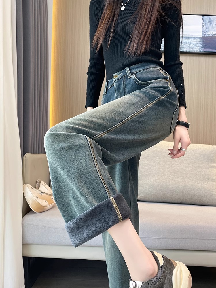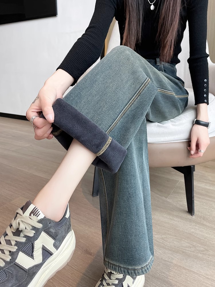향수를 불러 일으키는 파란색 좁은 데님 넓은 다리 바지 여성의 가을과 겨울 새로운 높은 허리 느슨한 슬리밍 기모 두꺼운 빈티지 스트레이트 바지