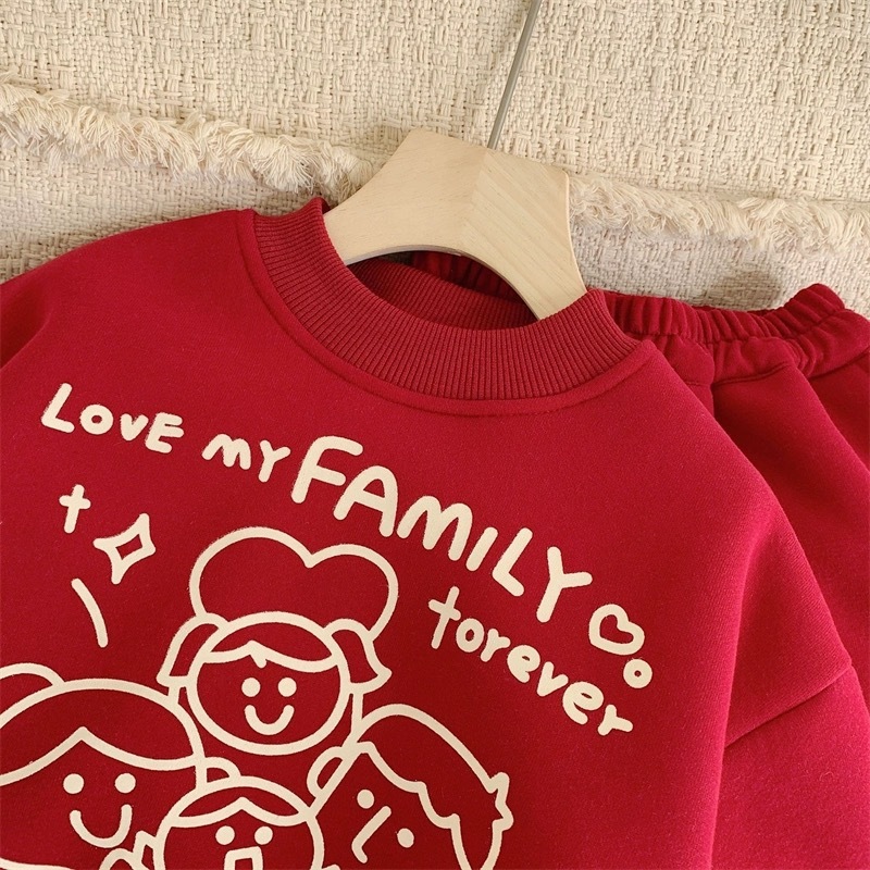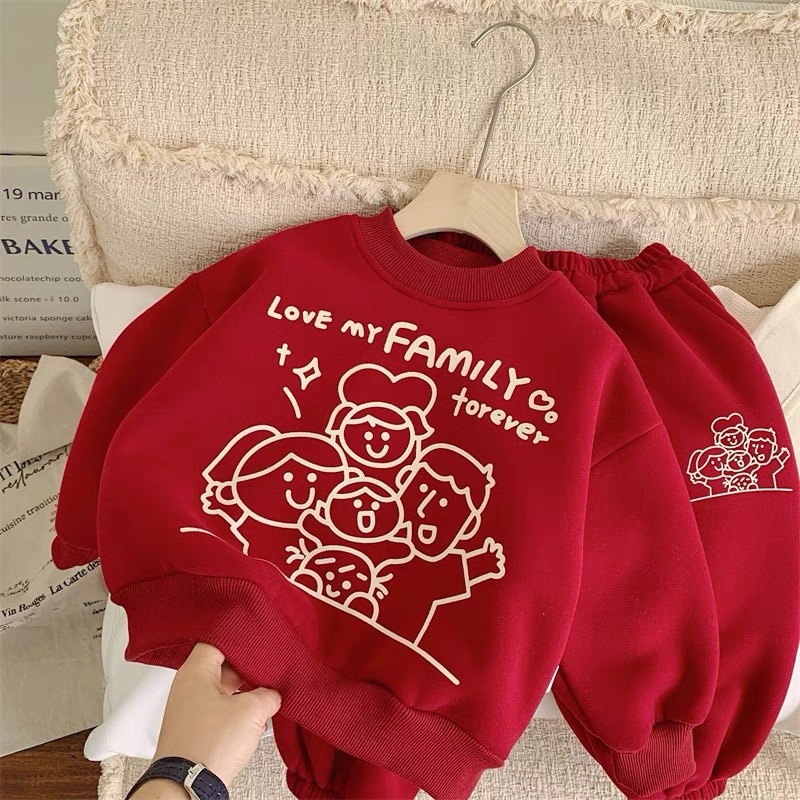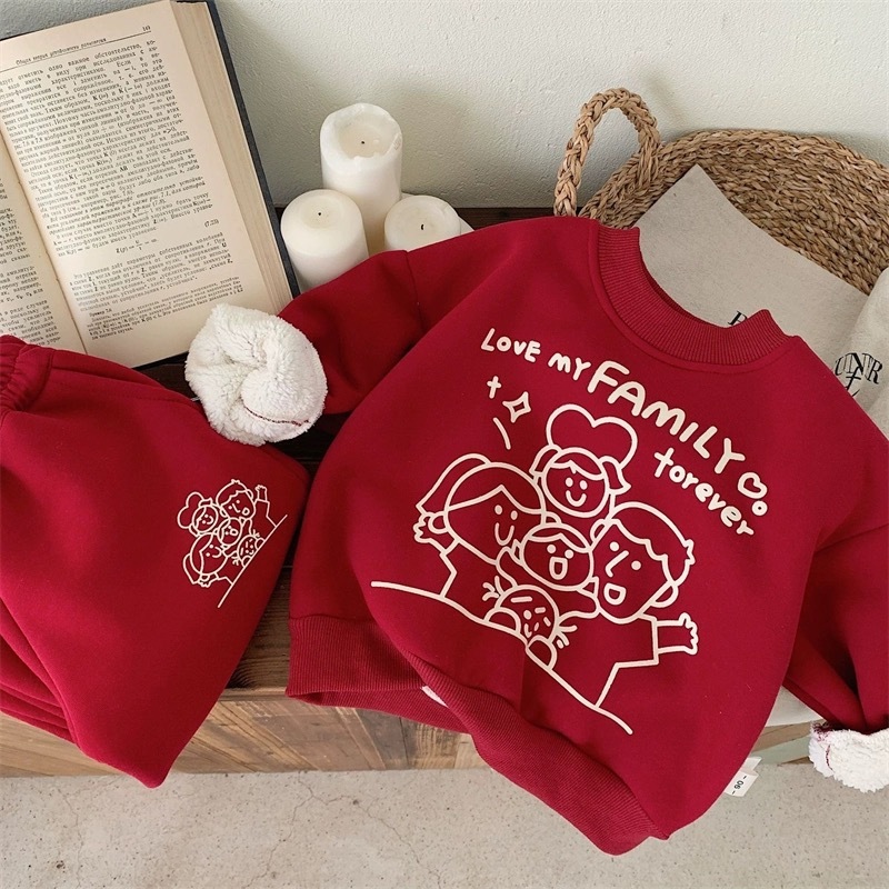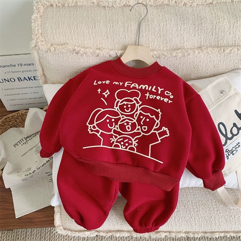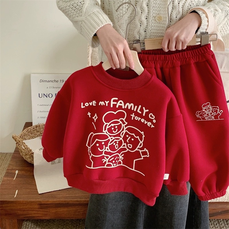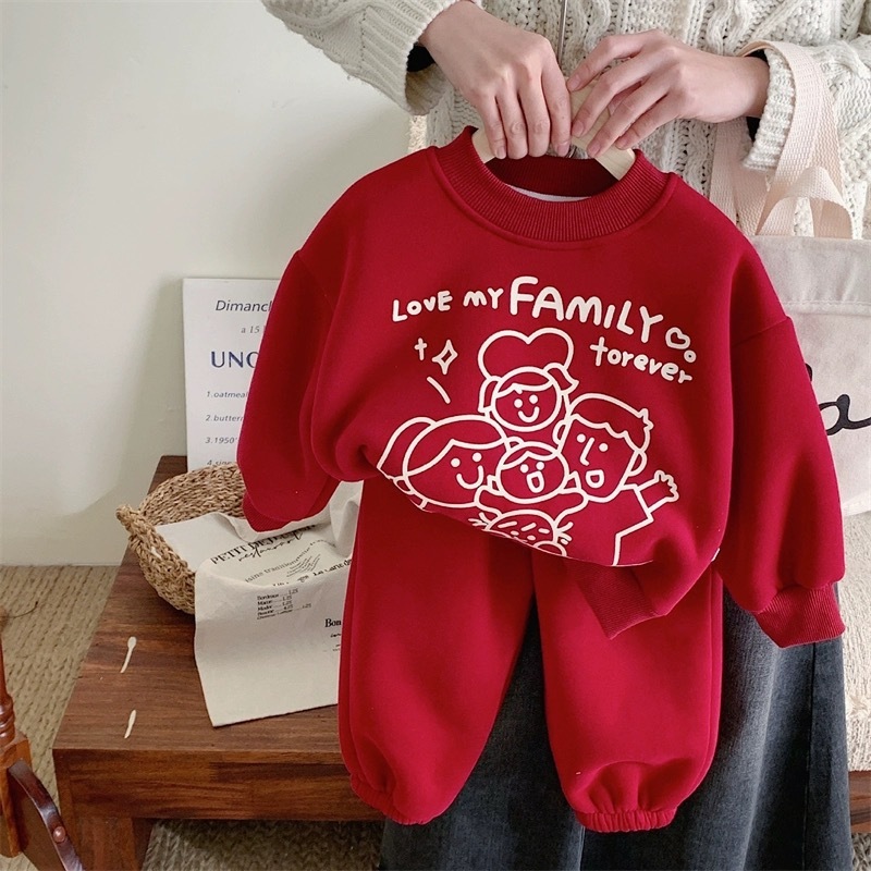 어린이 새 가을과 겨울 기모 소년 소녀를위한 세트 축제 신년 옷 아기 땀 바지 두 조각 유행 세트