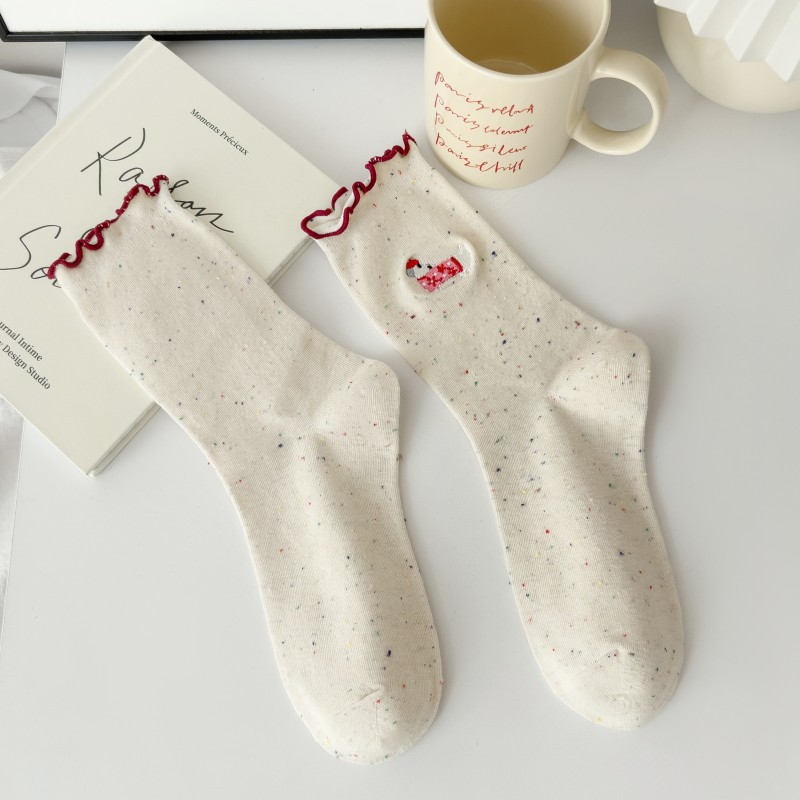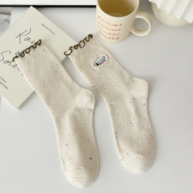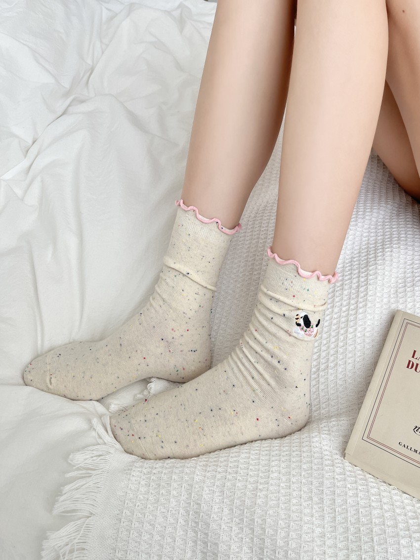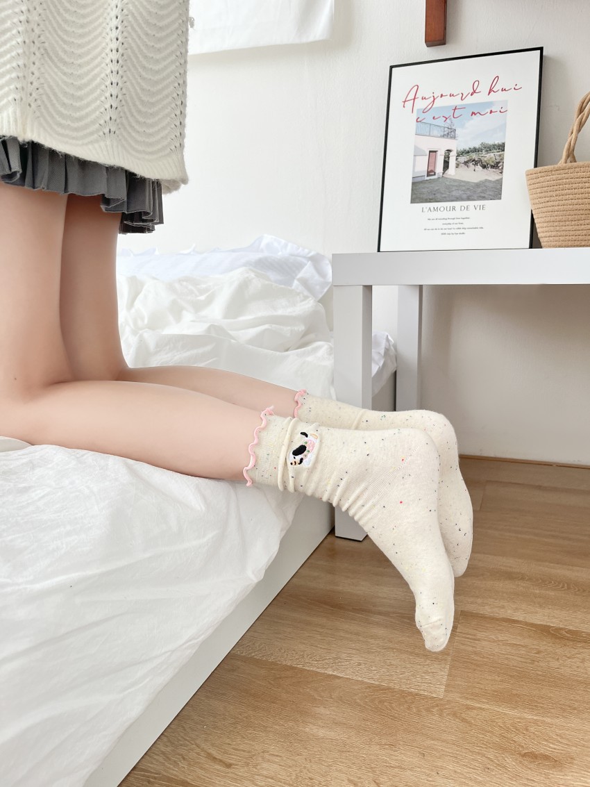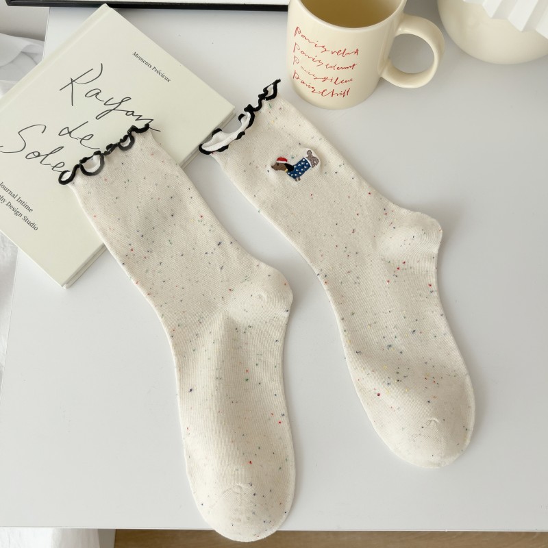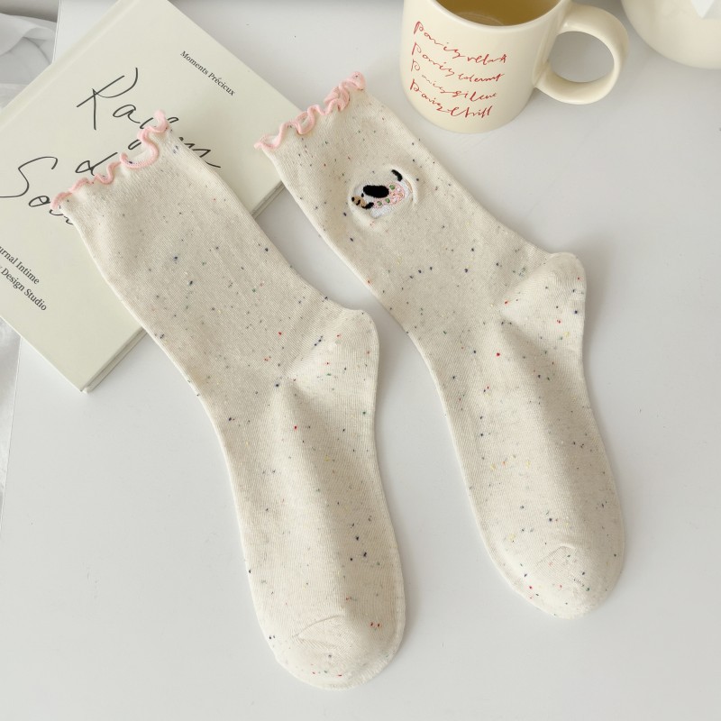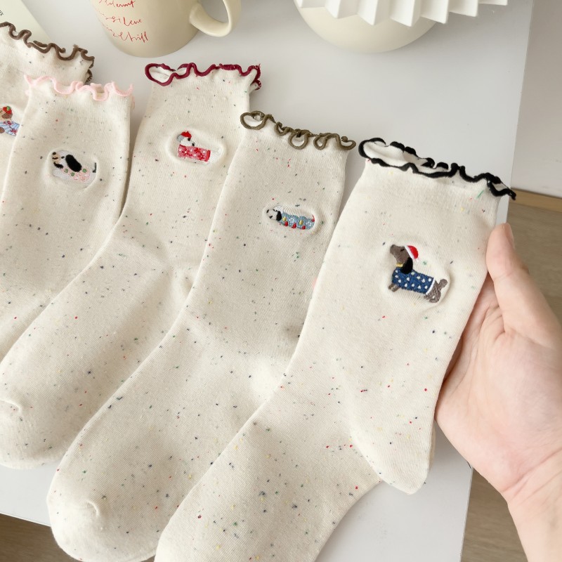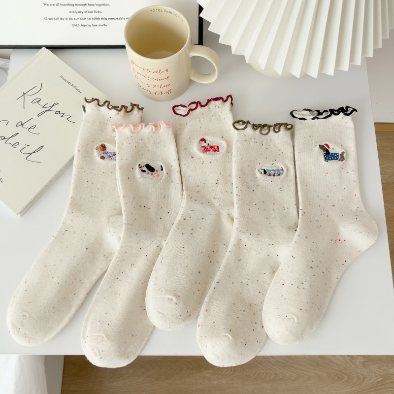 양말 여성의 가을과 겨울 Ins 트렌디 한 중간 길이의 양말 독특한 나무 귀 강아지 자수 포인트 원사 귀여운 더미 스타킹