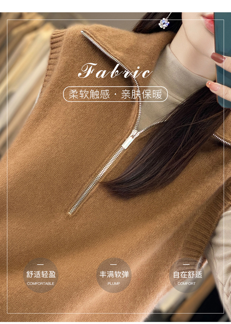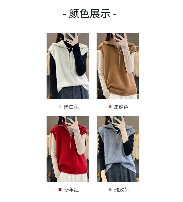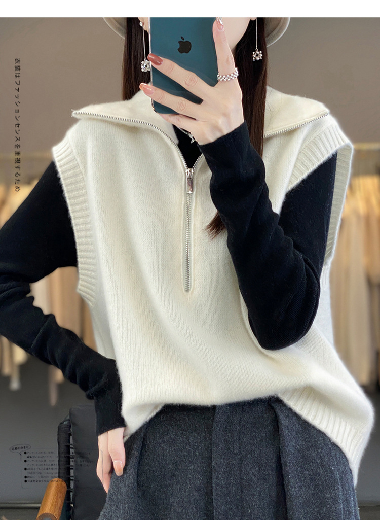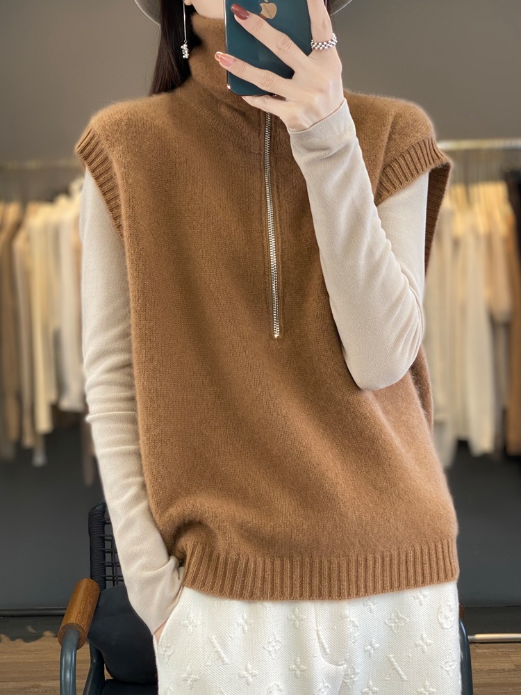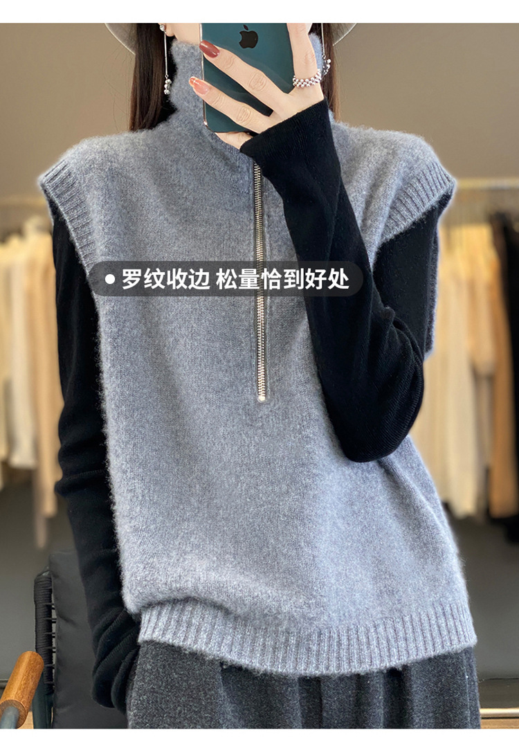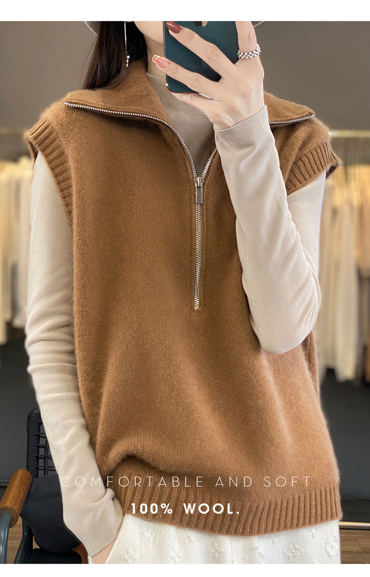 퓨어 울 지퍼 하프 오픈 칼라 니트 조끼 조끼 여성 아우터웨어 민소매 하이 칼라 웨이스트 코트 스웨터 니처 탑스토어 가기