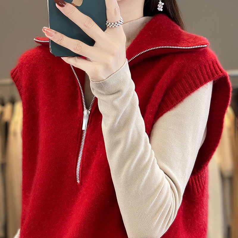 퓨어 울 지퍼 하프 오픈 칼라 니트 조끼 조끼 여성 아우터웨어 민소매 하이 칼라 웨이스트 코트 스웨터 니처 탑