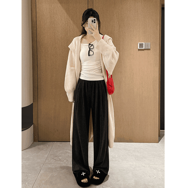 봄과 가을 넓은 다리 바지 여성용 슬림 모양 작은 가을 2024 새로운 화이트 데프 게으른 니트 캐주얼 포도주 쌀 바지스토어 가기