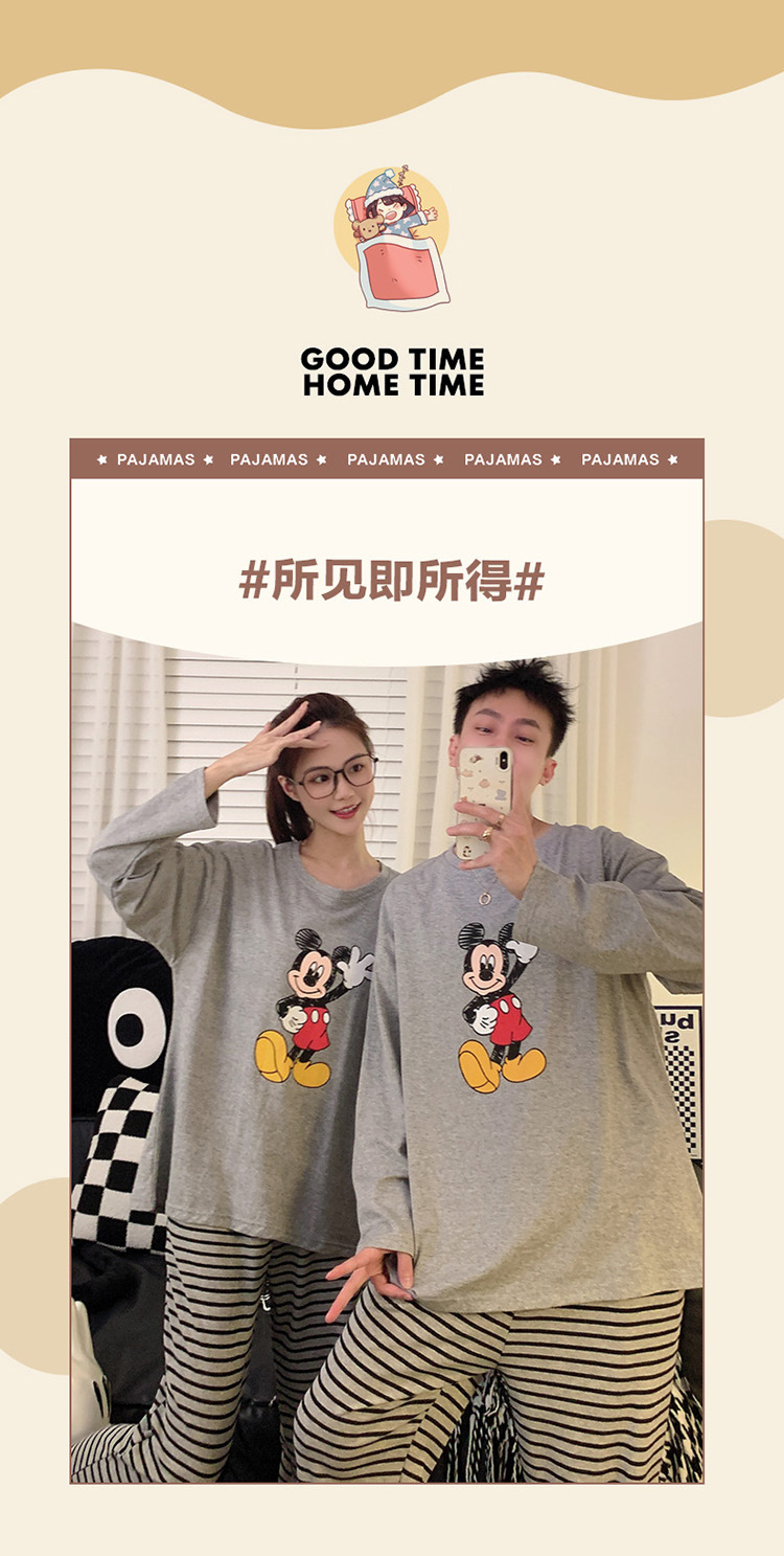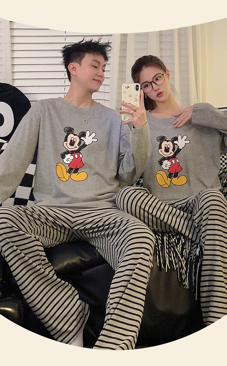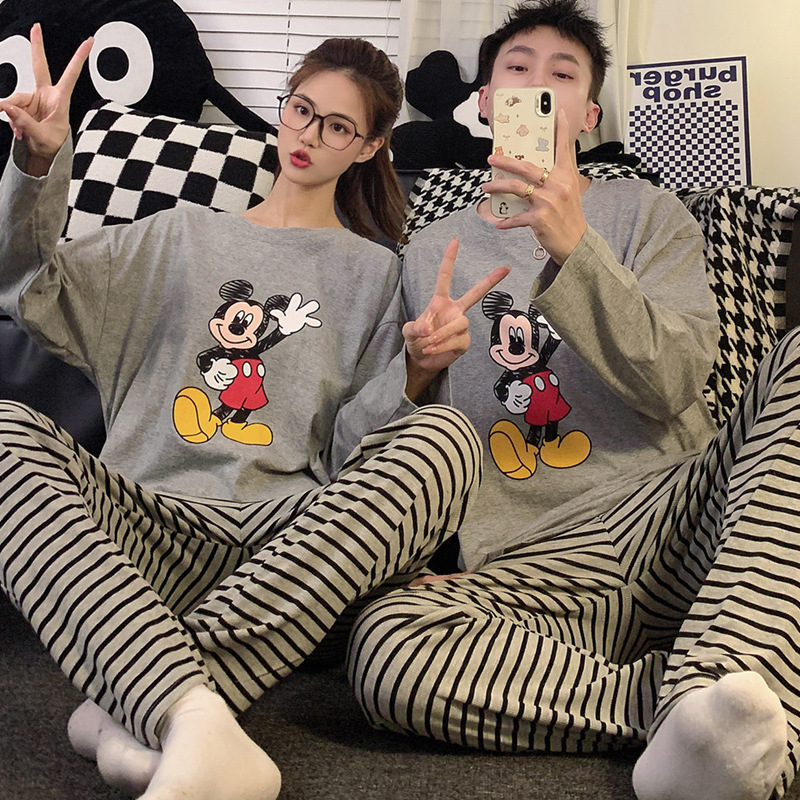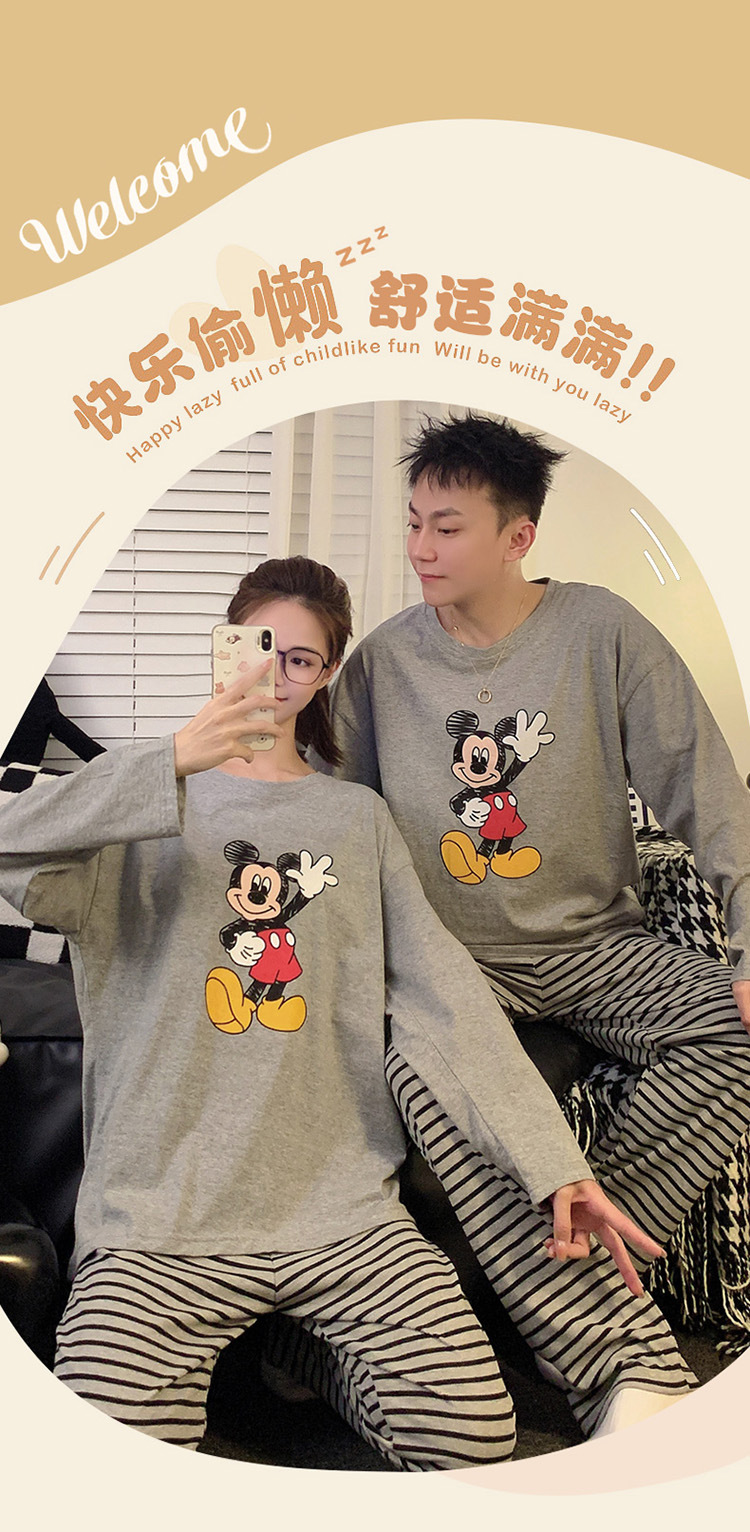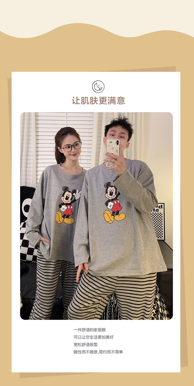 2024 순면 커플 잠옷 여성용 긴 소매 만화 귀여운 회색 남자의 봄과 가을 얇은 홈 의류 세트스토어 가기