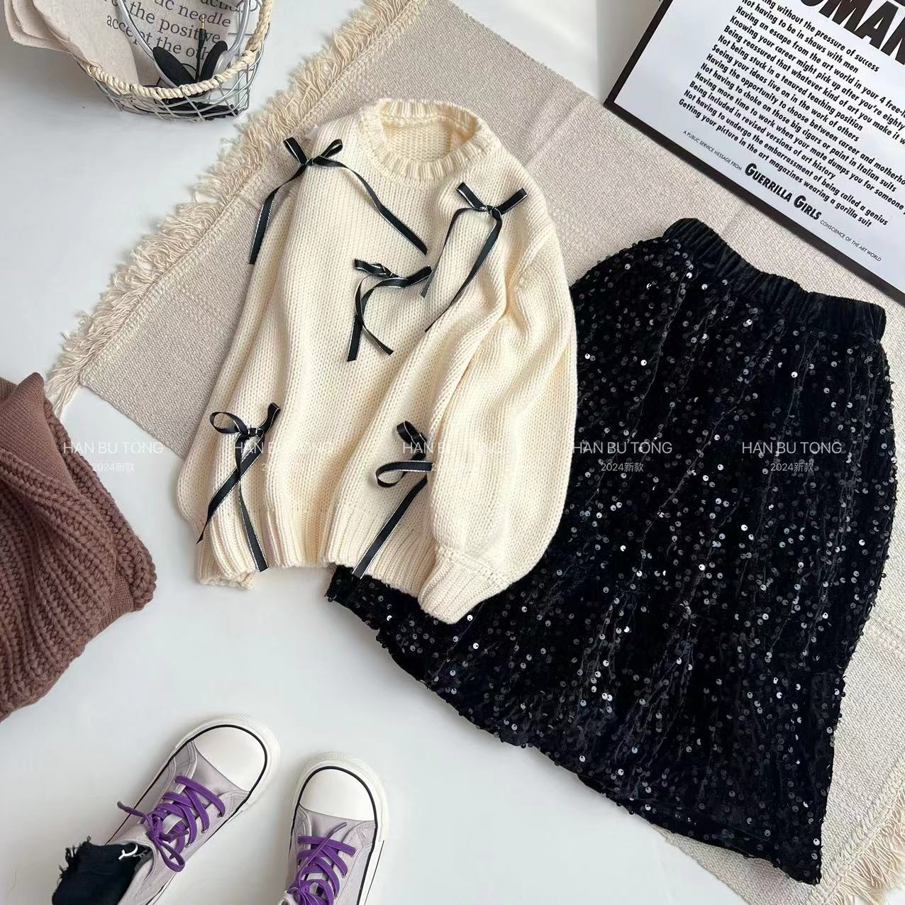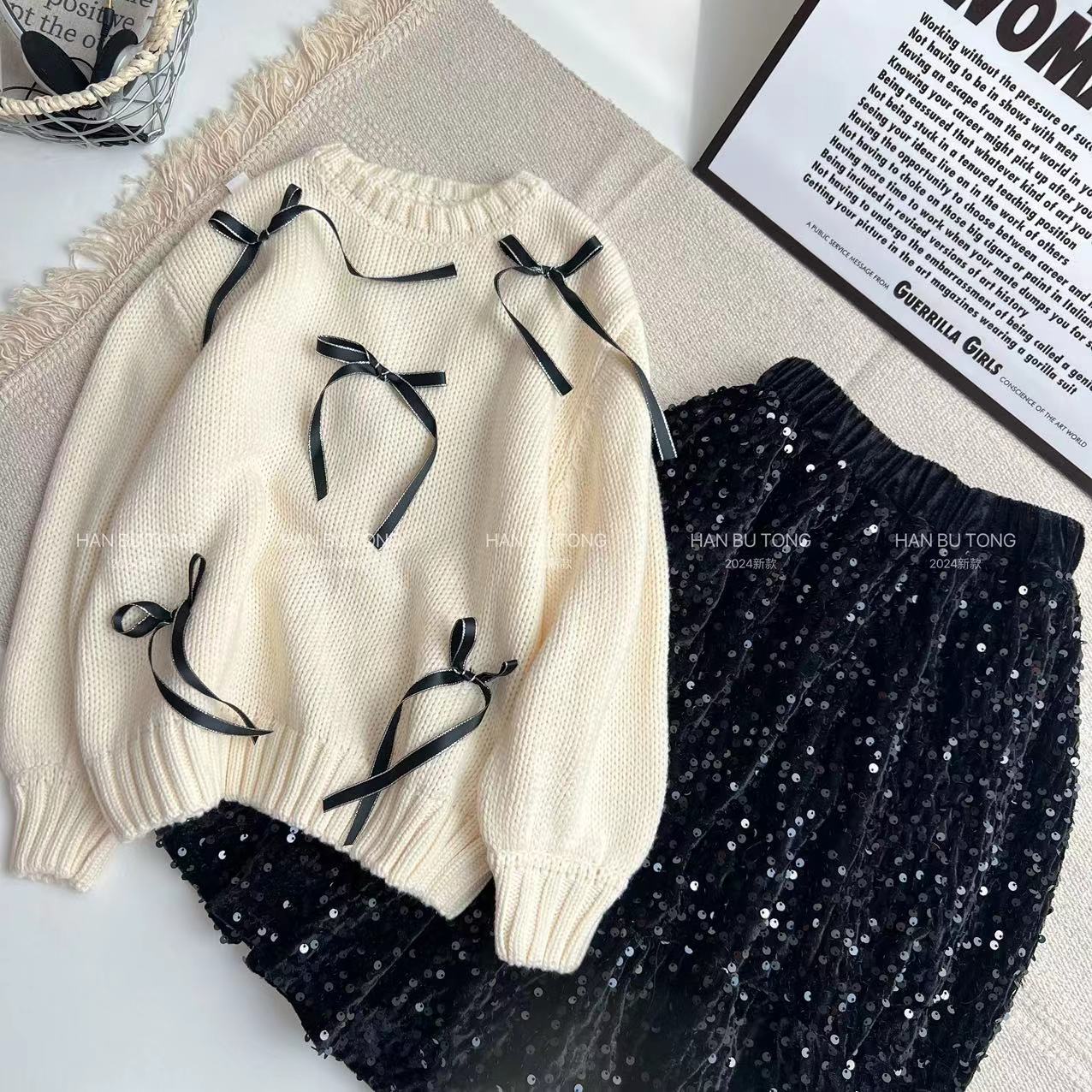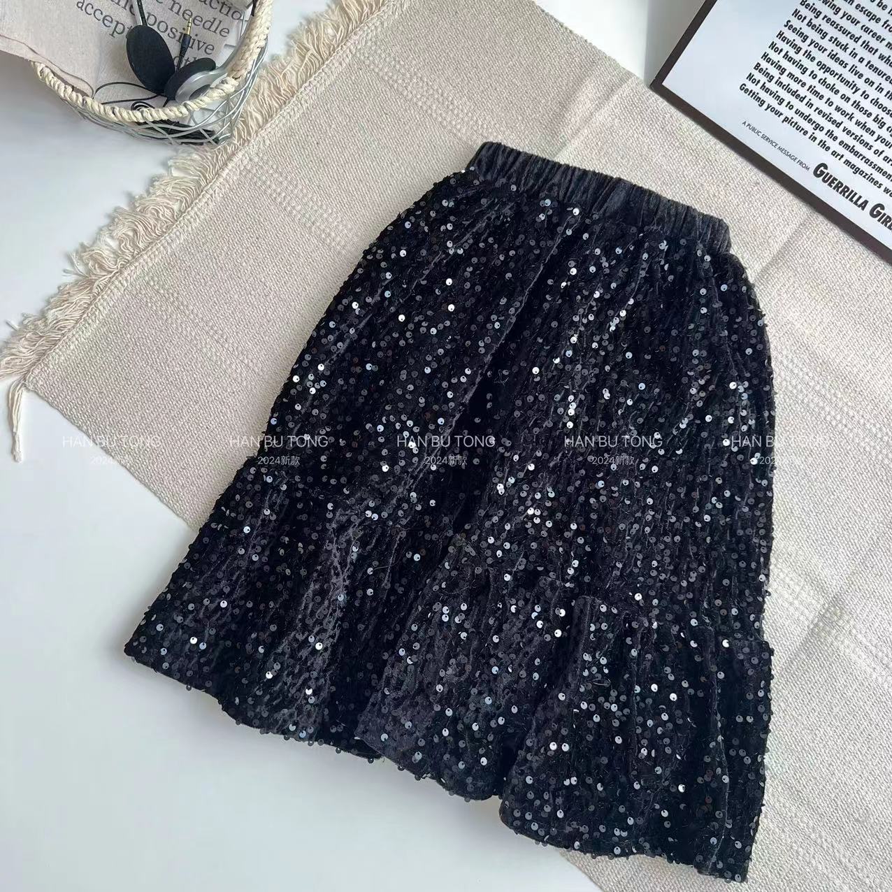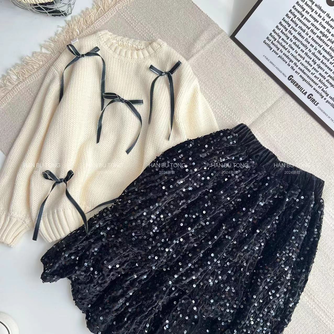 국경을 넘는 소녀 스웨터 스팽글 치마 세트 봄과 가을 2024 새로운 대형 어린이 둥근 목 활 스웨터스토어 가기