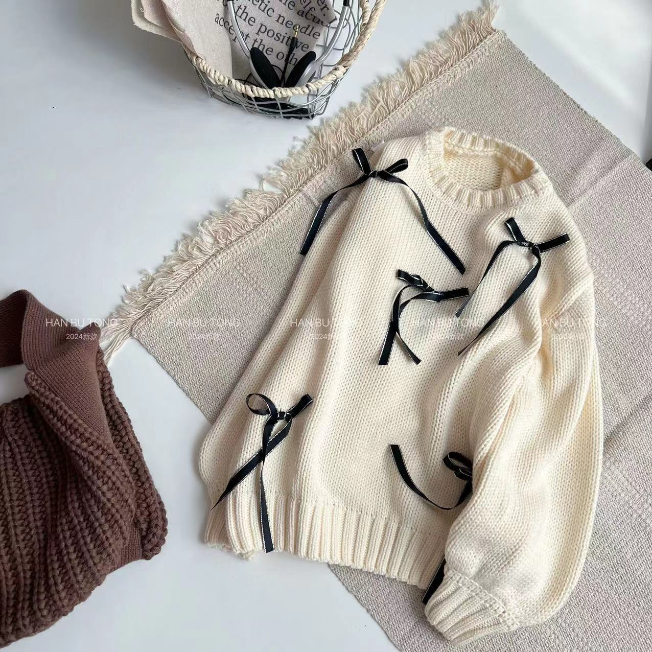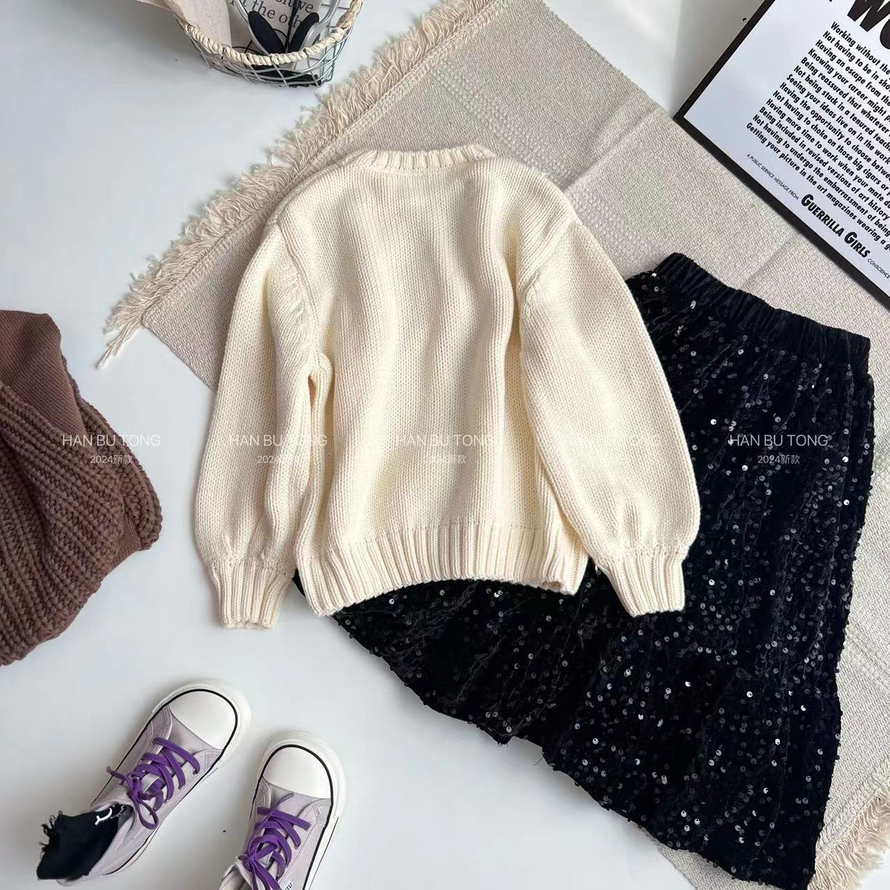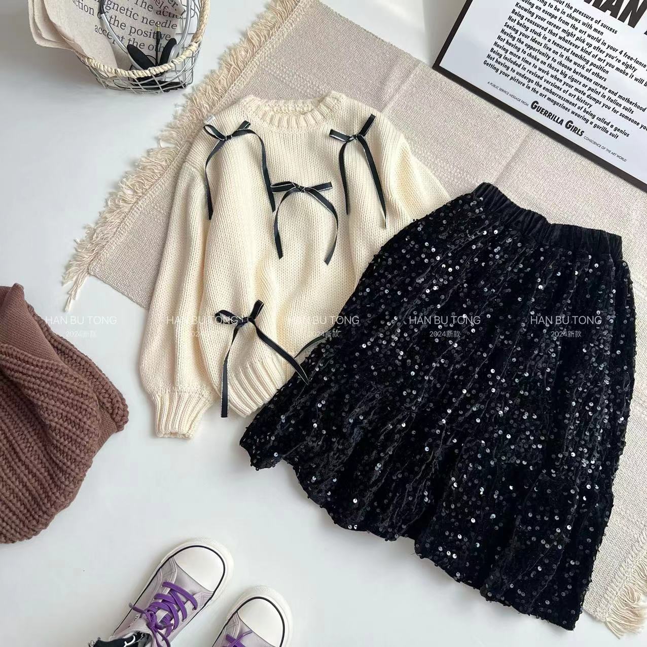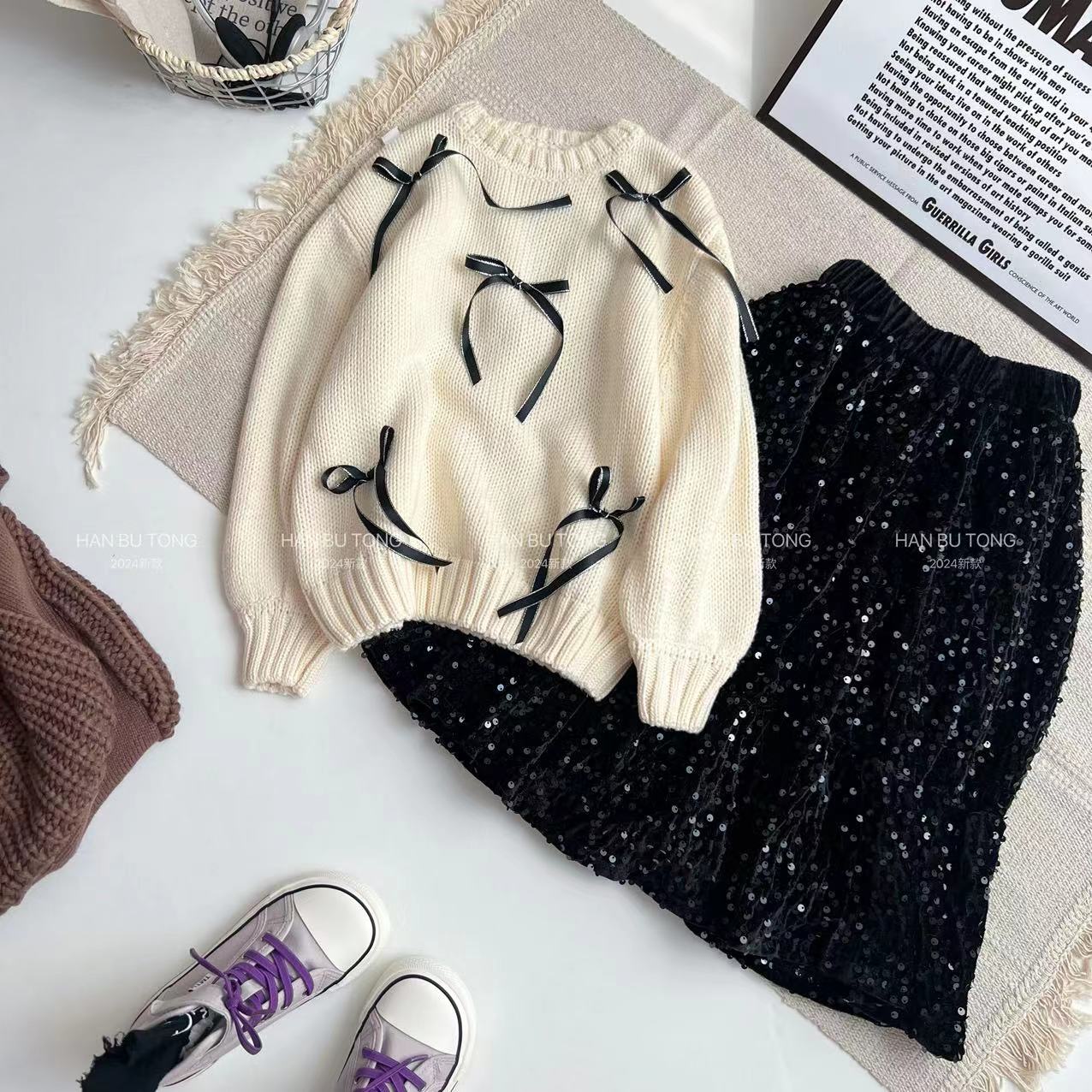 국경을 넘는 소녀 스웨터 스팽글 치마 세트 봄과 가을 2024 새로운 대형 어린이 둥근 목 활 스웨터스토어 가기