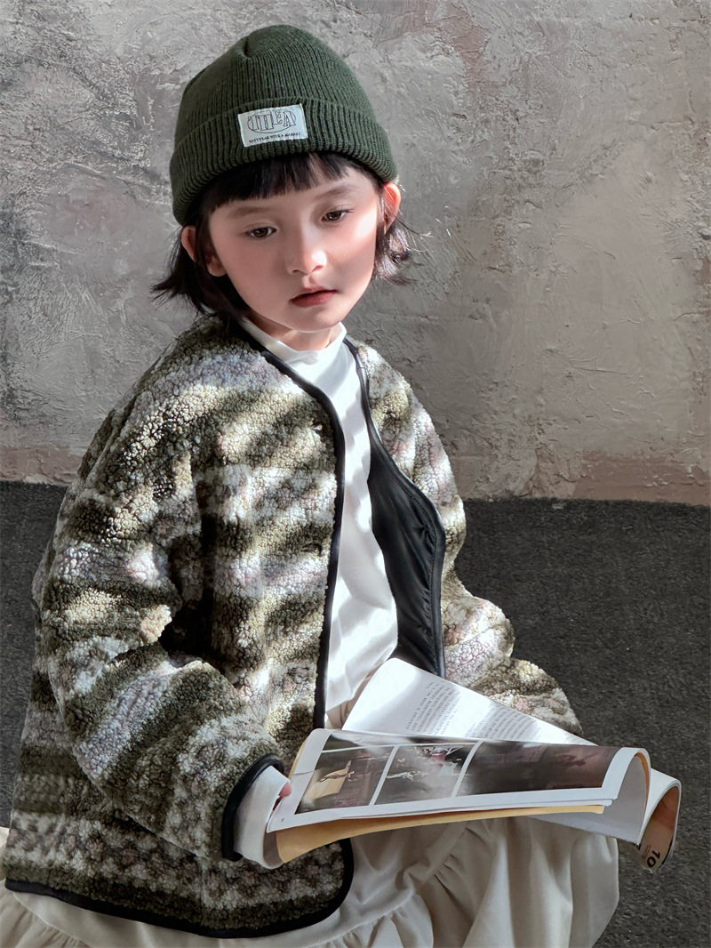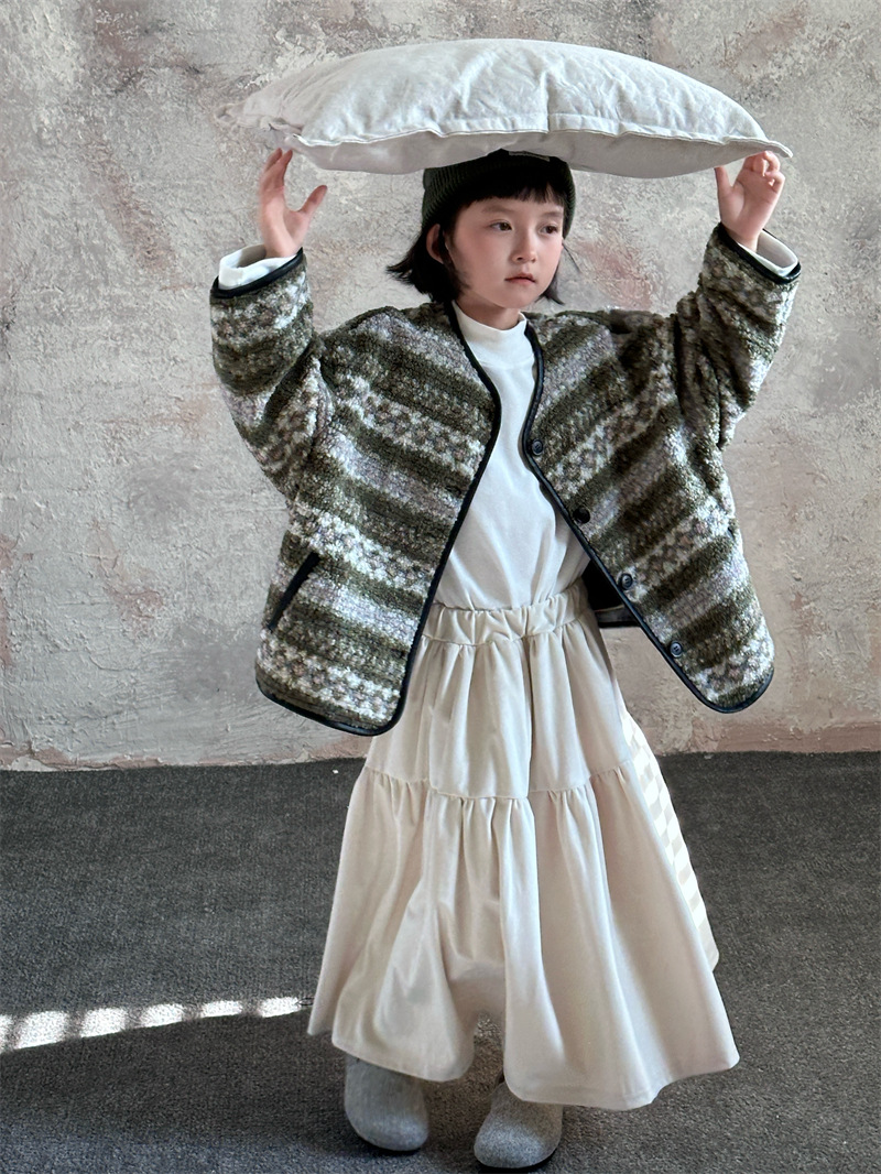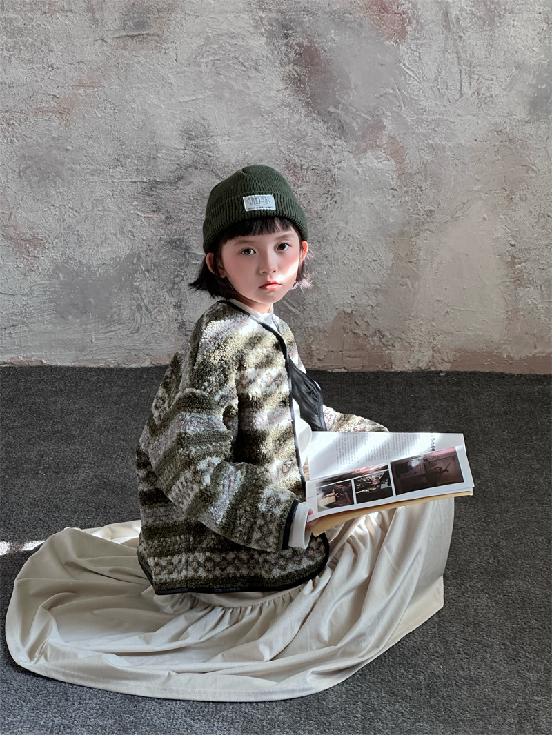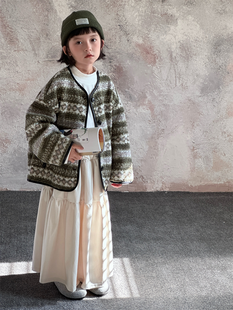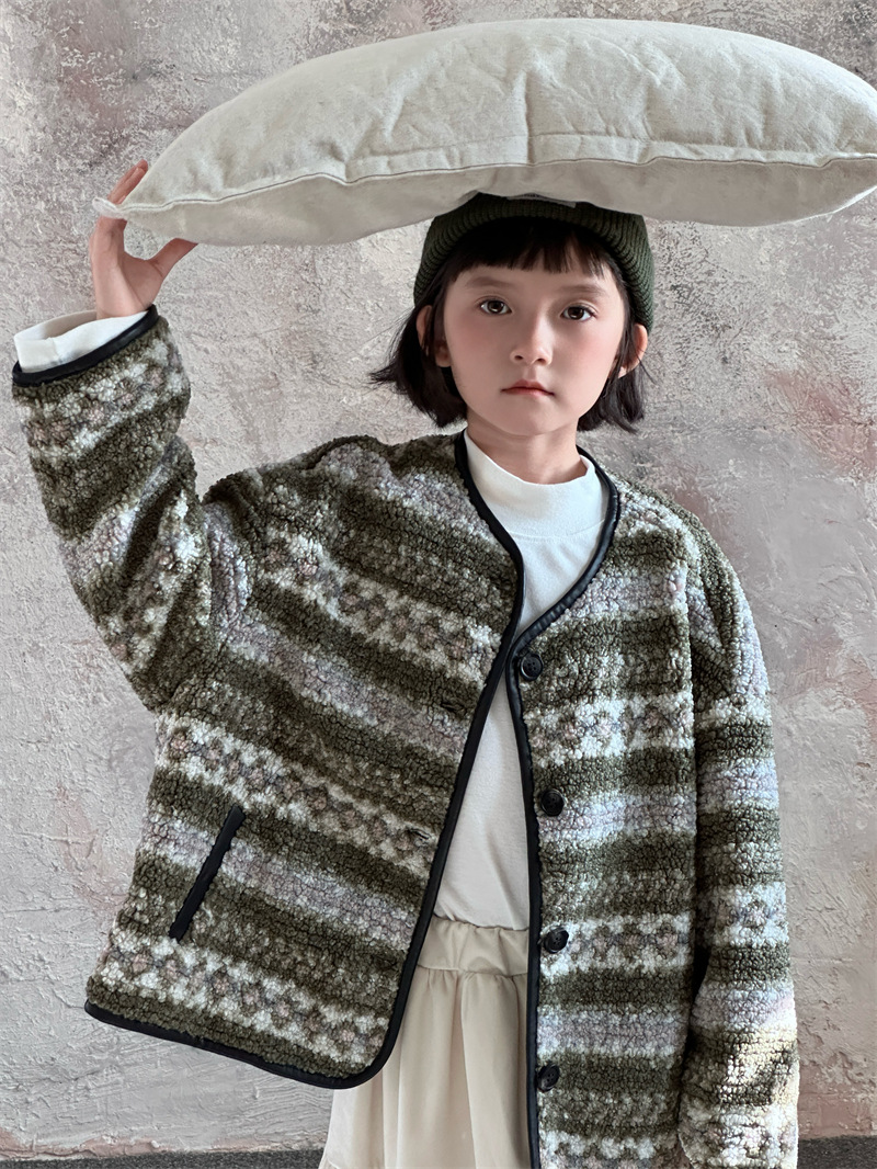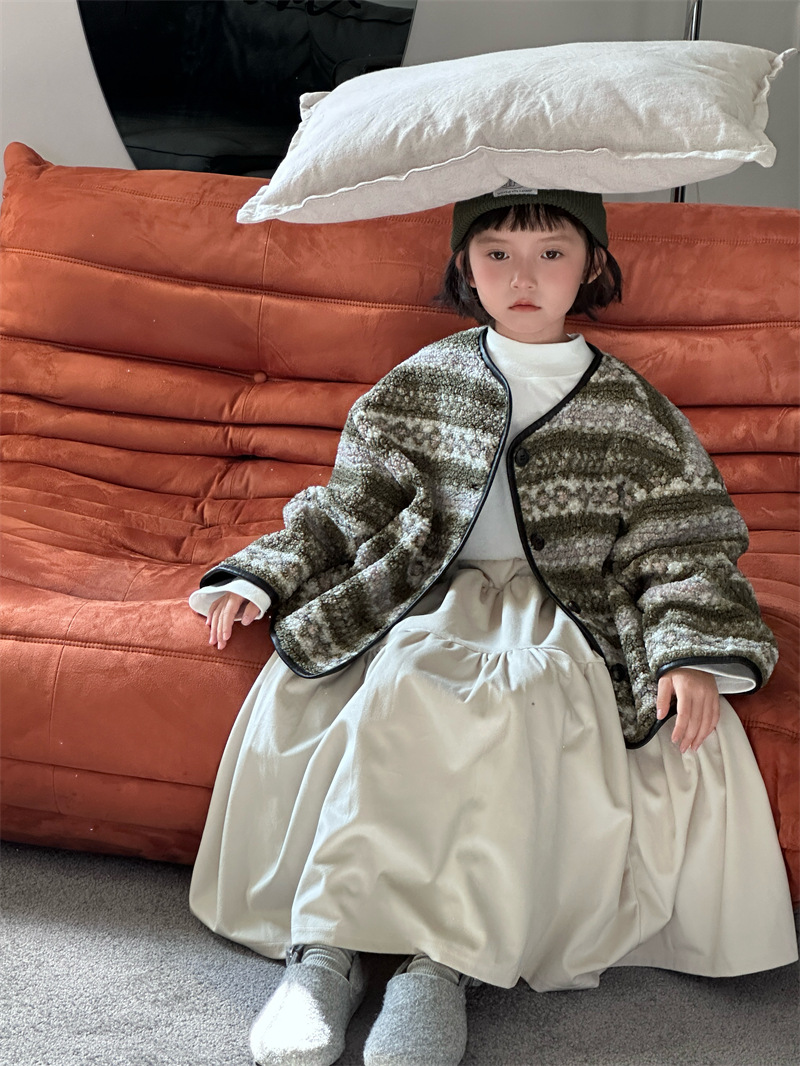 2024 년 겨울 새 한국 어린이 복고풍 람스울 코트 소녀 민족 자카드 울 카디건 조수