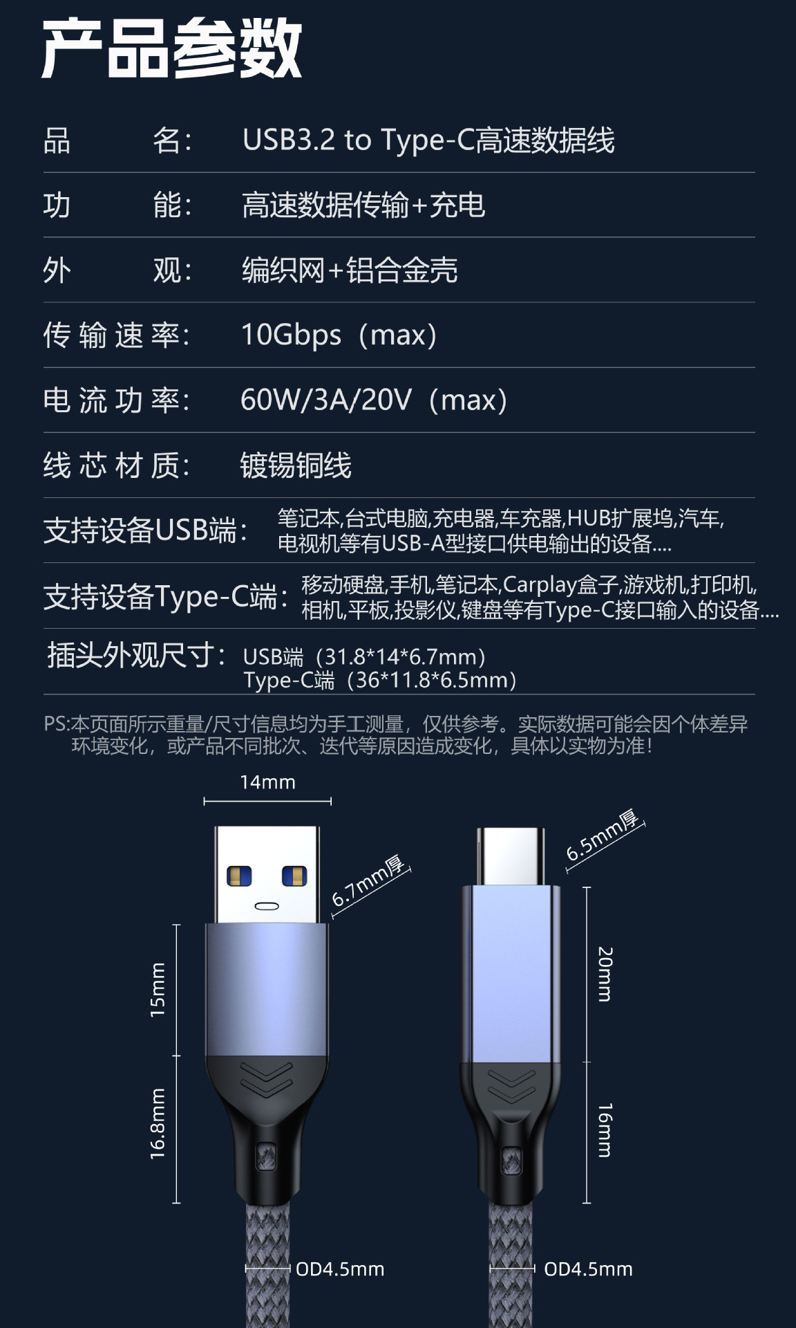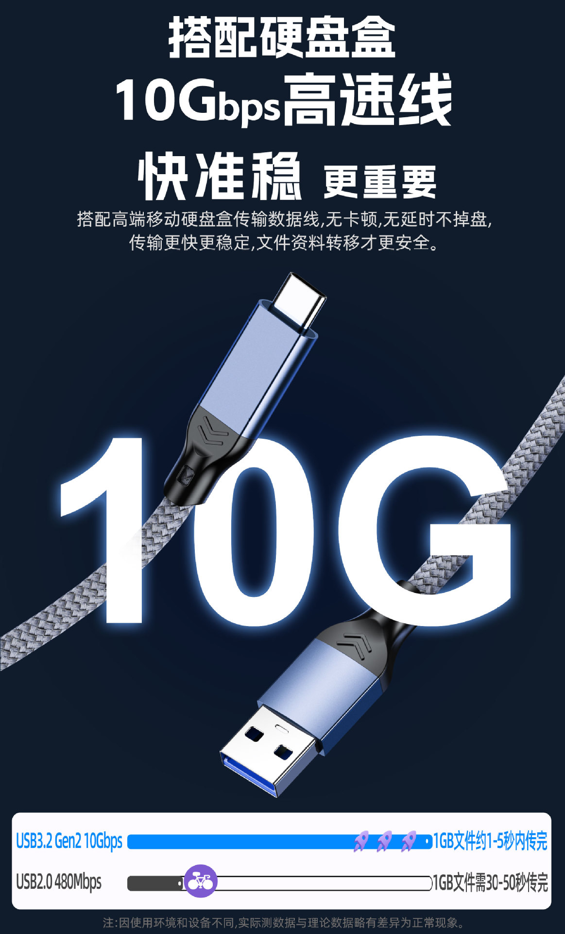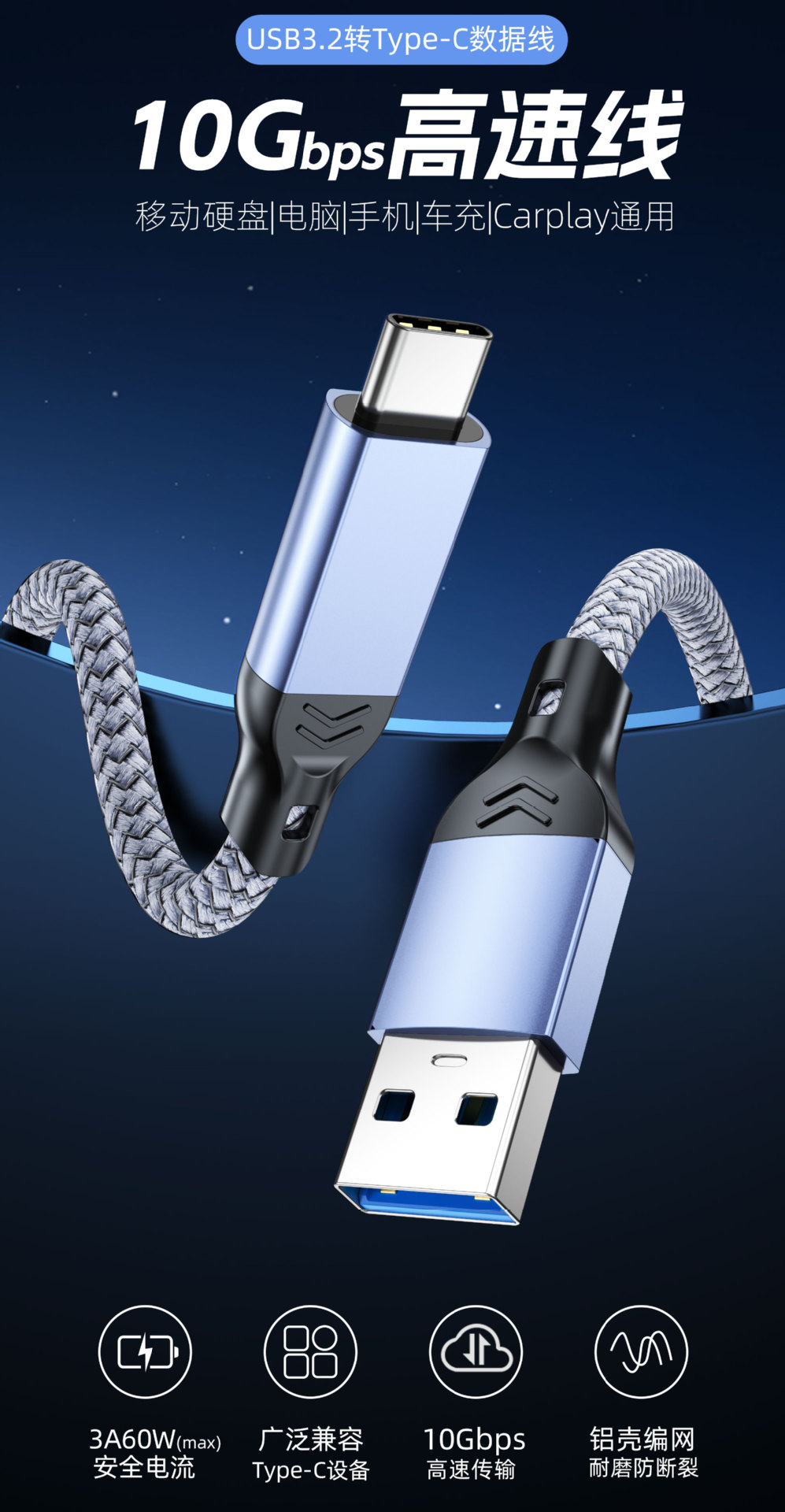 데이터 케이블 타입C 모바일 하드 드라이브 케이블 USB3.2 to 타입C 10Gbps 고속 케이블 카플레이 케이블 60W