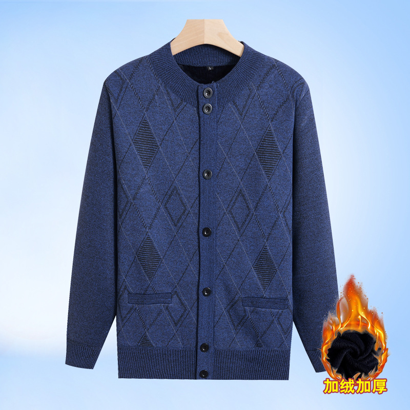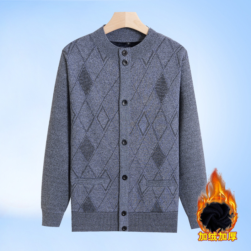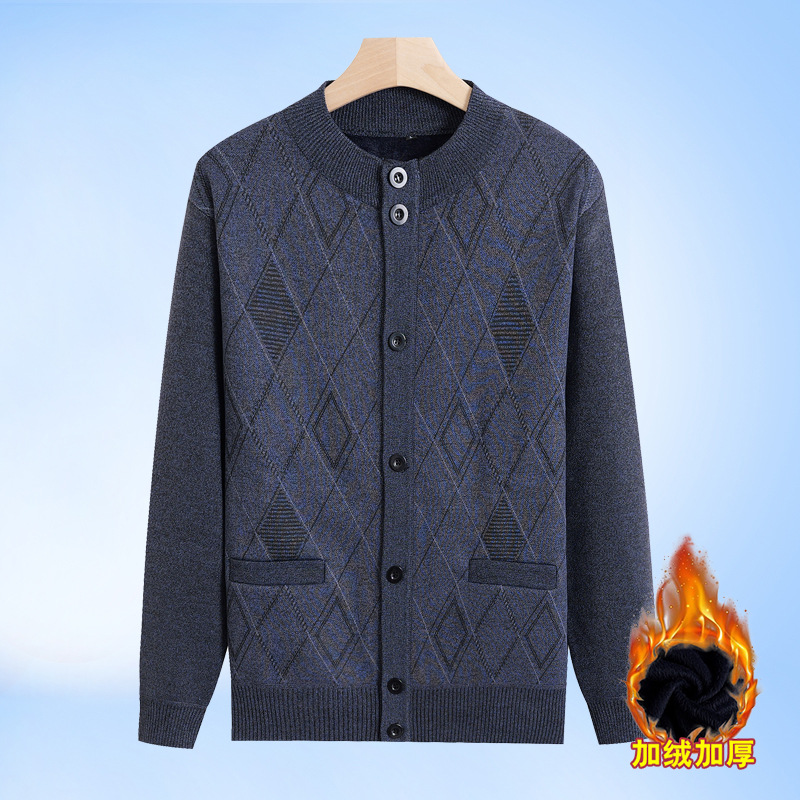 가을과 겨울 기모 두꺼운 중년 남성 니트 카디건 스웨터 재킷, 아빠를위한 수직 칼라 느슨한 니트 니트 스웨터