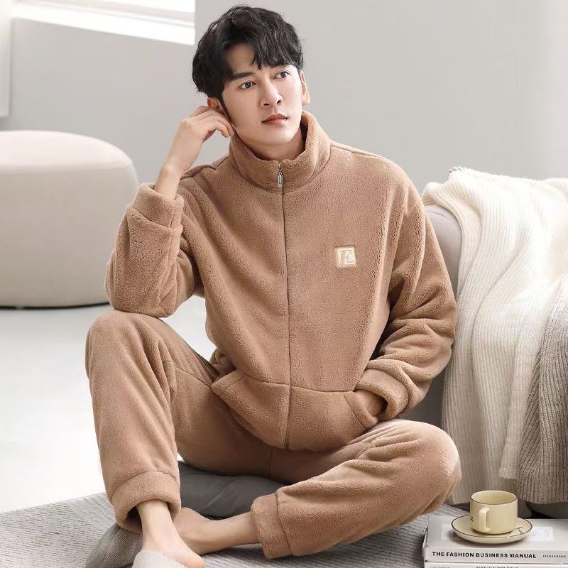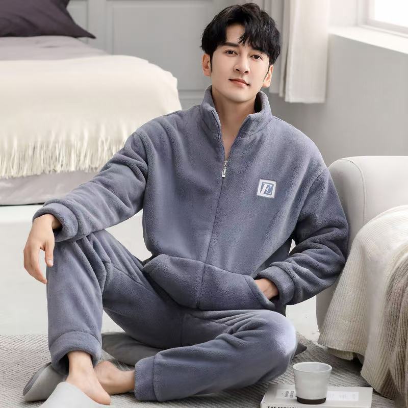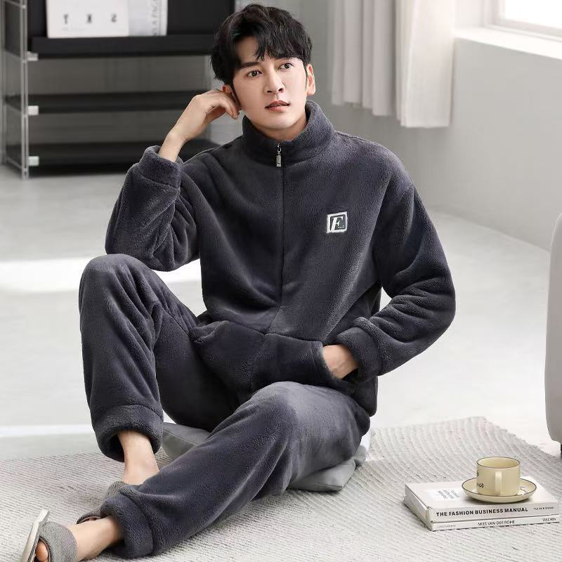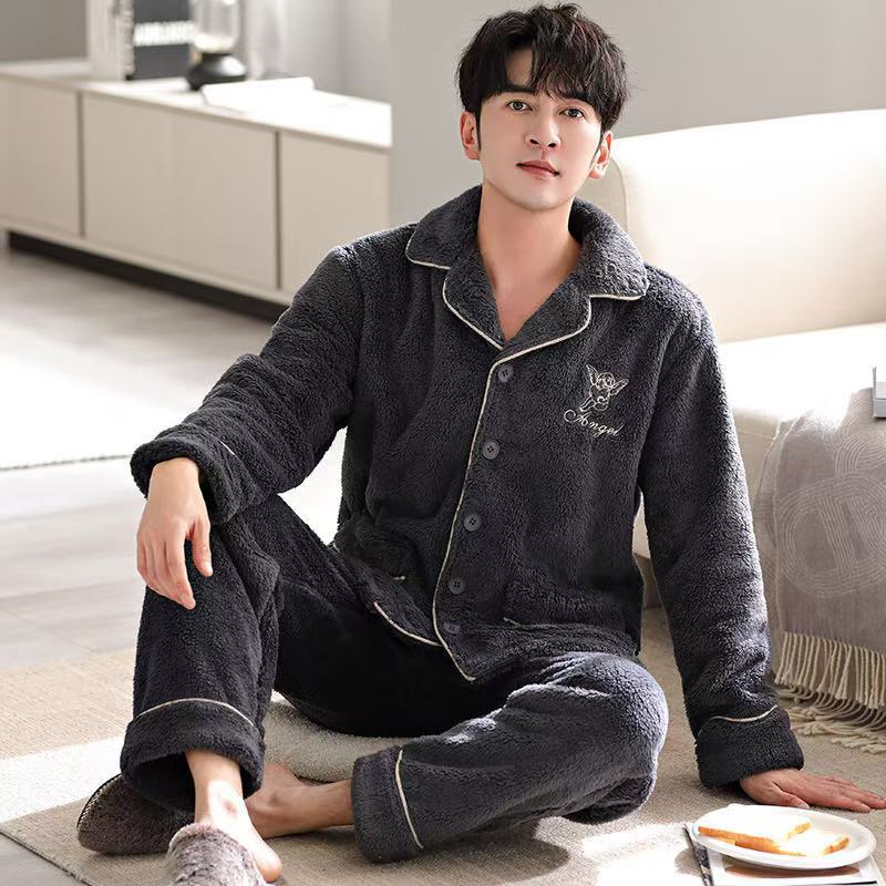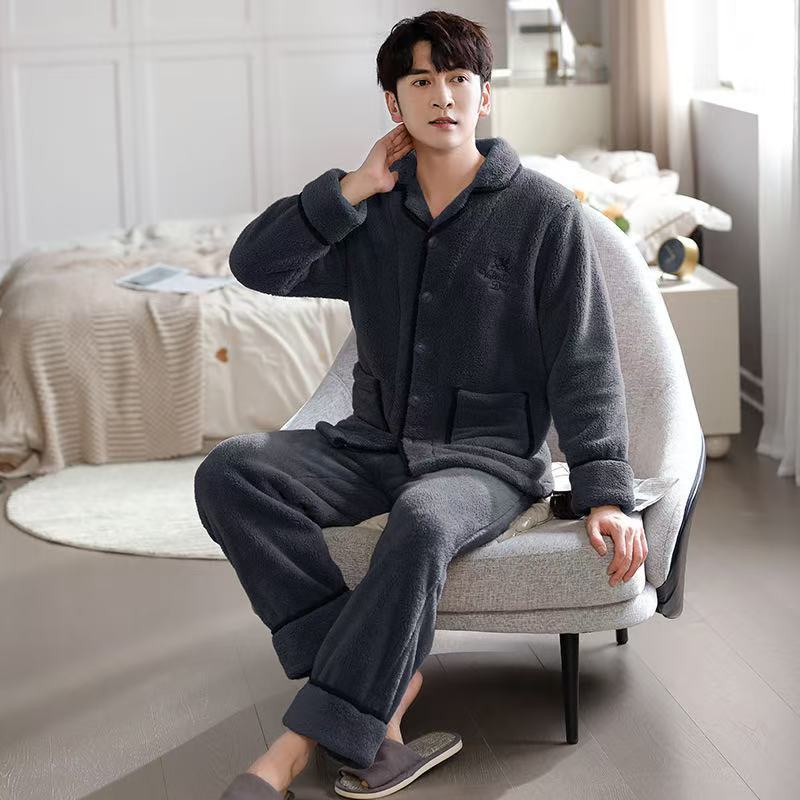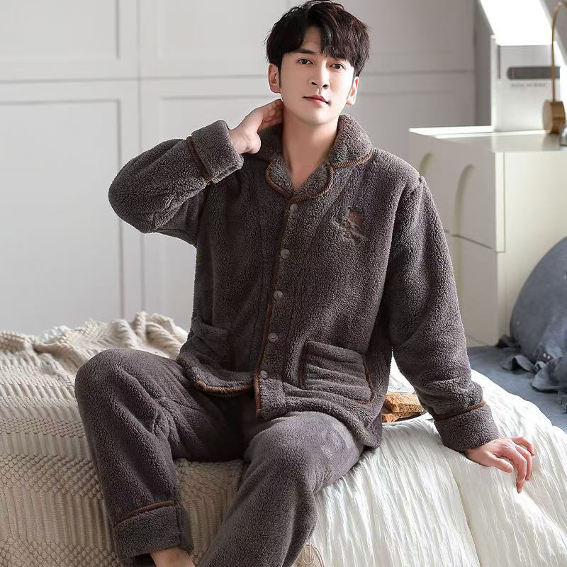 겨울 플란넬 파자마 남성 카디건 스탠드 칼라 긴 소매 따뜻한 섬 벨벳 겨울 청소년 산호 양털 집 옷스토어 가기