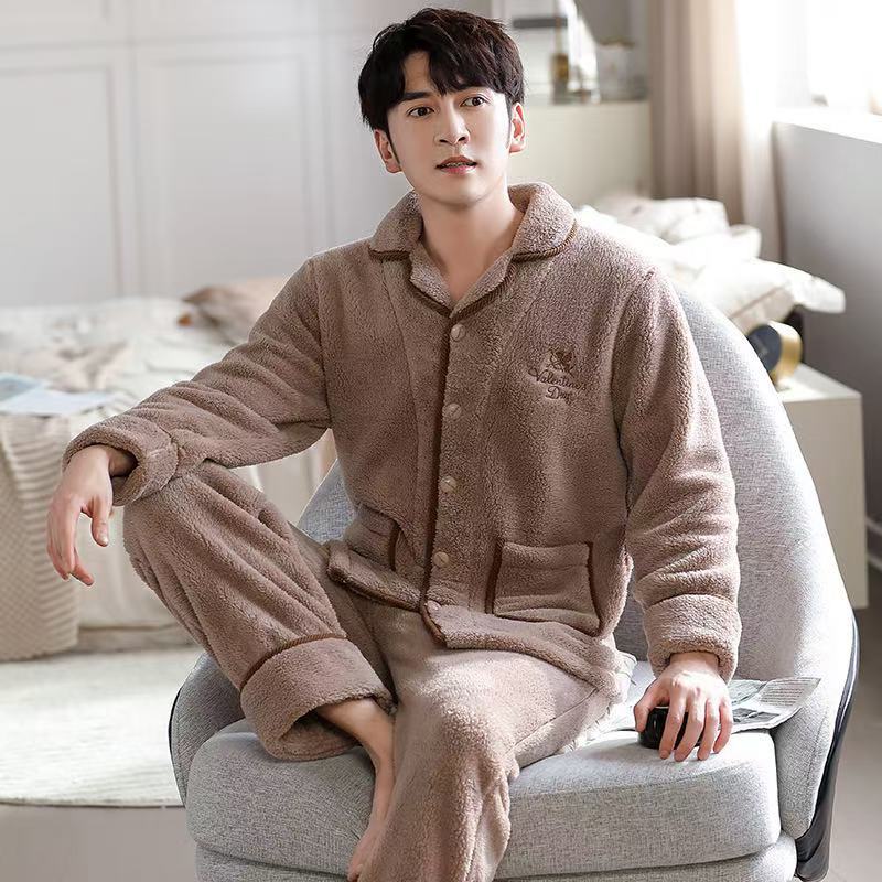 겨울 플란넬 파자마 남성 카디건 스탠드 칼라 긴 소매 따뜻한 섬 벨벳 겨울 청소년 산호 양털 집 옷