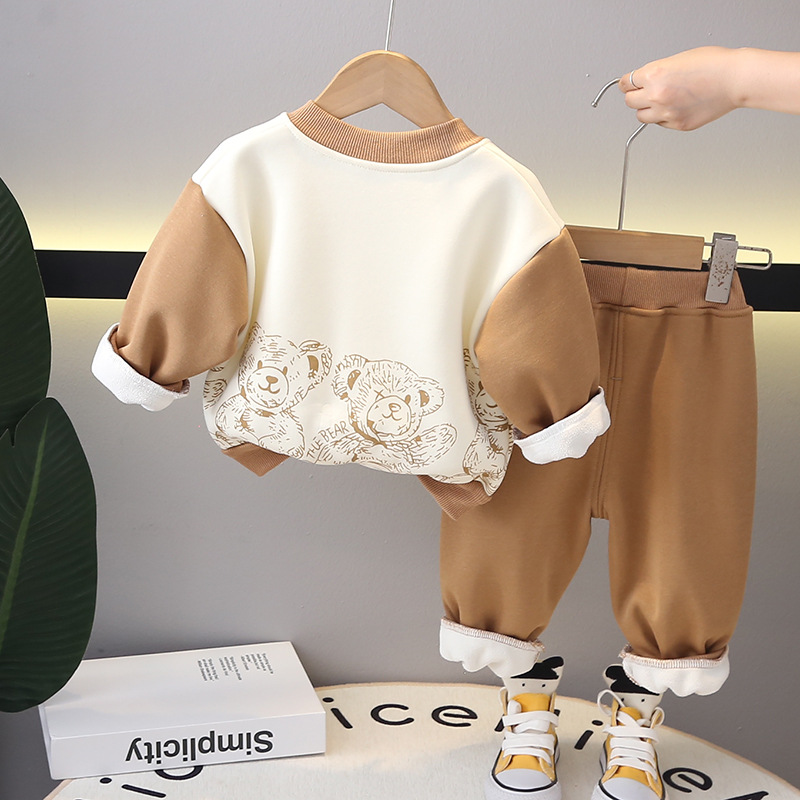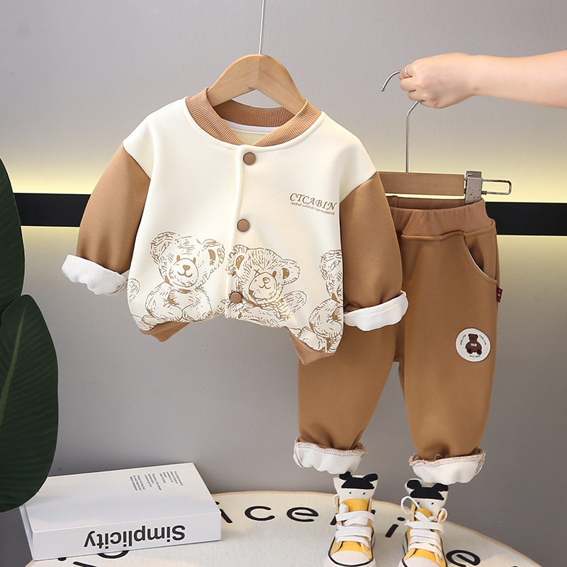 어린이 착용 소년 겨울복 세트 2024 새로운 아기 소년의 가을과 겨울 소년의 곰 기모 야구 세트 투피스 세트스토어 가기