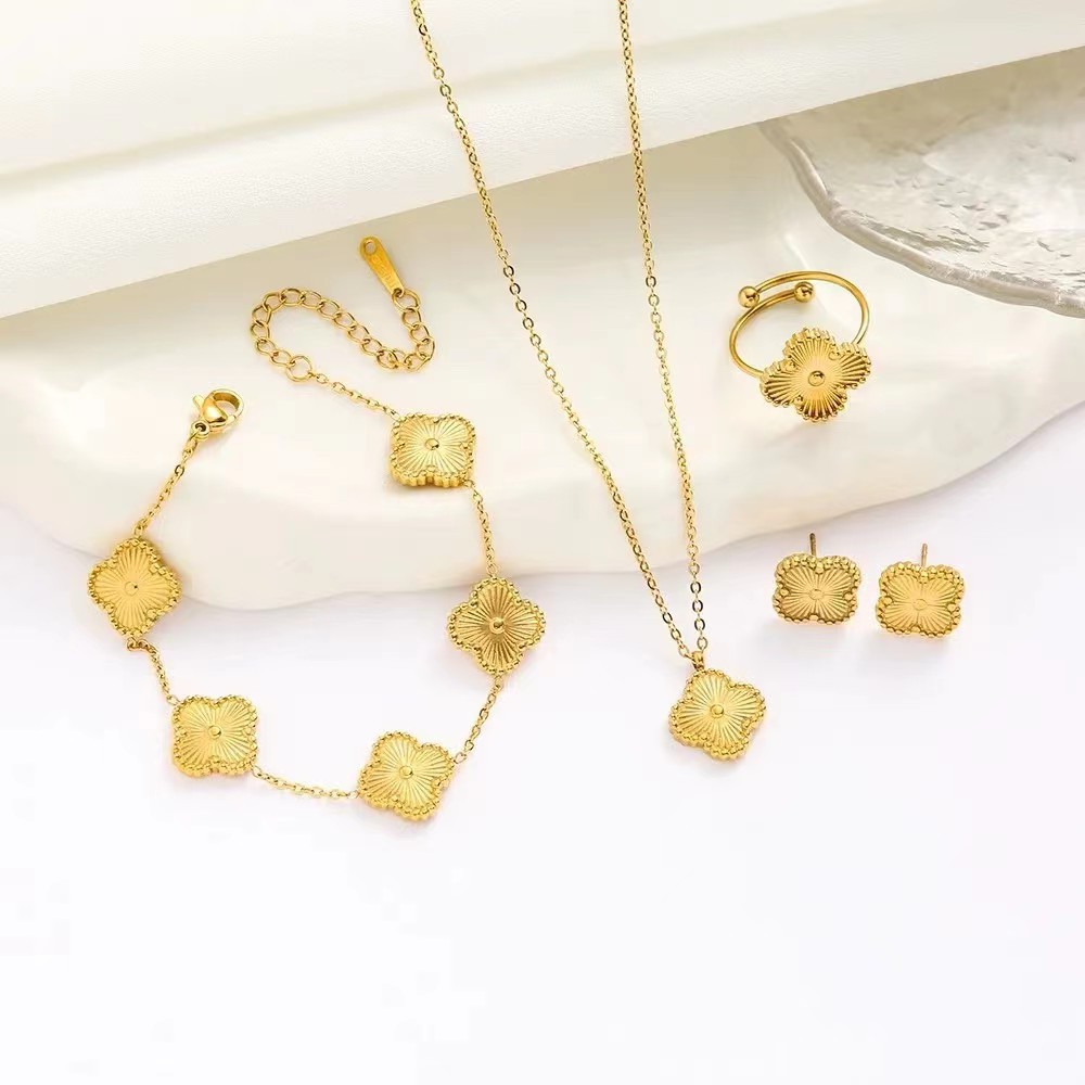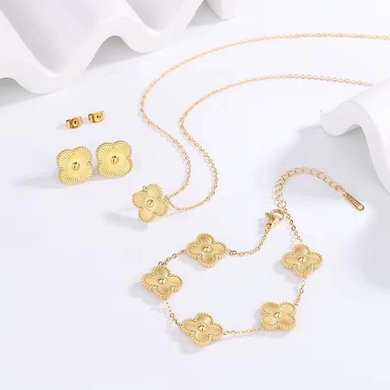 황금 4 잎 클로버 티타늄 스틸 목걸이 팔찌 귀걸이 세트 여성 도매 가벼운 럭셔리 보석 쇄골 체인 액세서리
