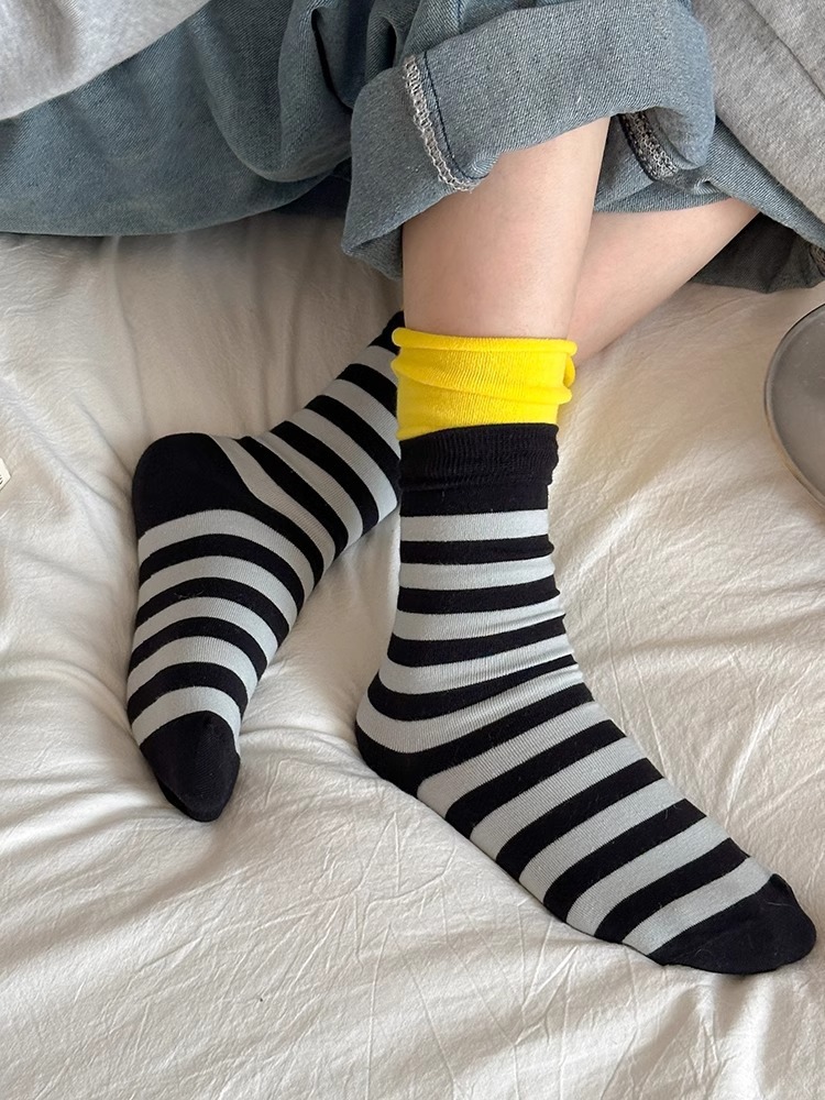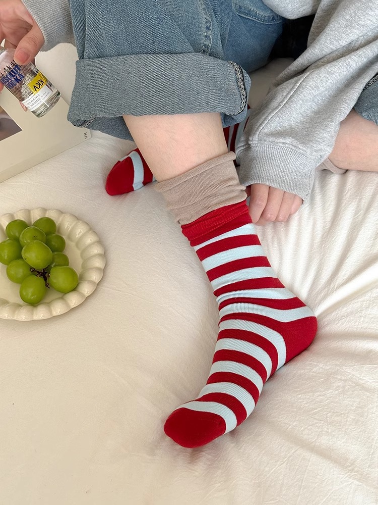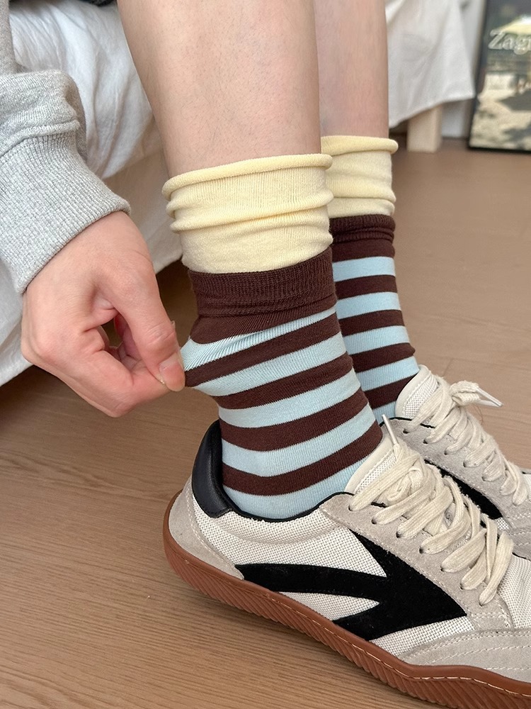 도파민 명암 컬러 스트라이프 더블 레이어 양말 컬 입 스택 양말 어린이를위한 봄 및 가을 단색 일본 스포츠 미드 바디 양말스토어 가기