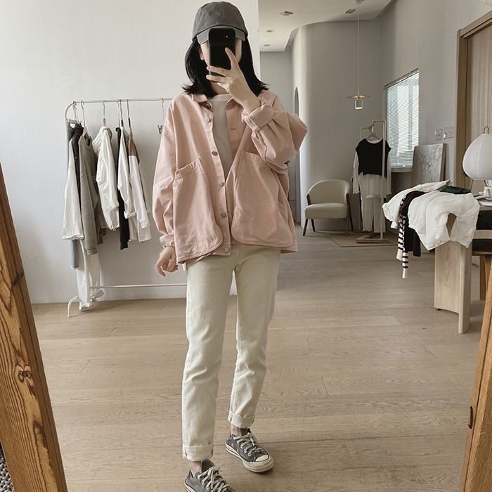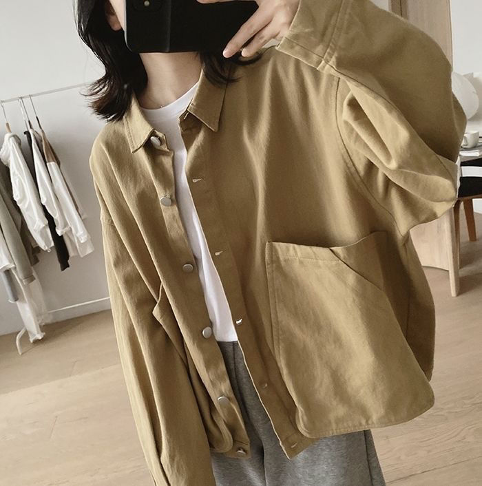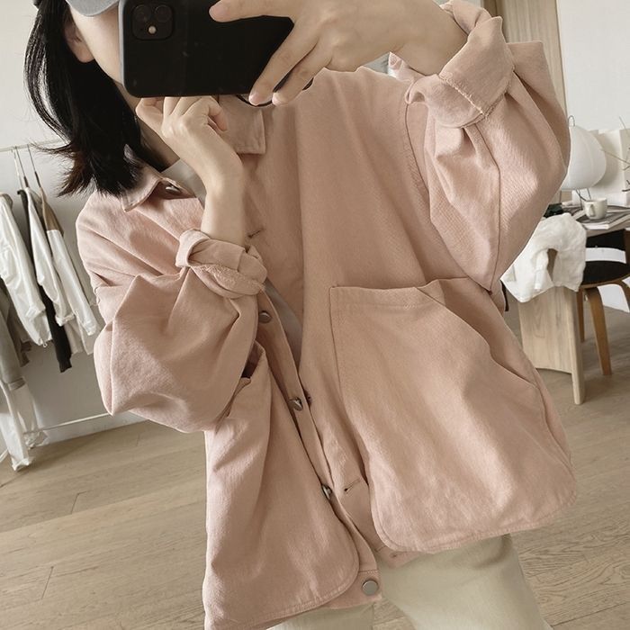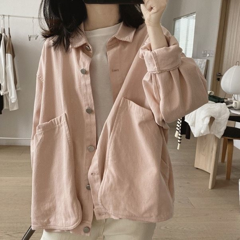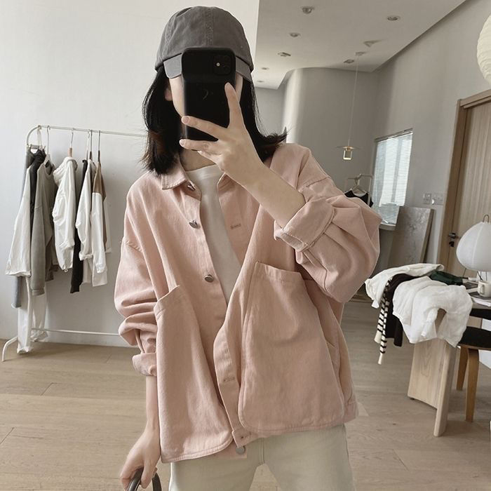 봄과 가을 새로운 느슨한 작업 코트 여성 플러스 사이즈 슬리밍 틈새 디자인 레트로 대형 포켓 솔리드 컬러 탑
